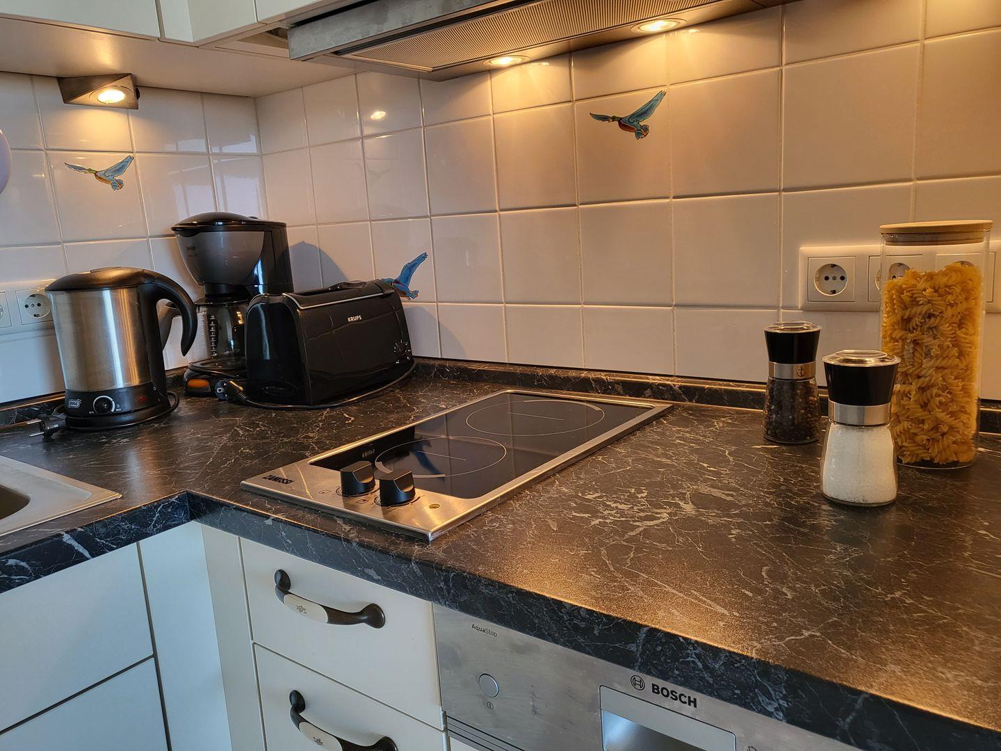 Die moderne Einbauküche der Ferienwohnung ist gut ausgestattet. Sie verfügt unter anderem über ein kompaktes Ceran-Kochfeld nebst Backofen sowie Kühlschrank mit Gefrierfach und Kaffeemaschine.