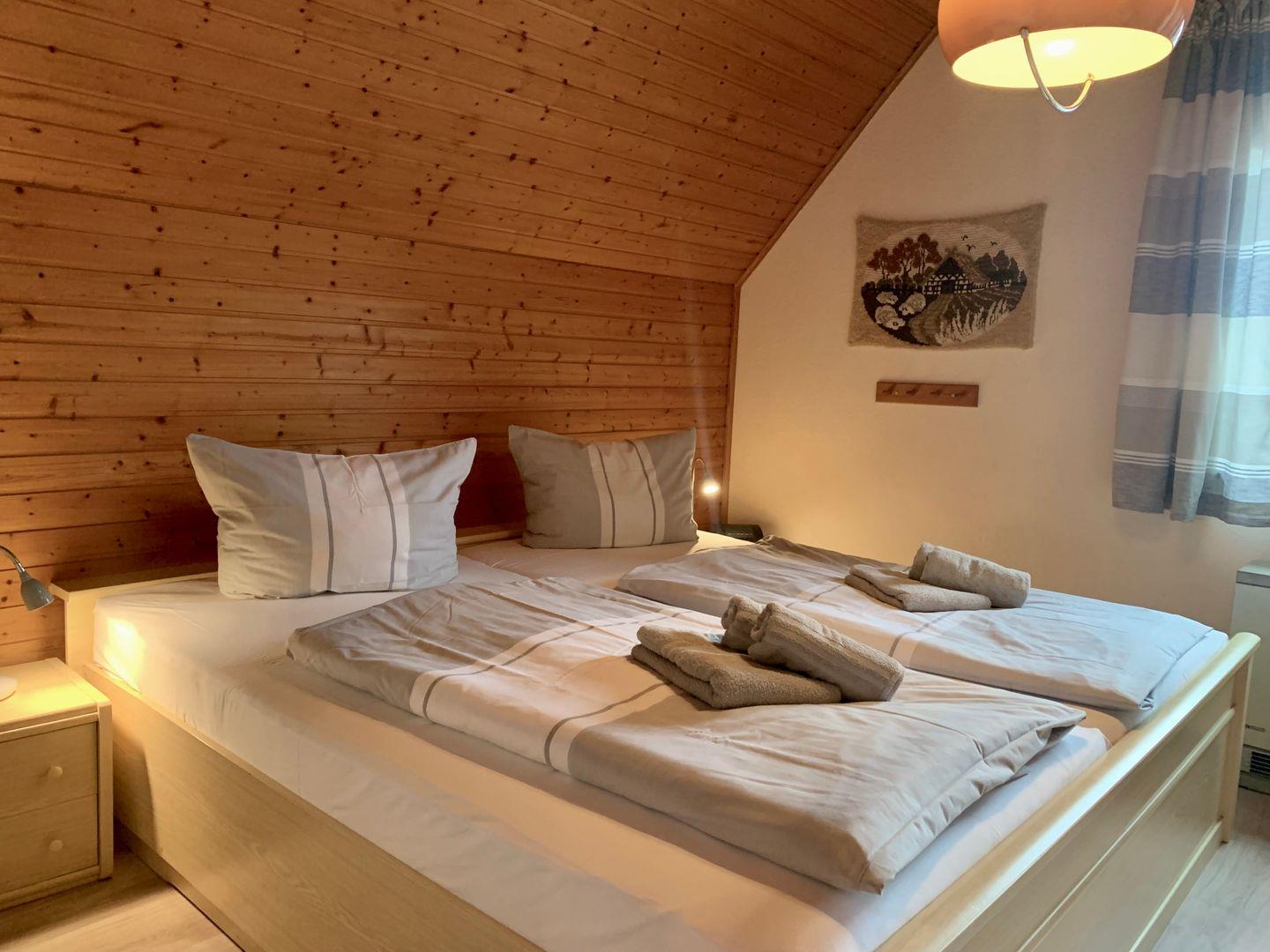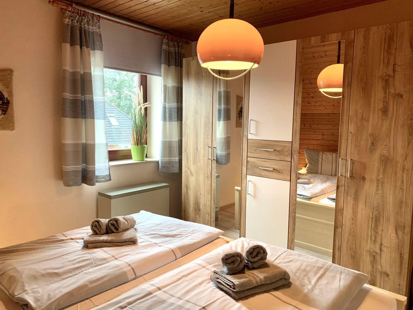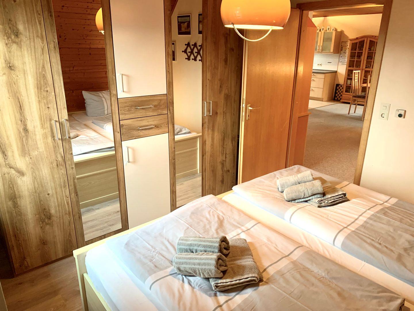 Zur Ferienwohnung gehören zwei komfortable Schlafzimmer. Das Elternschlafzimmer ist ausgestattet mit einem 200x200cm Doppelbett, Verdunklungsmöglichkeiten und Kleiderschrank.