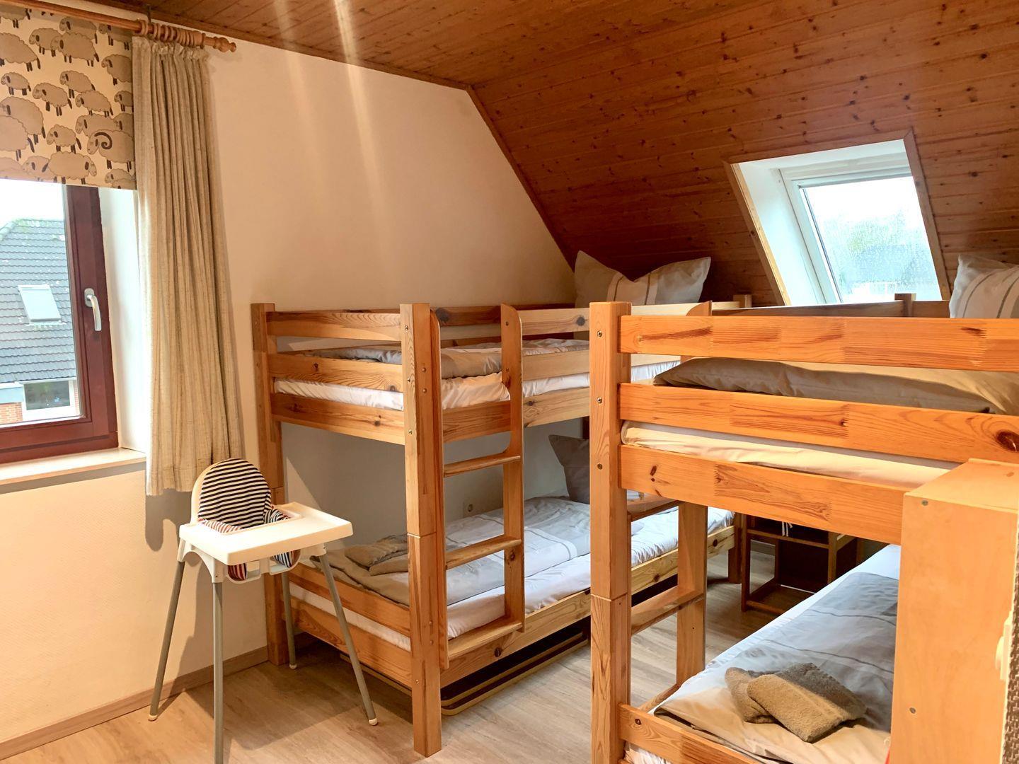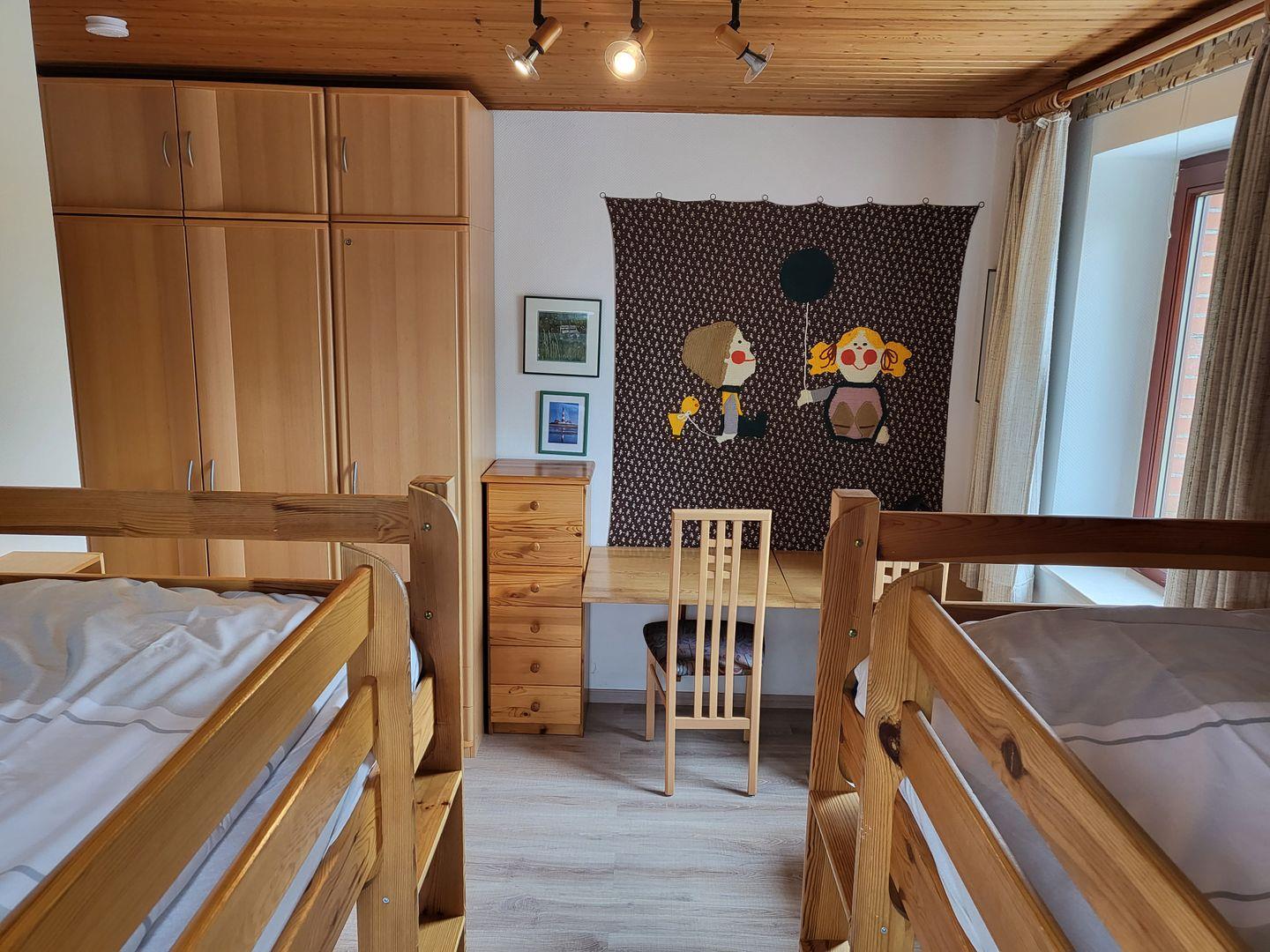 Das zweite Schlafzimmer mit zwei 0,90x200cm Etagenbetten, die auch wunderbar von Erwachsenen genutzt werden können. Die Ferienwohnung verfügt über Duschbad und WC.