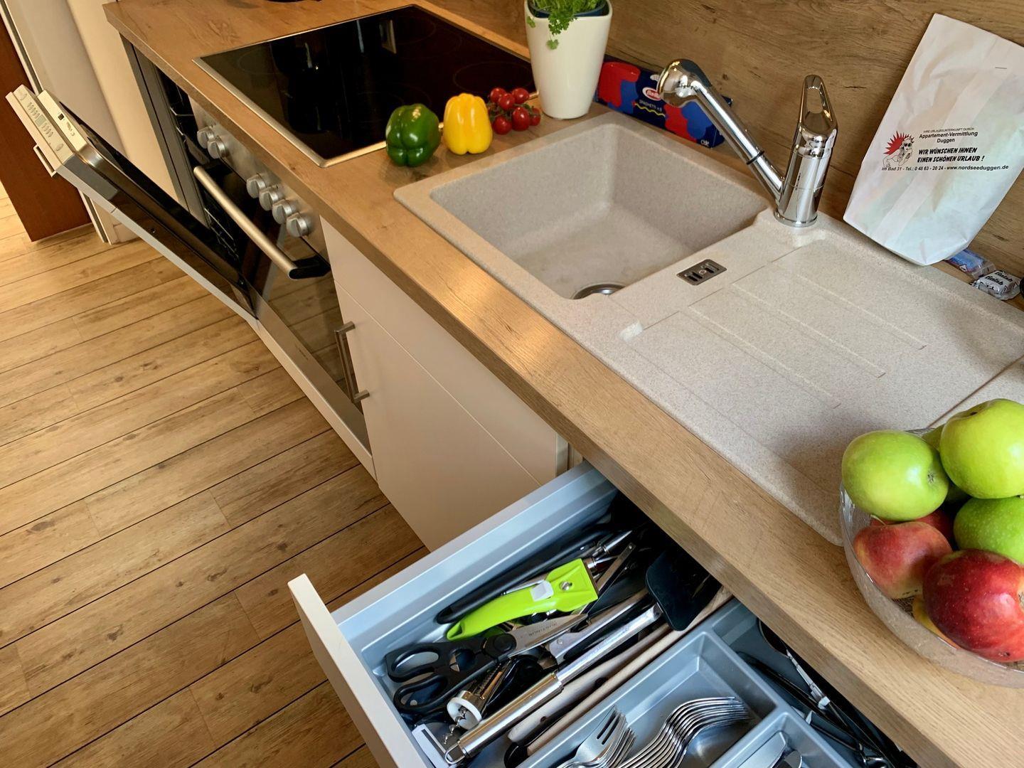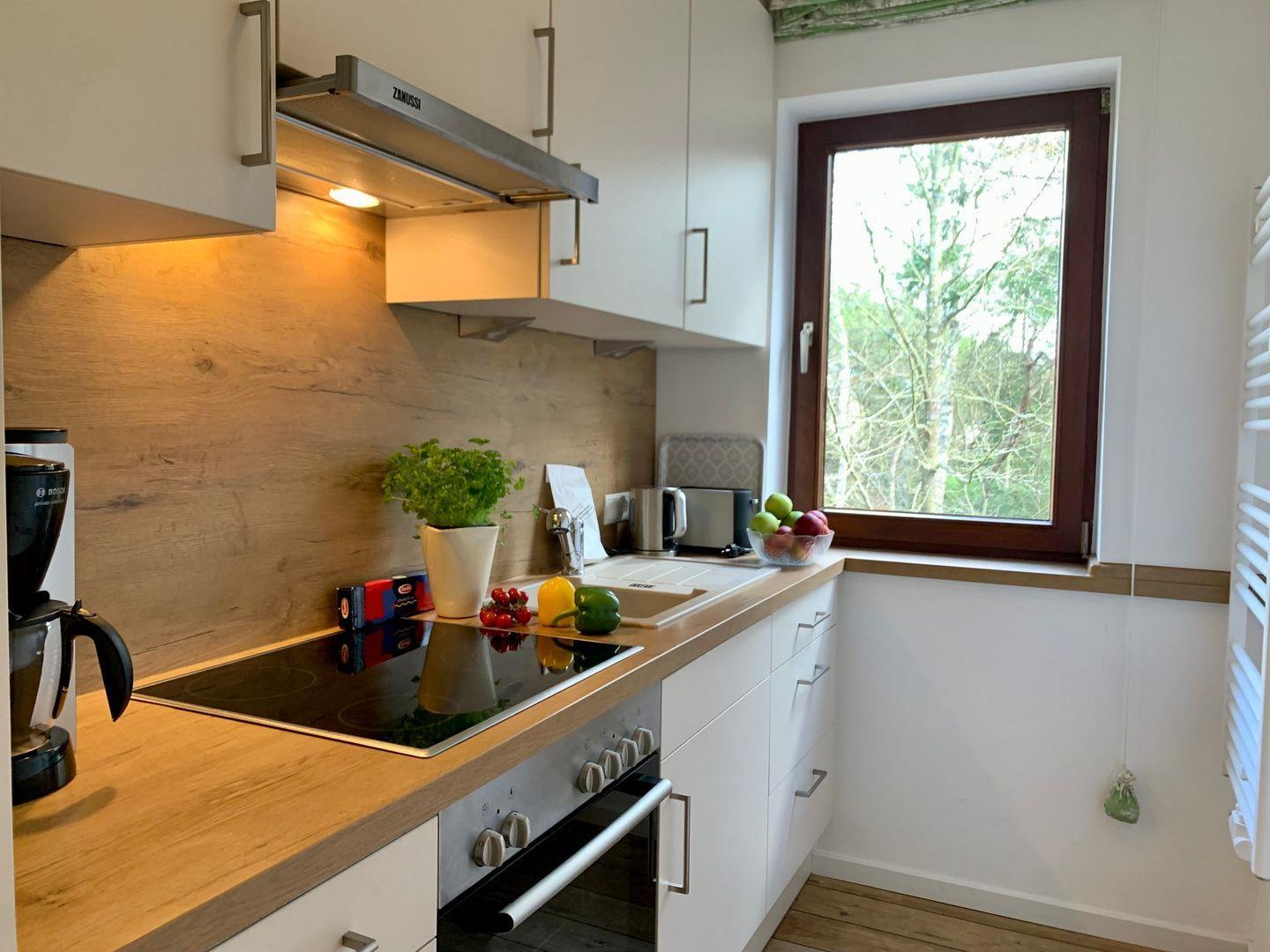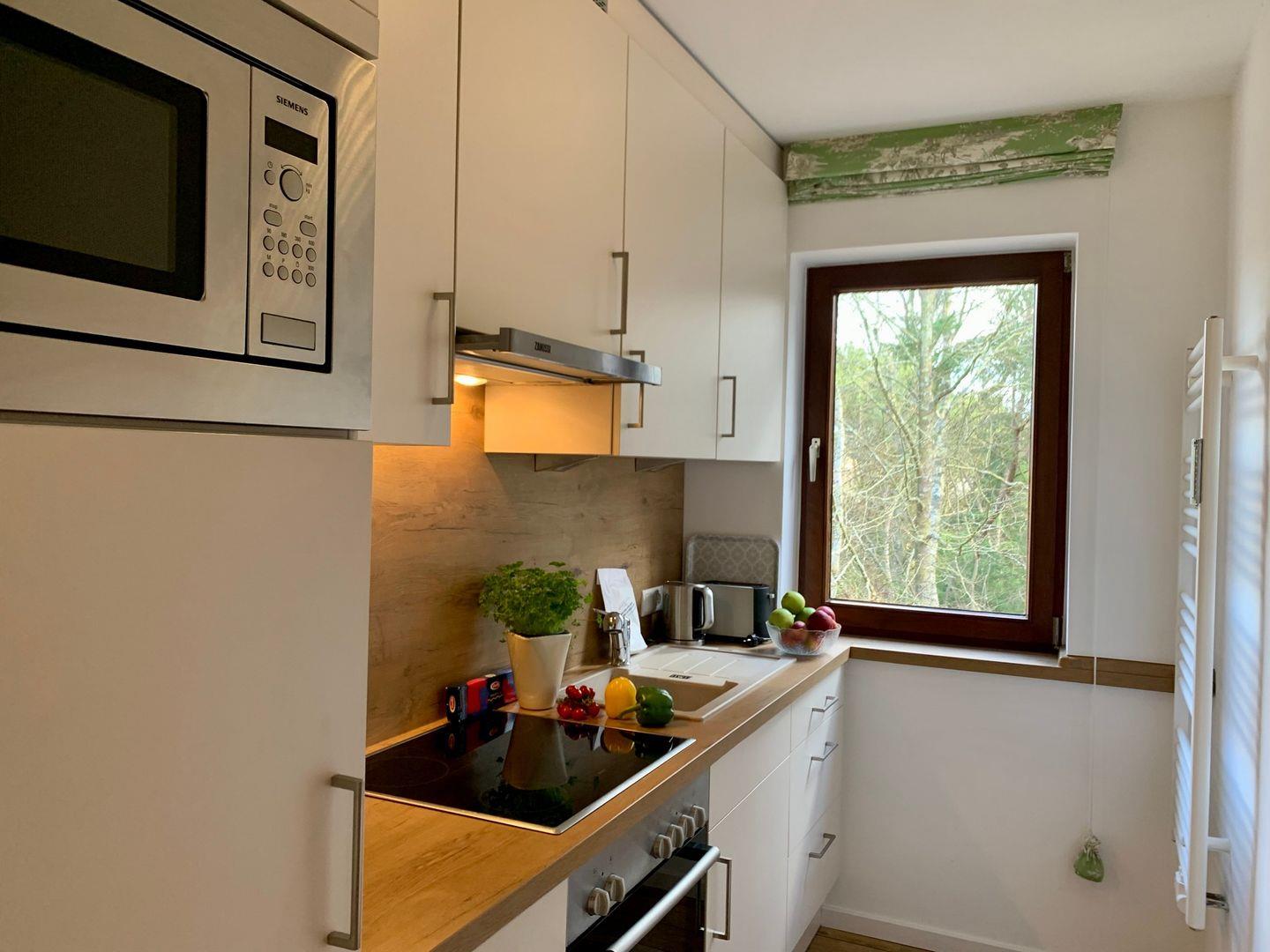 Die separate Küche ist sehr gut ausgestattet und verfügt unter anderem über Cerankochfeld und Backofen, einen Kühlschrank mit Gefrierfach sowie Geschirrspüler, Kaffeemaschine und Mikrowelle.