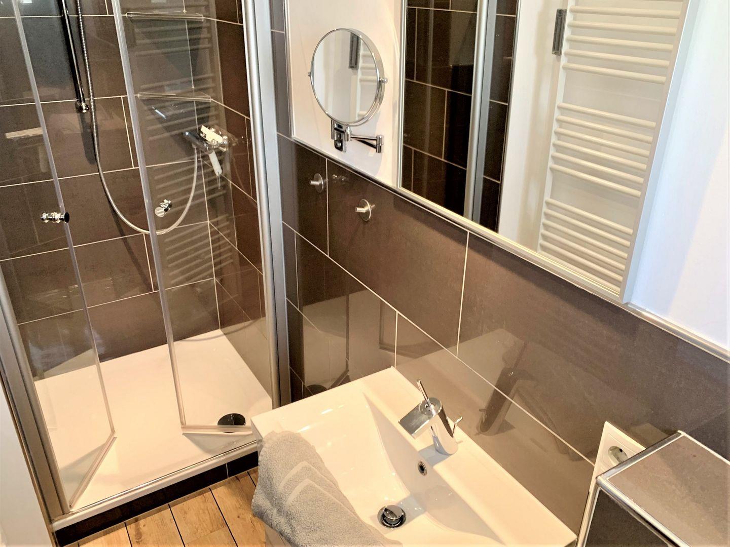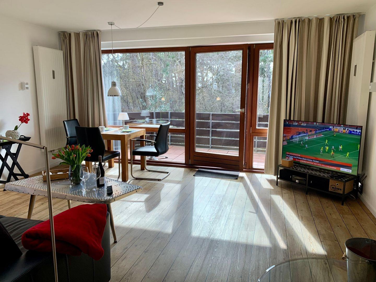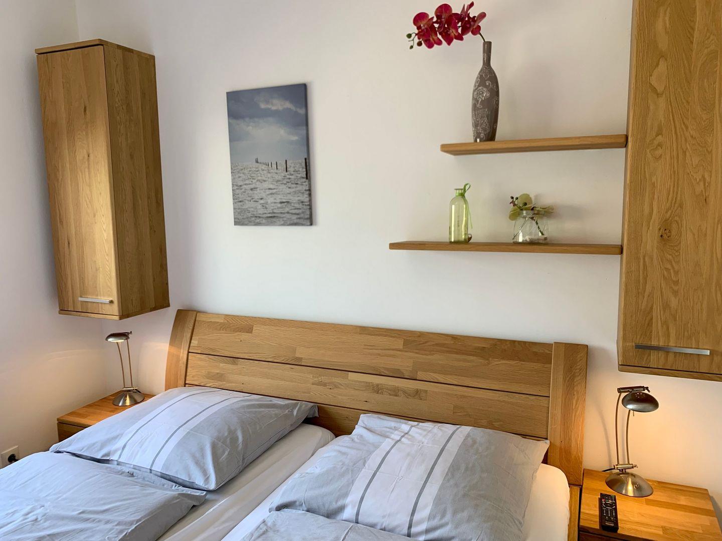 Das separate Schlafzimmer ist ausgestattet mit großem 180x200cm Doppelbett und verfügt über einen weiteren Smart-TV. Zur Ferienwohnung gehört ein Duschbad mit WC, eine Fußbodenheizung ist vorhanden.
