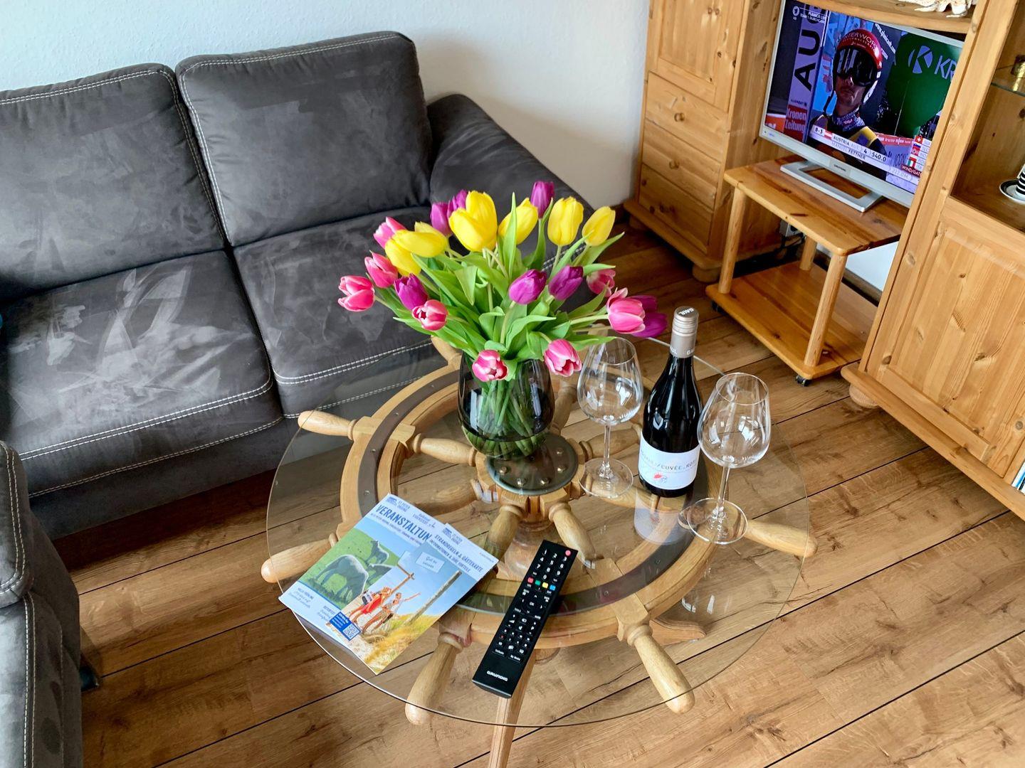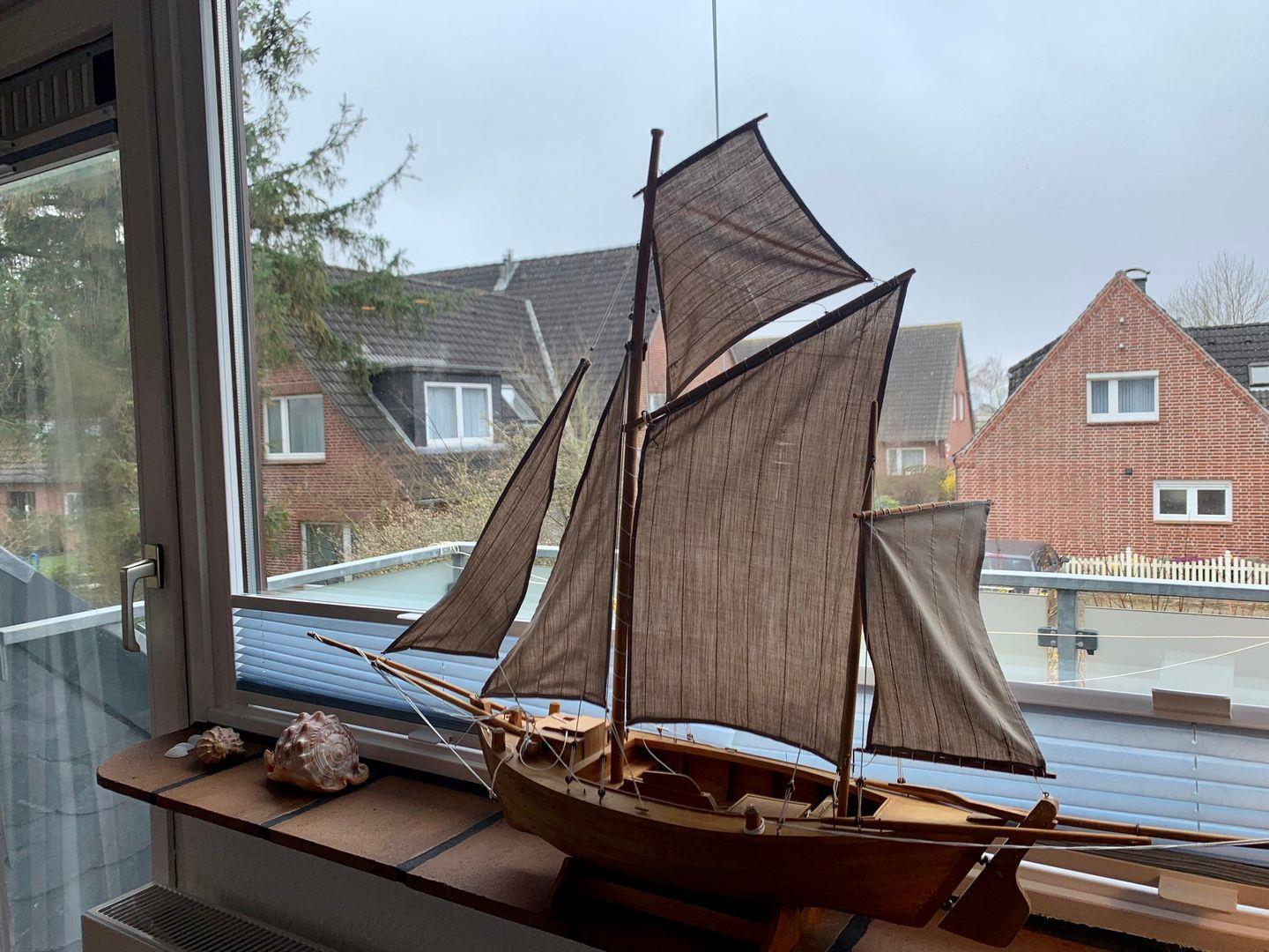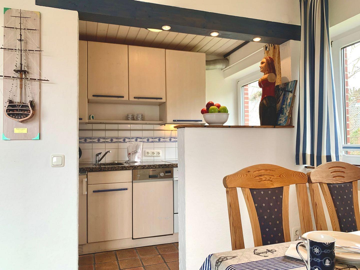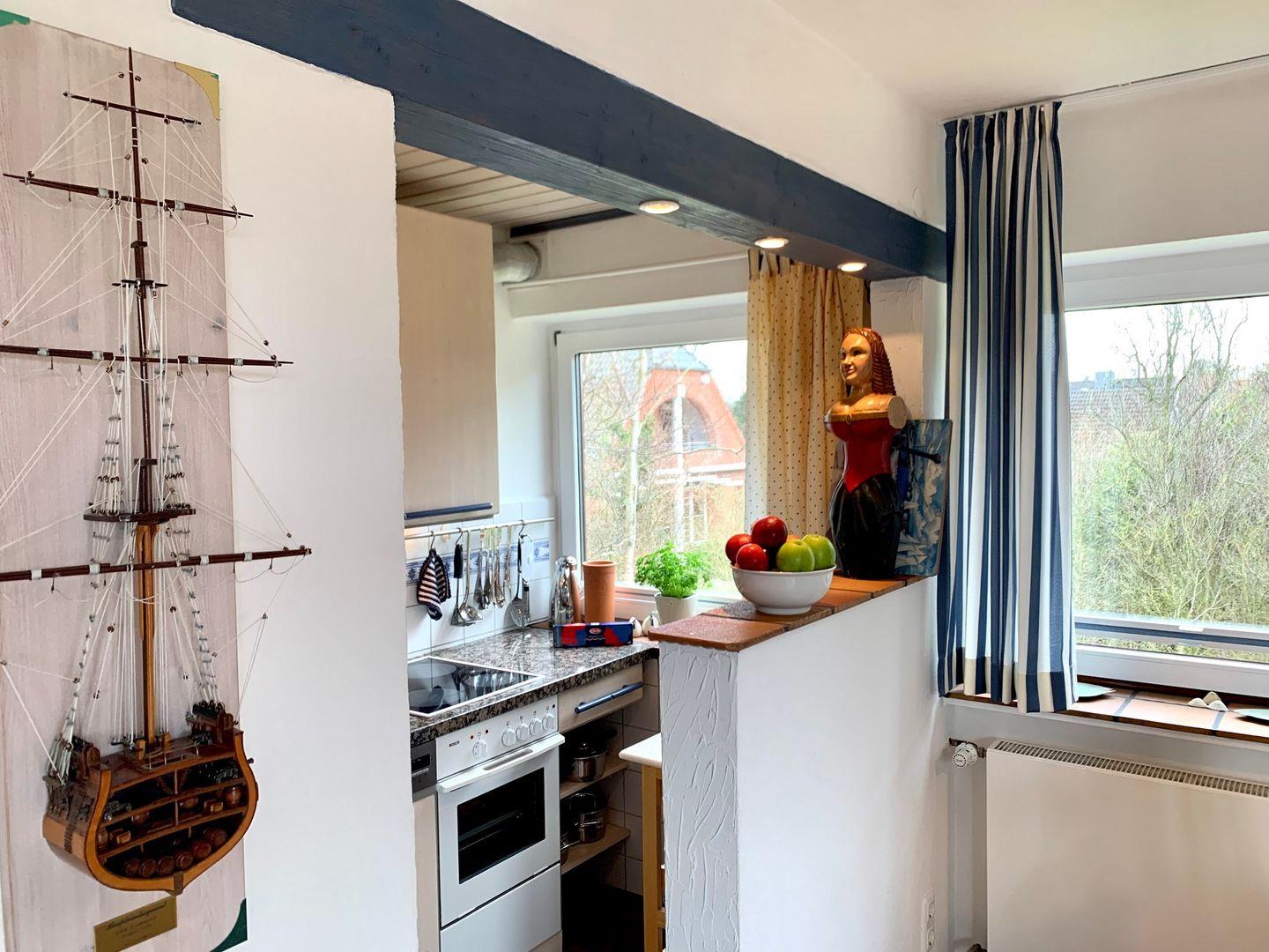 Das einladend eingerichtete Wohnzimmer ist ausgestattet mit einer komfortablen Sitzecke, bestehend aus Sofa, Sessel und einem Tisch, der als Steuerrad schon die Weltmeere bereist hat. Für Unterhaltung sorgen Flachbild-TV, Radio sowie Brettspiele für gemütliche Abende und eine Auswahl an Büchern. Die angrenzende Küchenzeile ist mit einer hüfthohen Trennwand vom Wohnraum separiert. Sie ist sehr gut ausgestattet und verfügt unter anderem über Cerankochfeld und Backofen sowie Kühlschrank, Geschirrspüler und Kaffeemaschine. Das große Schlafzimmer der Ferienwohnung ist ausgestattet mit einem 180x200cm Doppelbett und einem geräumigen Kleiderschrank. Zur Ferienwohnung gehören Duschbad und WC, die Regendusche ist bodengleich angelegt.