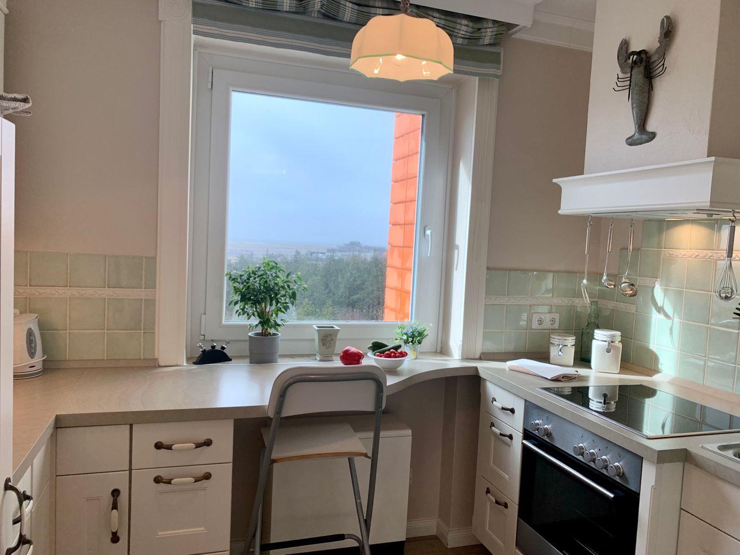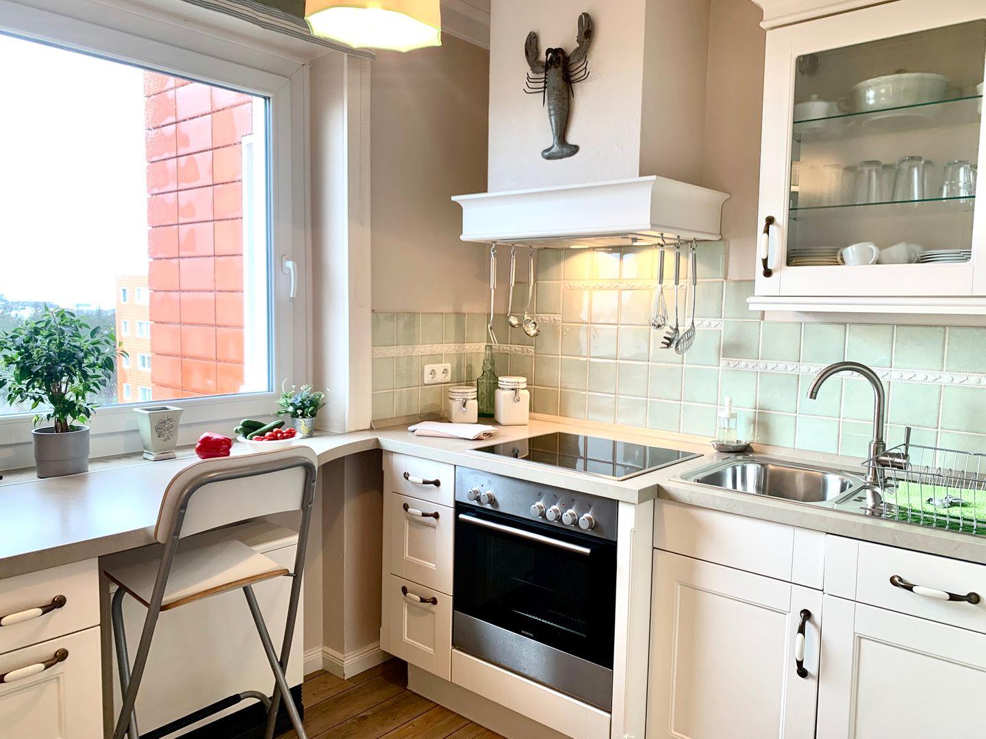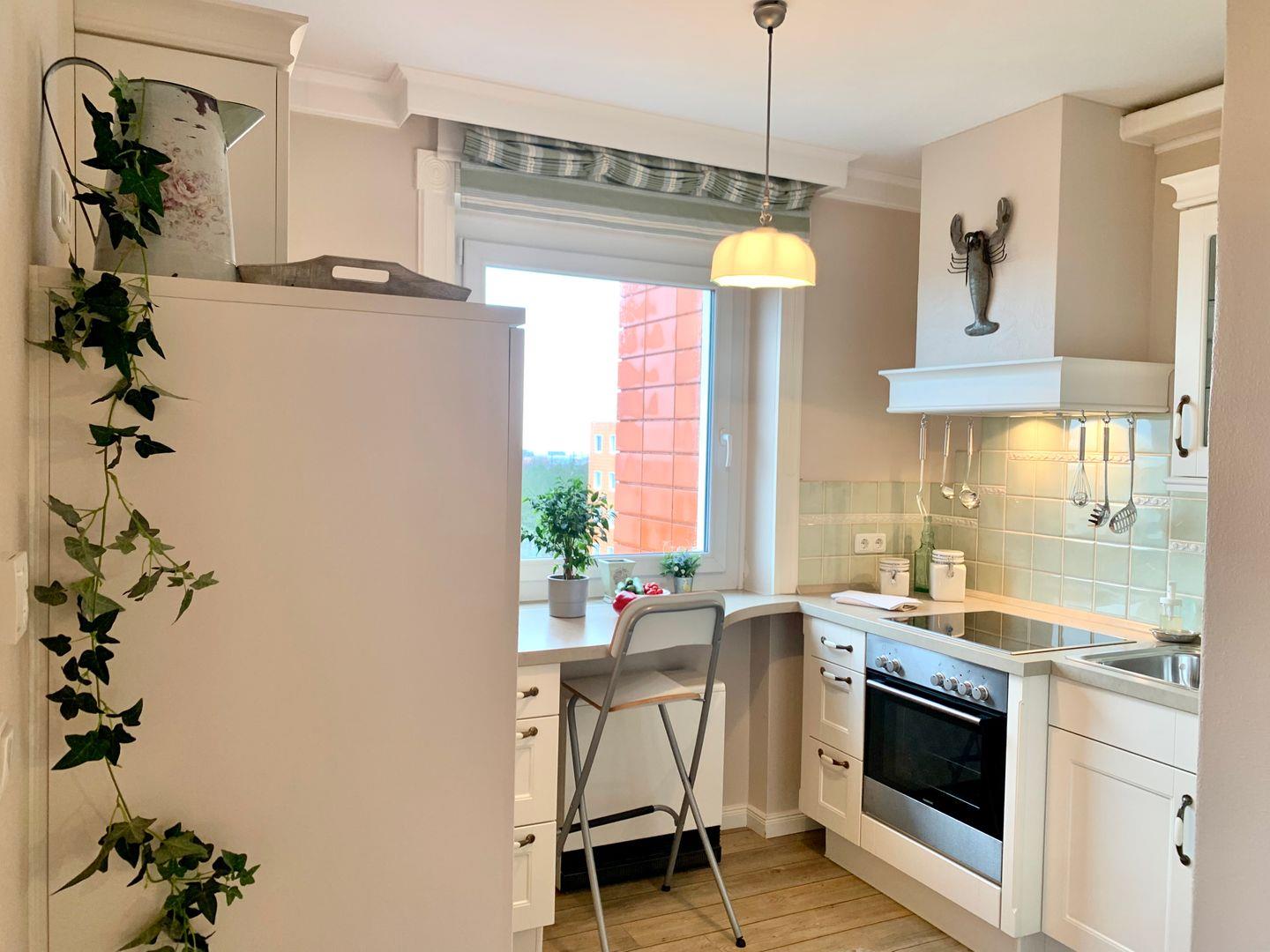 Die angrenzende Küche ist mit einer hochwertigen Küchenzeile versehen, hier gehören unter anderem Cerankochfeld und Backofen sowie Kühlschrank mit Gefrierfach sowie Geschirrspüler und Kaffeemaschine zur Ausstattung. Zur Ferienwohnung gehört ein Dushcbad mit WC.