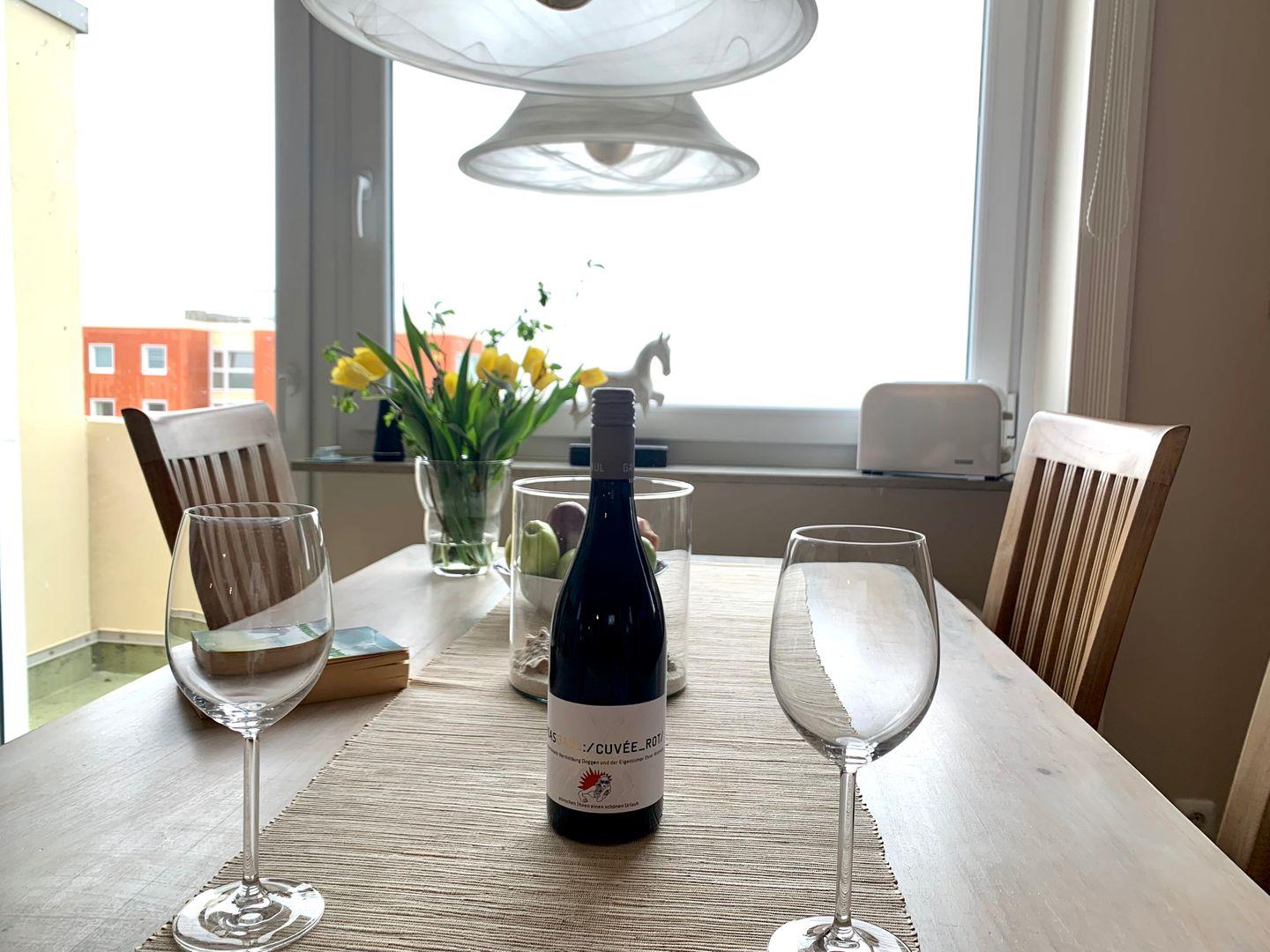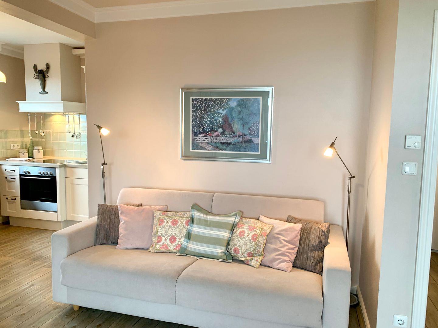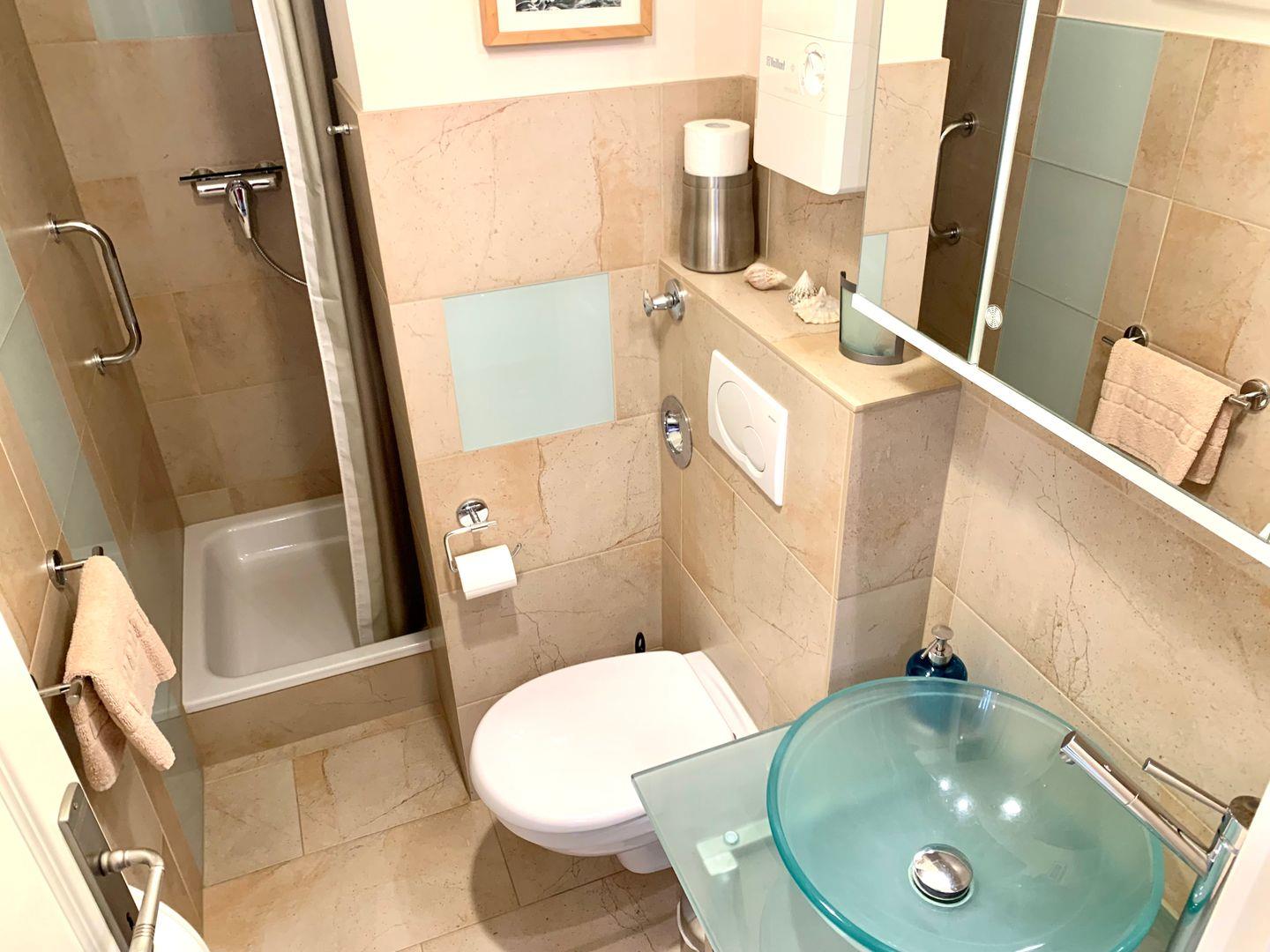 Die angrenzende Küche ist mit einer hochwertigen Küchenzeile versehen, hier gehören unter anderem Cerankochfeld und Backofen sowie Kühlschrank mit Gefrierfach sowie Geschirrspüler und Kaffeemaschine zur Ausstattung. Zur Ferienwohnung gehört ein Dushcbad mit WC.