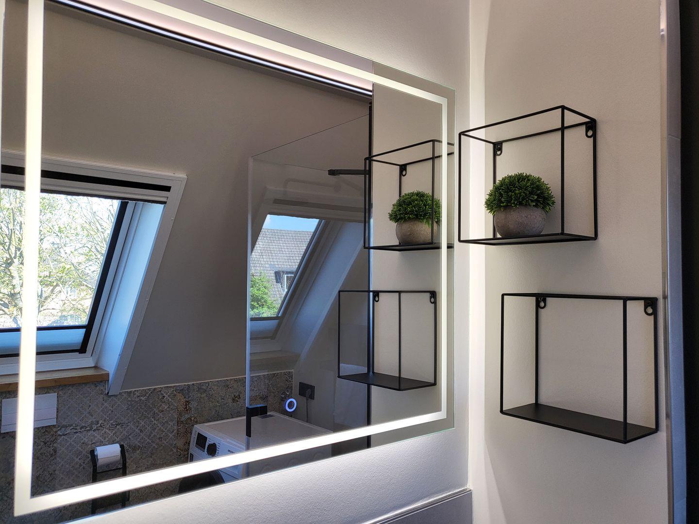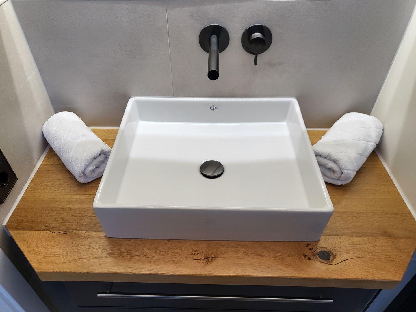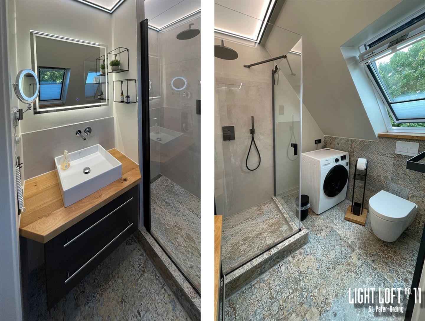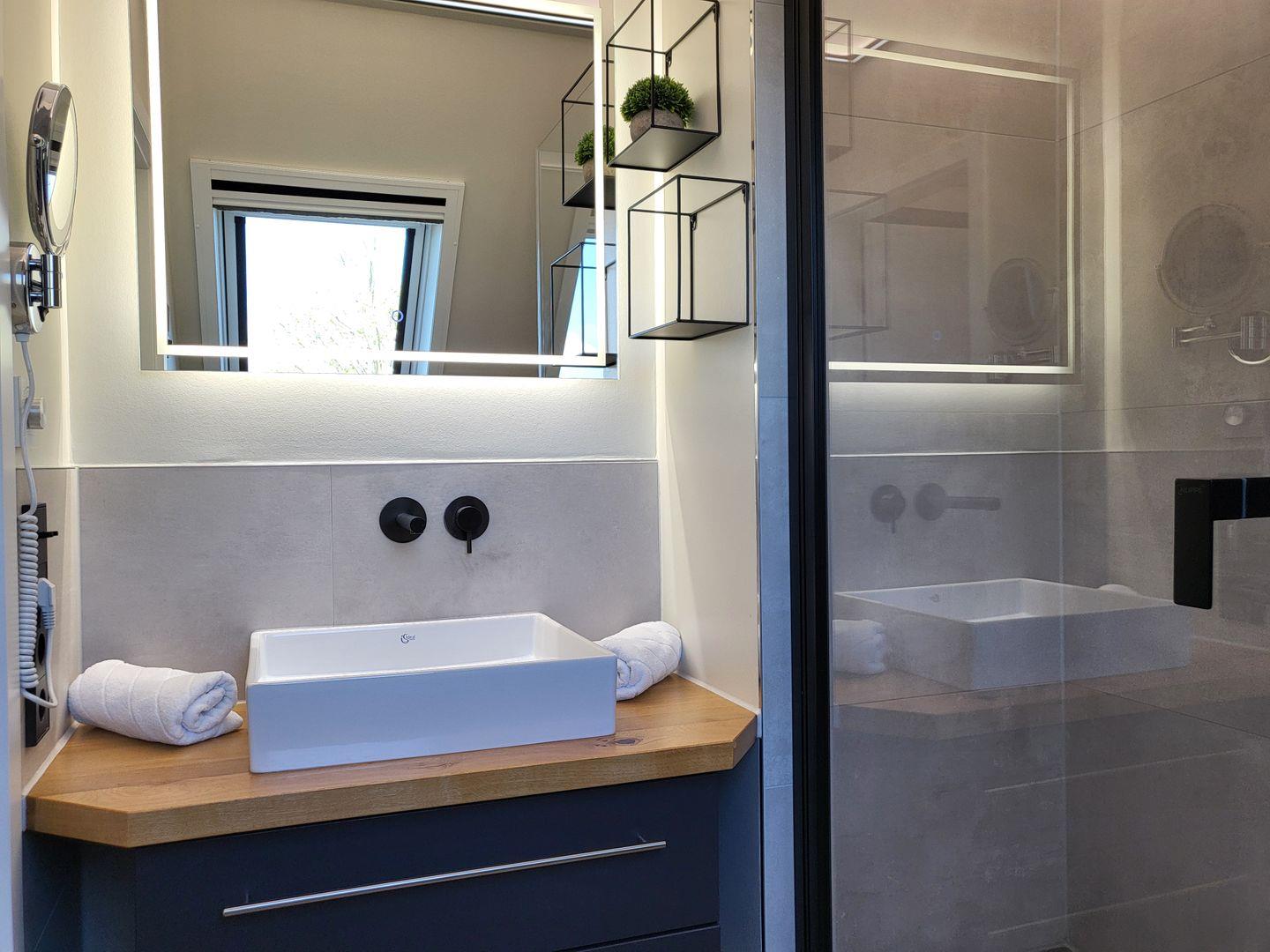 Das moderne, geräumige Badezimmer ist sehr hochwertig eingerichtet – besonders die edle Regendusche fällt neben dem ansprechenden Design des Raumes ins Auge.