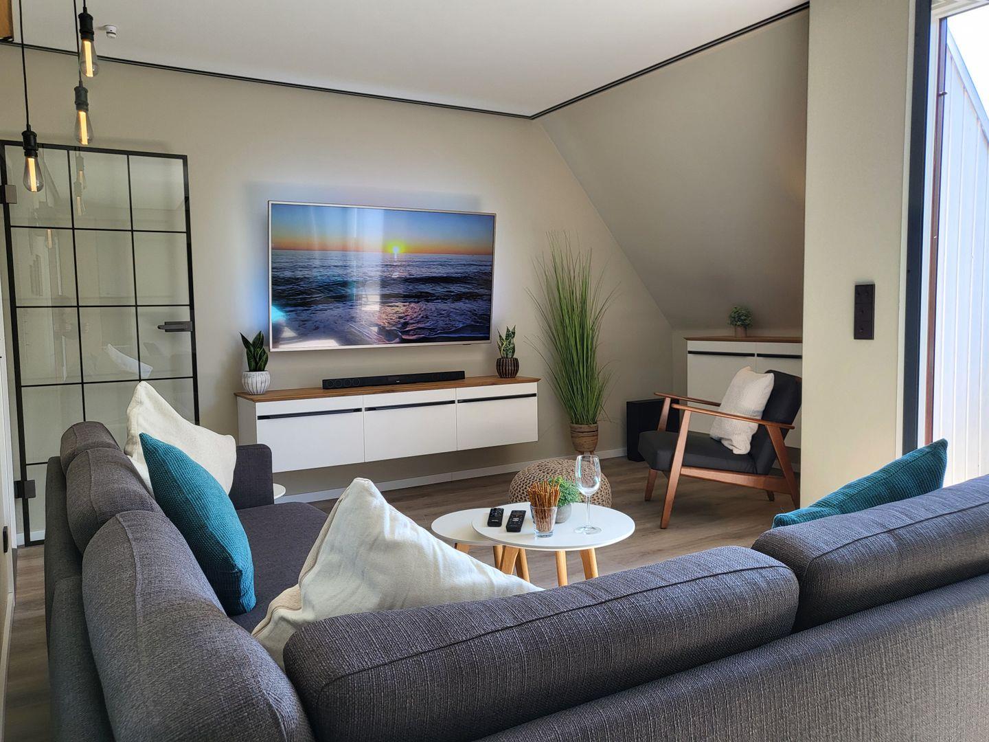 Sitzecke mit sehr großem Smart-TV, Küche, Duschbad mit WC, ein separates Schlafzimmer mit