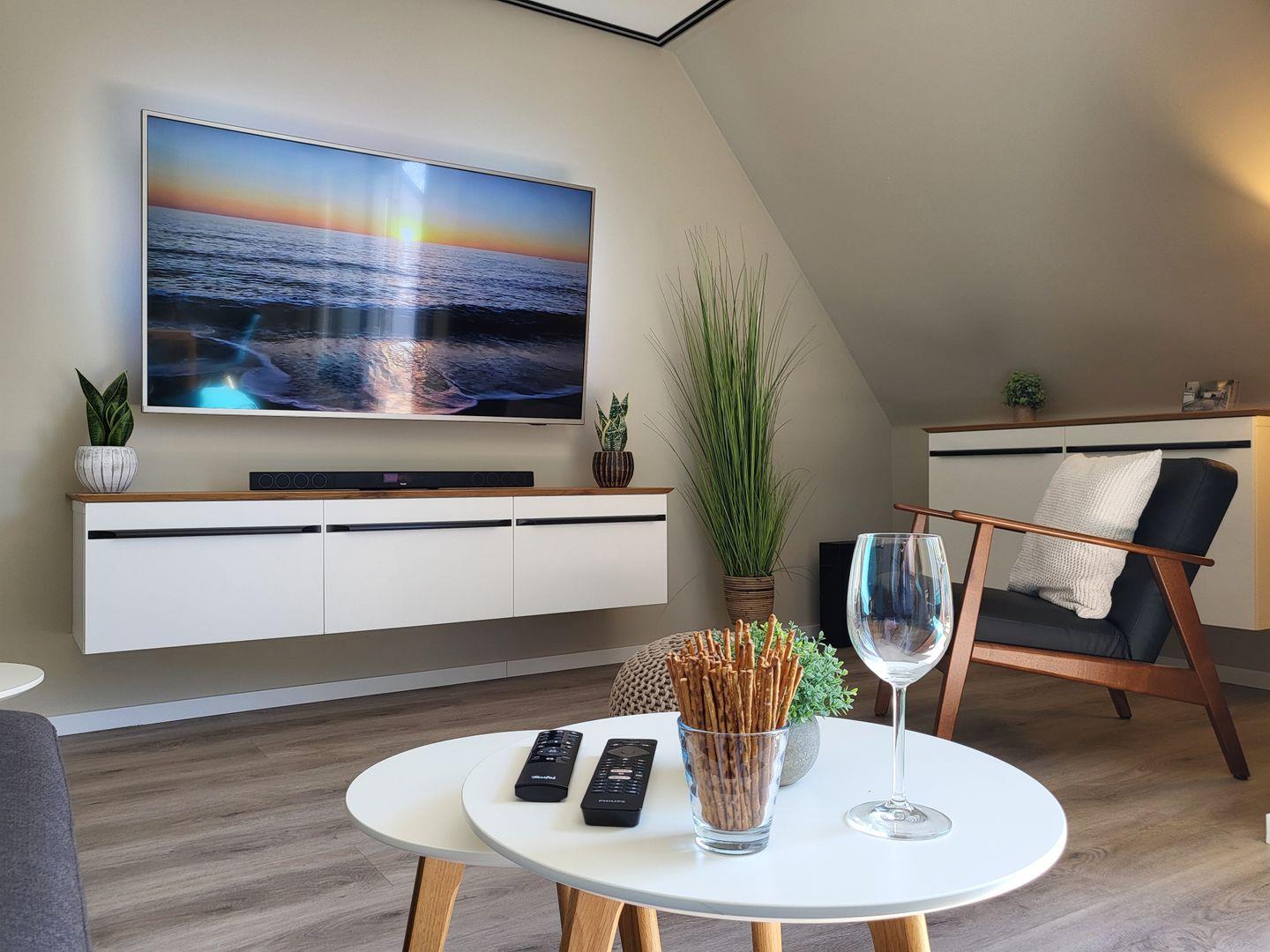 Der Blick schweift auf den großen LCD-TV, der zusammen mit der hochwertigen Bluetooth-Soundbar und dem kostenfreiem W-LAN für schier unendliche Möglichkeiten sorgt.