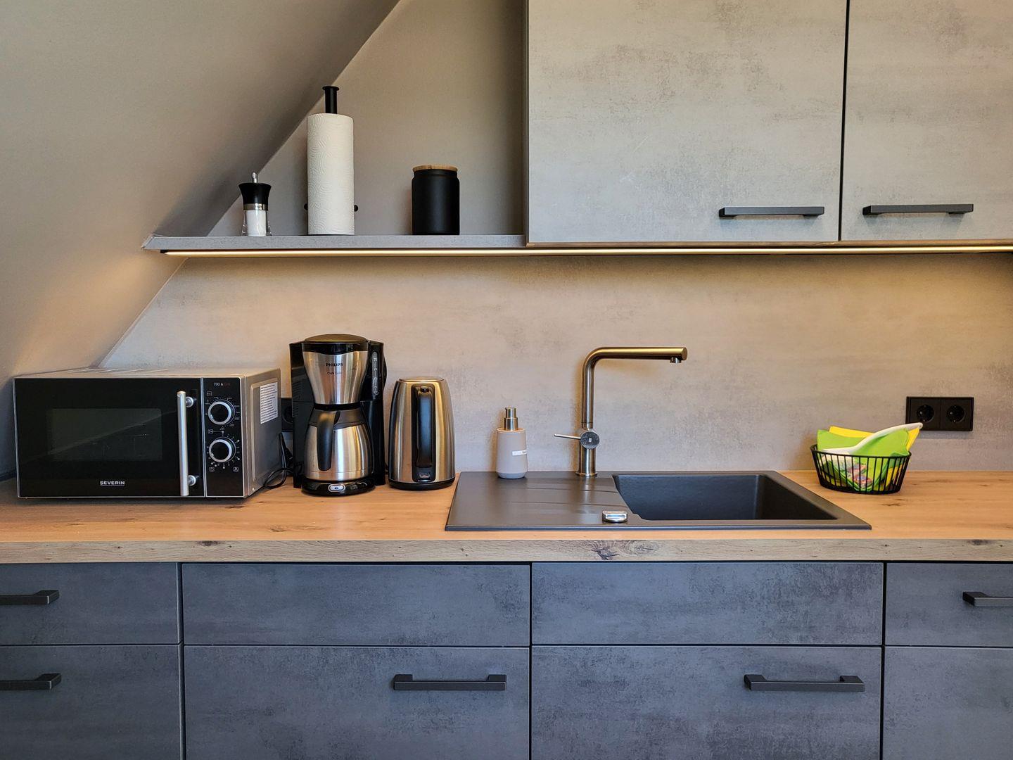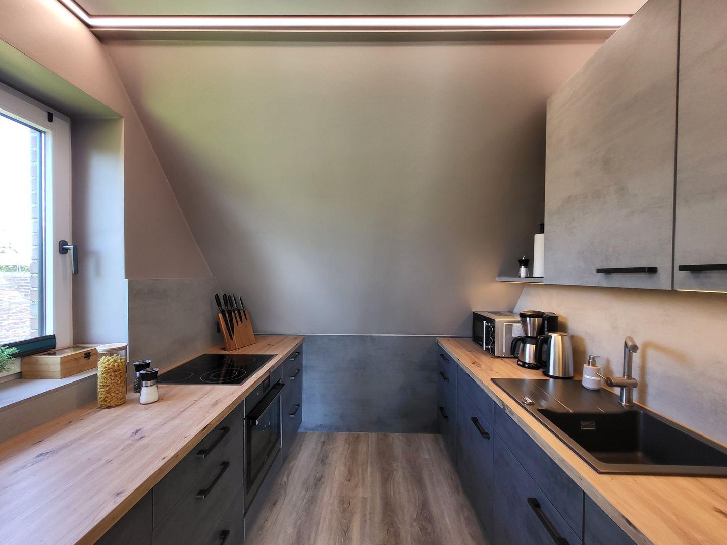 Die angrenzende, sehr moderne Küche ist bestens ausgestattet und verfügt unter anderem über ein großes Cerankochfeldfeld, einen Kühlschrank mit Gefrierfach sowie Geschirrspüler, Kaffeemaschine und Mikrowelle.