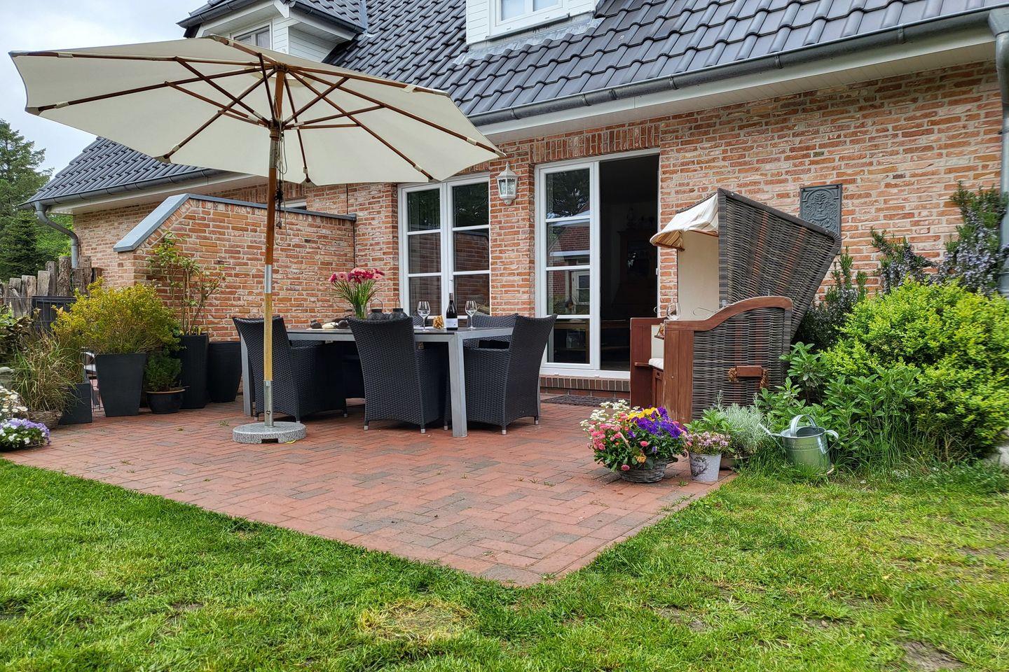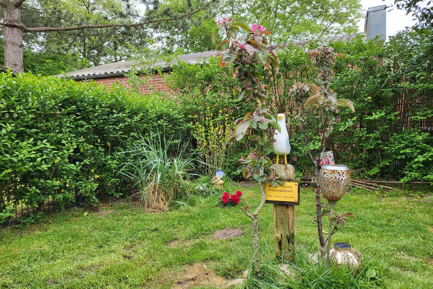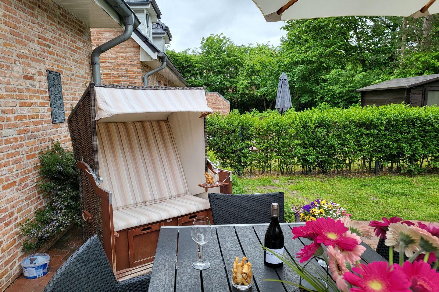 Zum Haus gehört ein übersichtlicher, komplett eingezäunter Garten sowie eine komplett möblierte Terrasse. In den Sommermonaten stehen ein typisch norddeutscher Strandkorb und ein Grill zur Nutzung bereit.