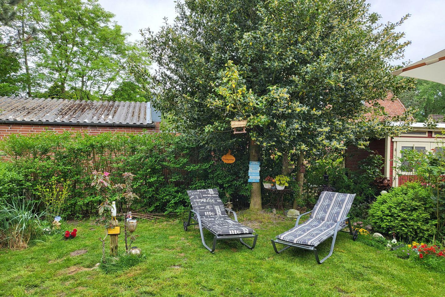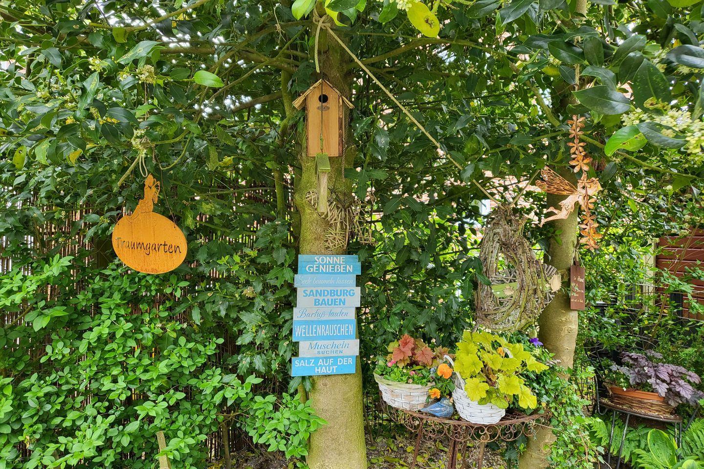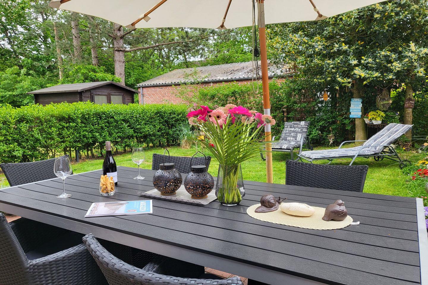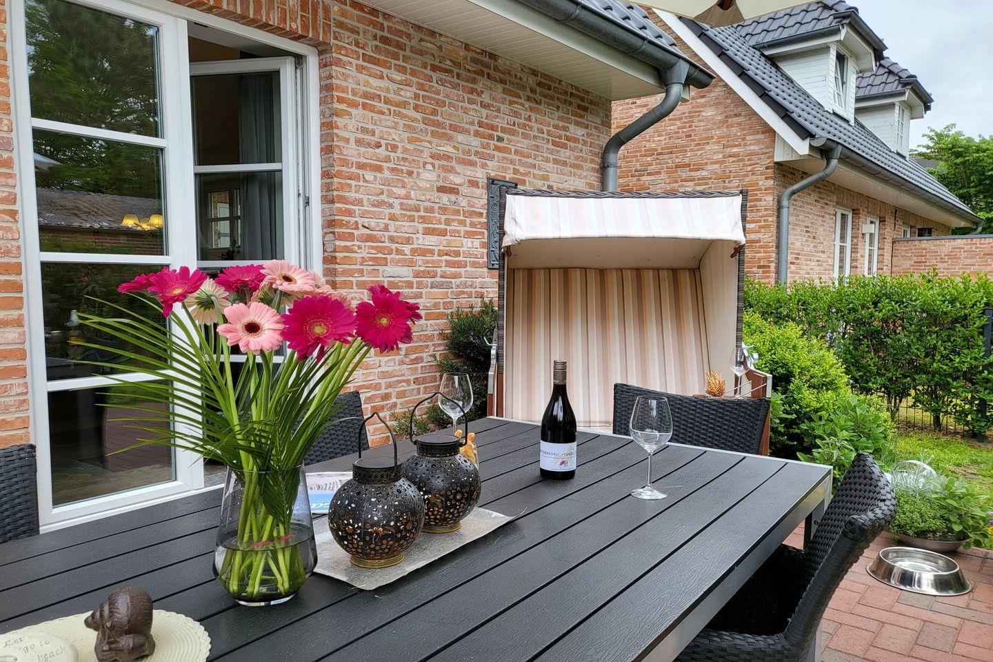 Zum Haus gehört ein übersichtlicher, komplett eingezäunter Garten sowie eine komplett möblierte Terrasse. In den Sommermonaten stehen ein typisch norddeutscher Strandkorb und ein Grill zur Nutzung bereit.