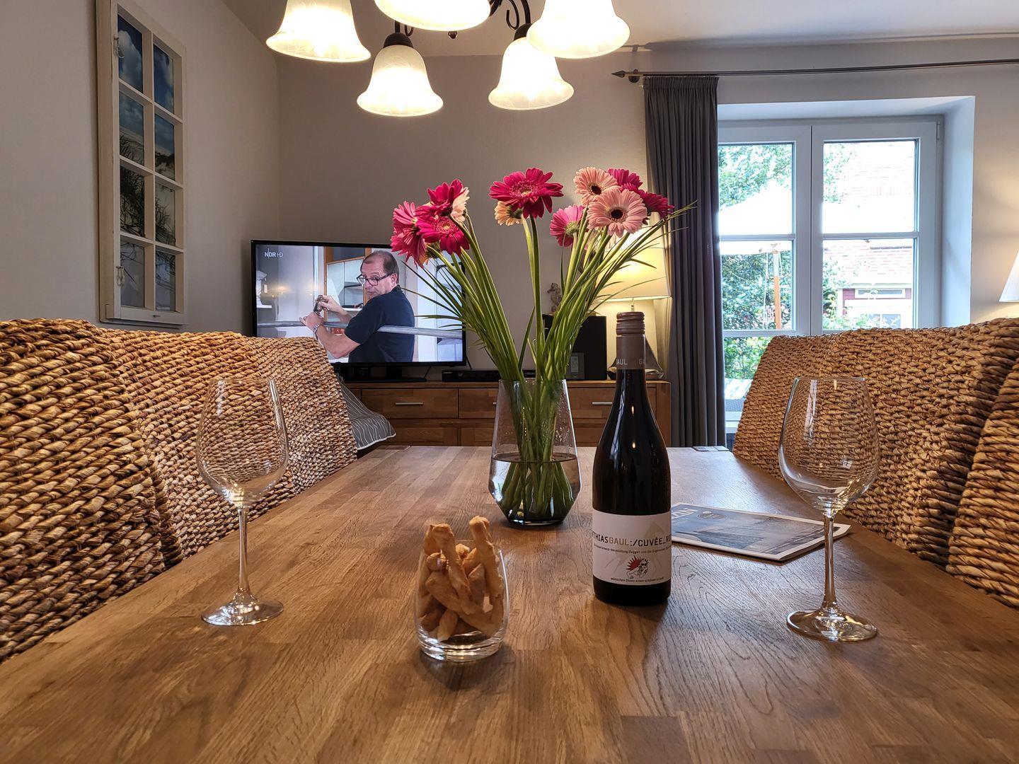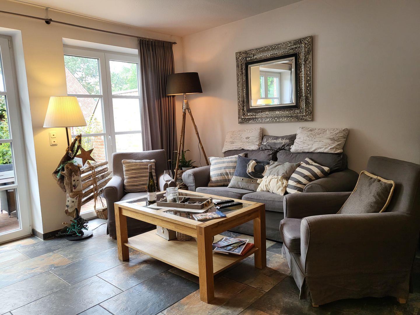 Im Erdgeschoss des im friesisch-skandinavischen Stil erbauten Hauses lädt das geräumige und wunderbar modern eingerichtete Wohnzimmer zu gemütlichen Stunden und leckeren Mahlzeiten ein. Zum Komfortprogramm gehören ein gemütliches Zweisitzer Sofa sowie zwei Sessel und der edle Esstisch mit einladenden Korbstühlen. Für die multimediale Unterhaltung sorgen Flachbild-TV mit DVD- und Blue-Ray-Player sowie kostenfreies W-LAN.