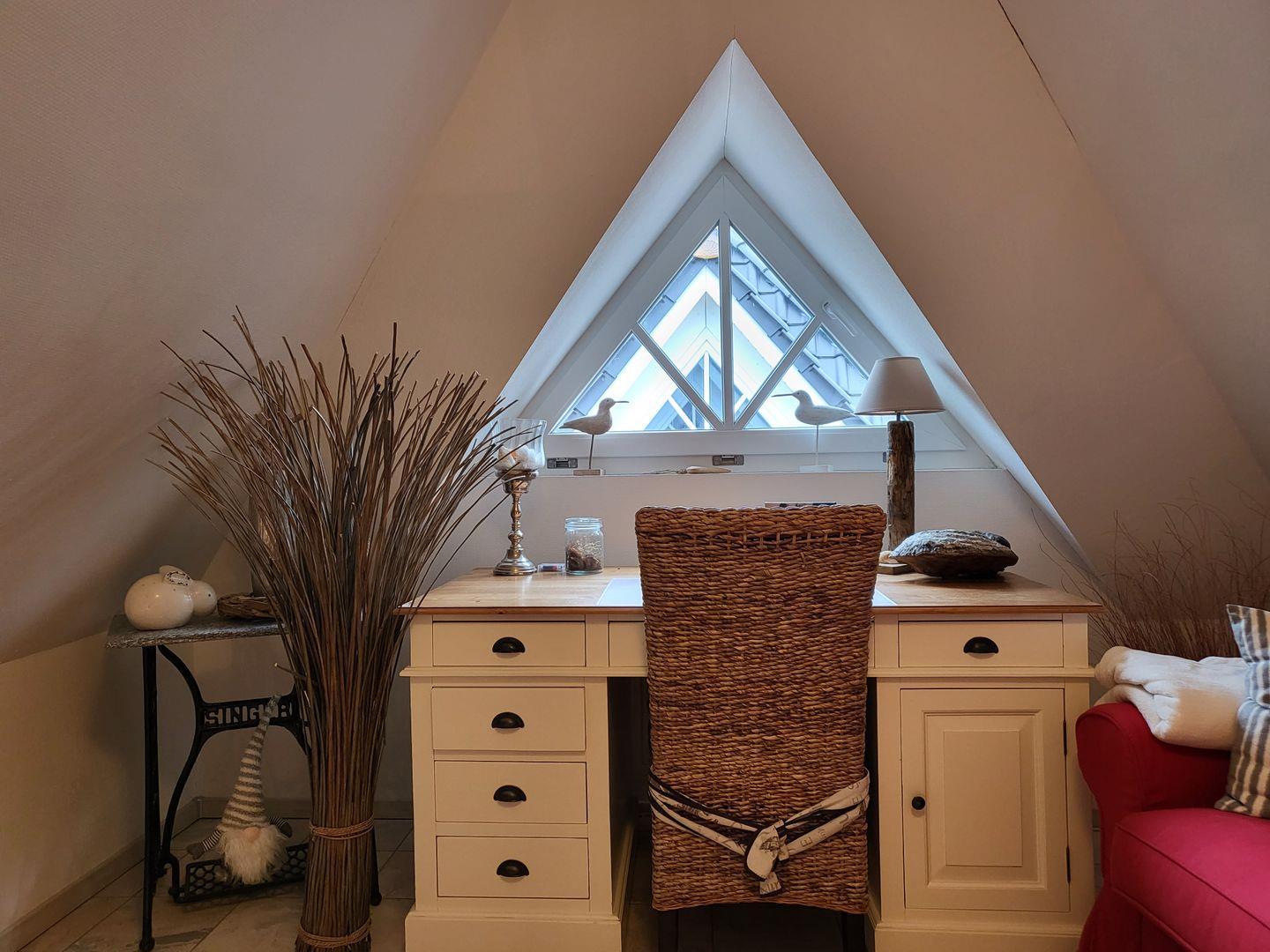 Dachgeschoss als Büro/Leseraum. Komplettausstattung für Hunde - bis zu zwei Hunde erlaubt, Gebühr 5,-€ pro Hund und Tag.