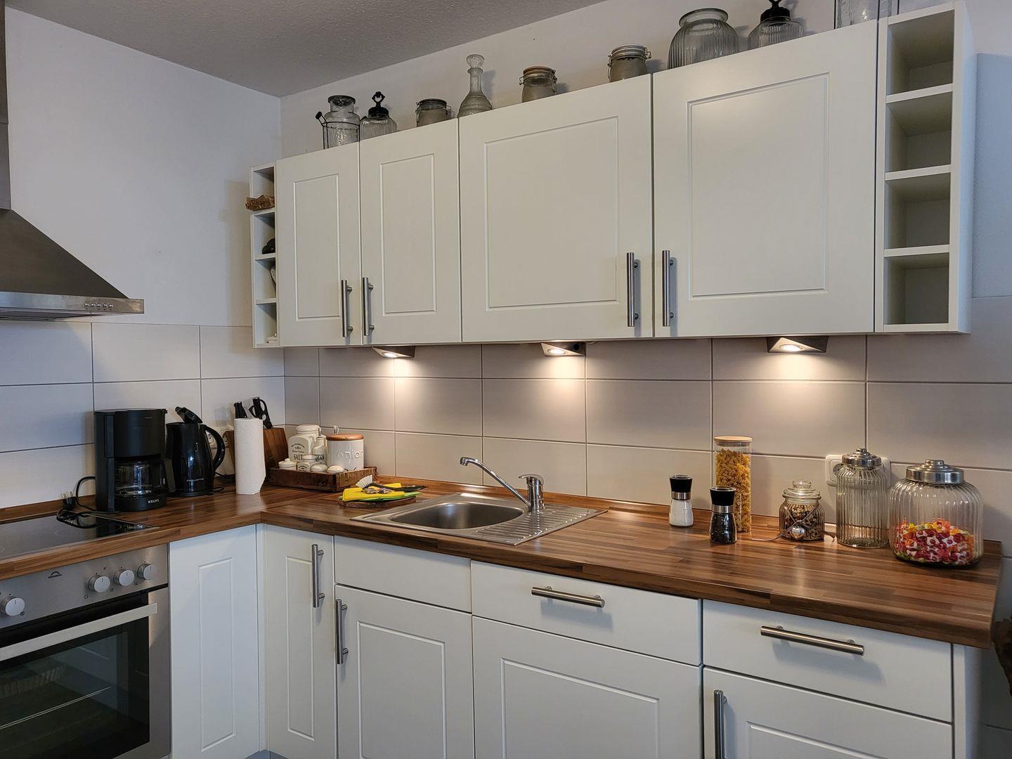 Die angrenzende, offene Küche ist modern und vollumfassend ausgestattet und verfügt unter anderem über ein großes Cerankochfeld und Herd sowie einen großen Kühlschrank mit Gefrierfach, Geschirrspüler und Kaffeemaschine. Ebenfalls steht im Erdgeschoss ein Gäste-WC samt bodengleicher Dusche zur Verfügung.