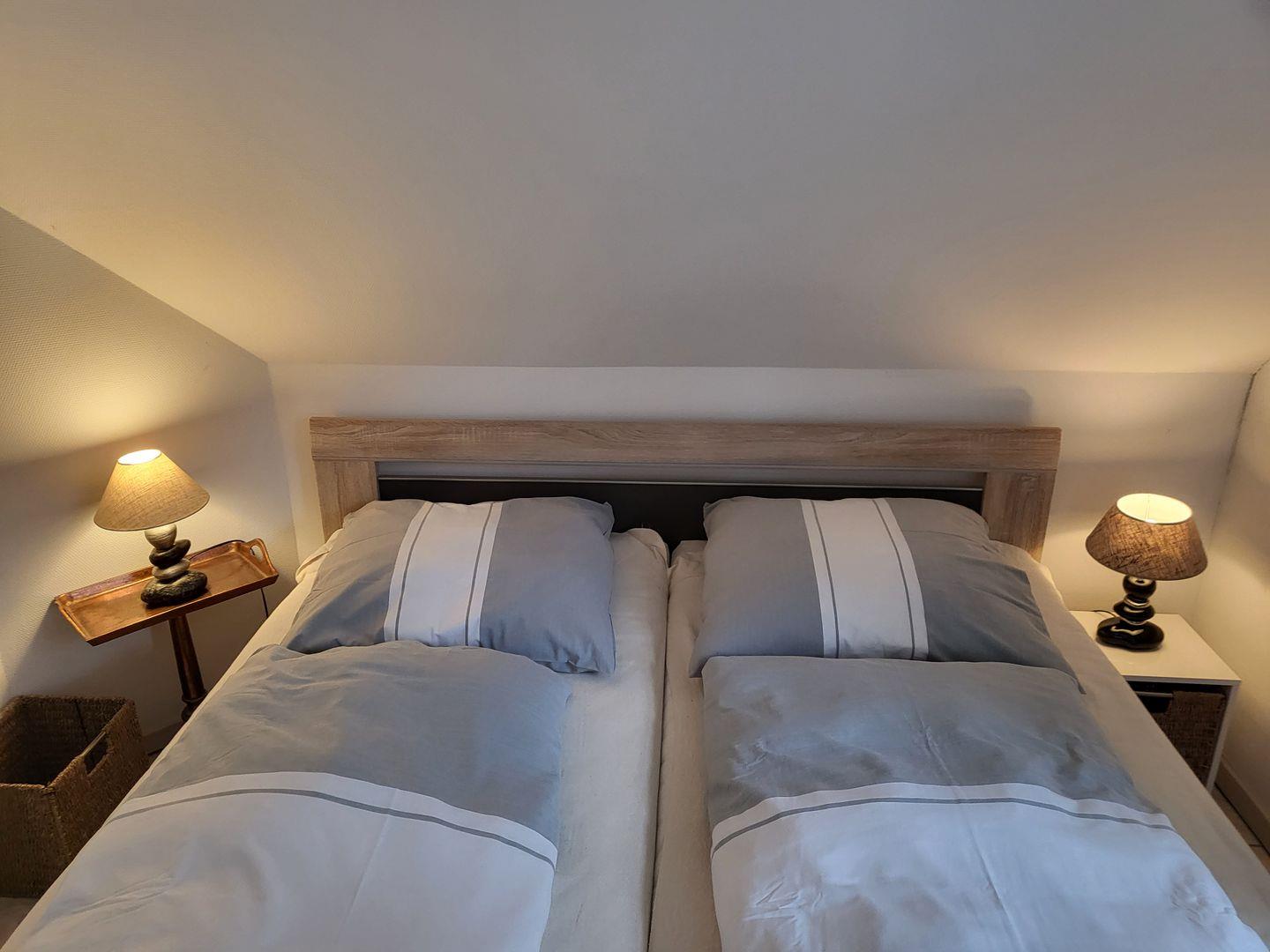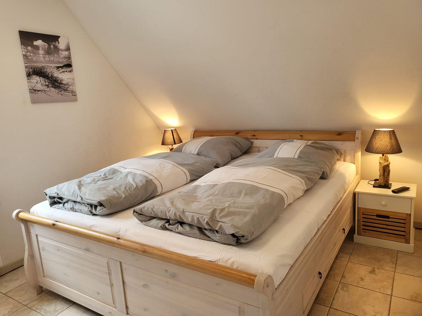 Im Obergeschoss sorgen zwei Schlafzimmer für erholsame Nächte. Beide sind mit komfortablen 180x200cm Doppelbetten ausgestattet, in einem ist ein weiterer Flachbild-TV vorhanden. Der Spitzboden ist zum gemütlichen Büro und Leseecke ausgebaut und eignet sich wunderbar als kleine Rückzugsmöglichkeit.