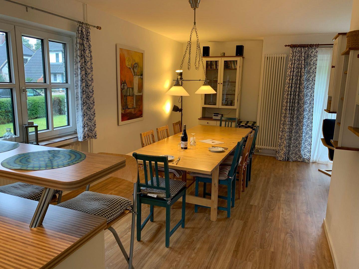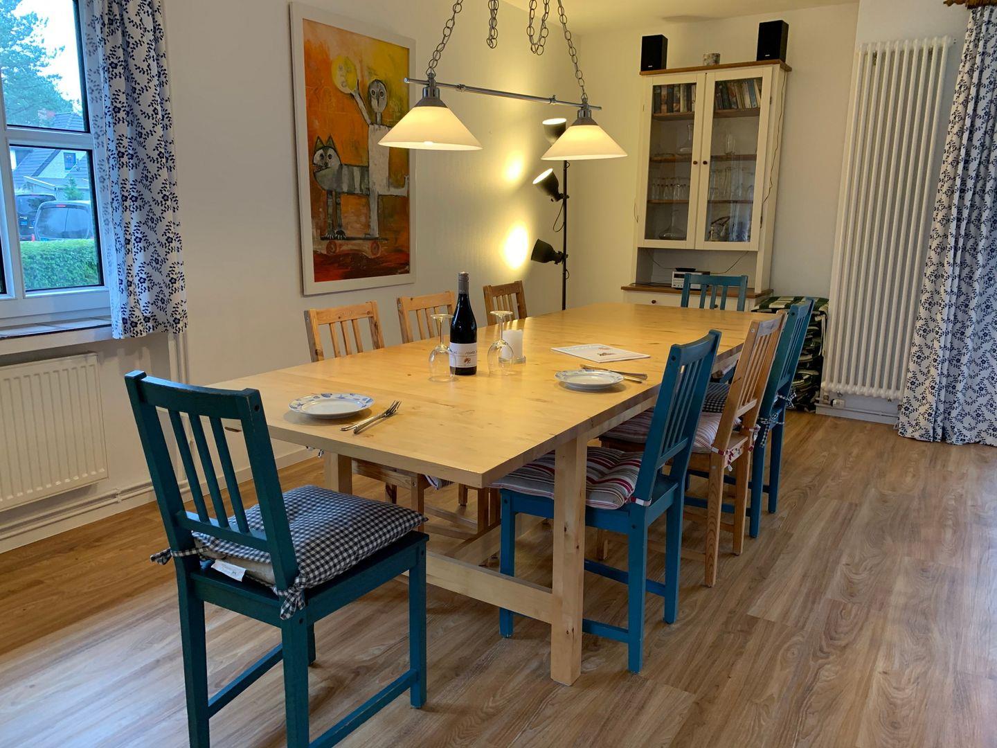 Maritim eingerichtetes, freistehendes Ferienhaus mit Garten und Terrasse. Kombinierter Wohn-Essraum mit offener Küche und Küchentresen.