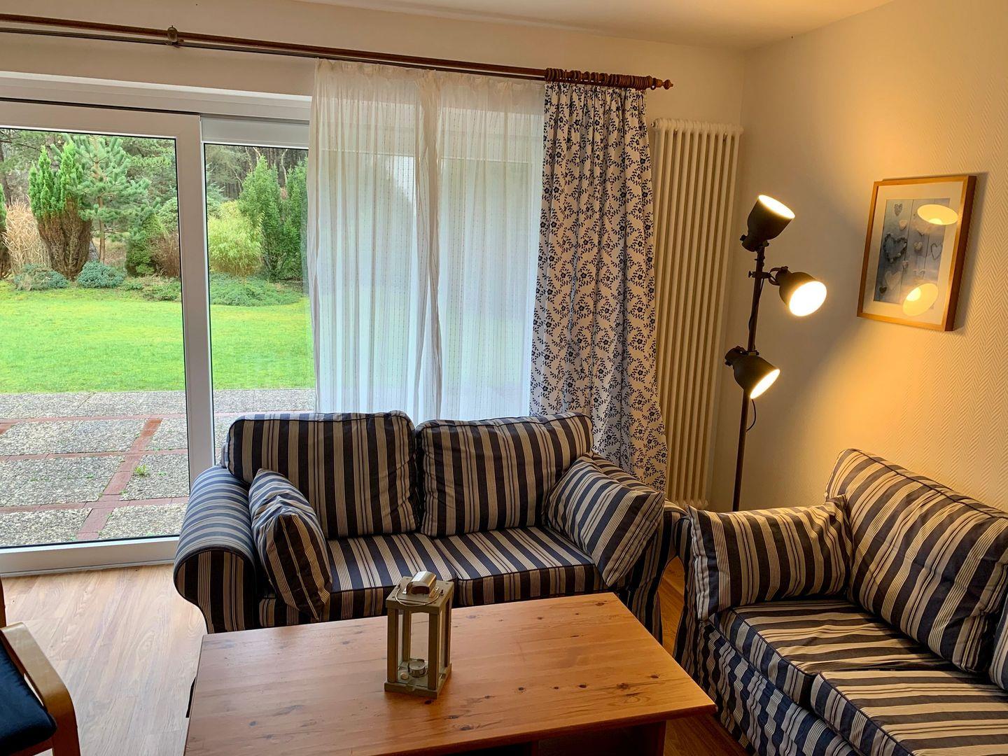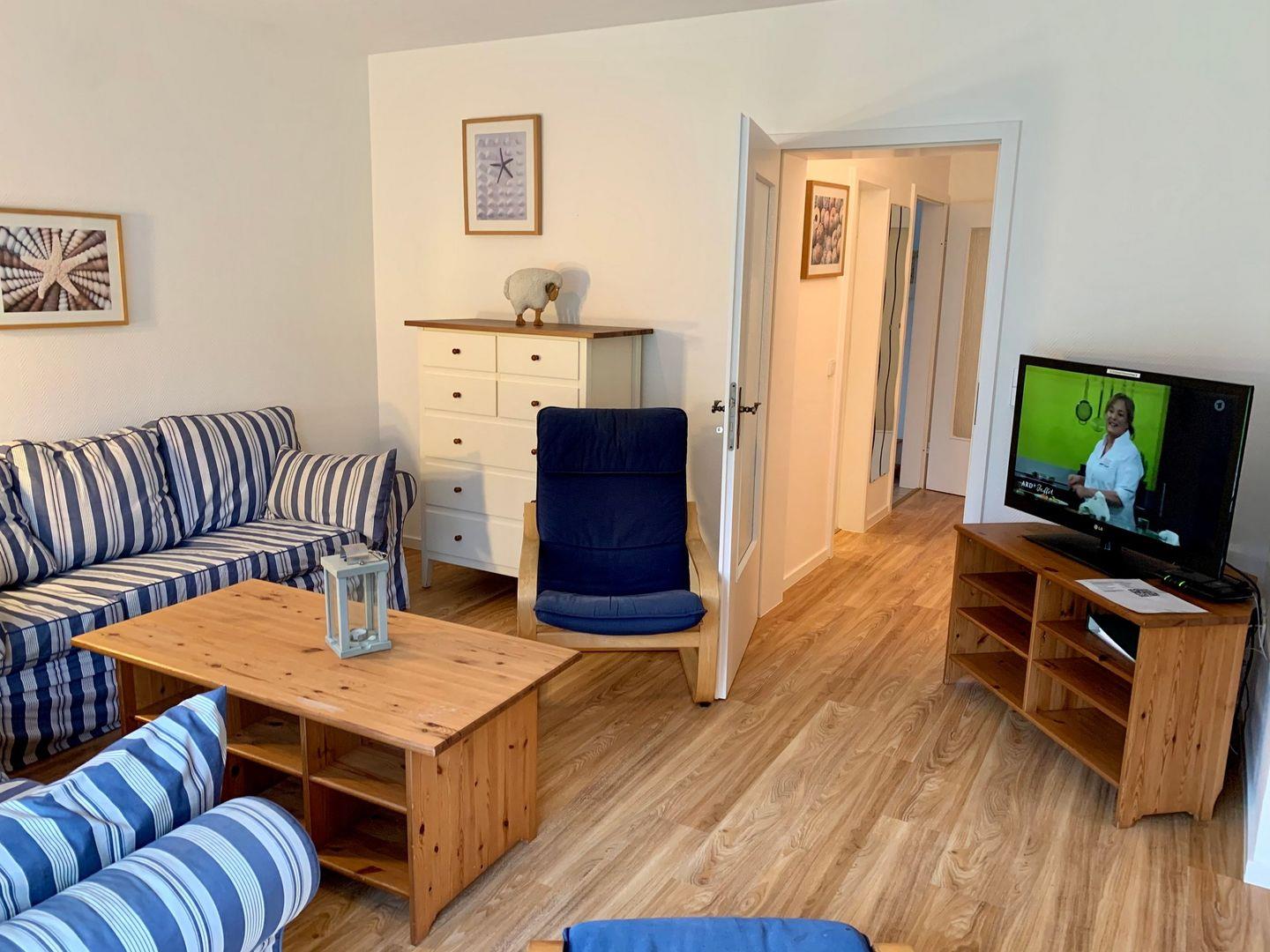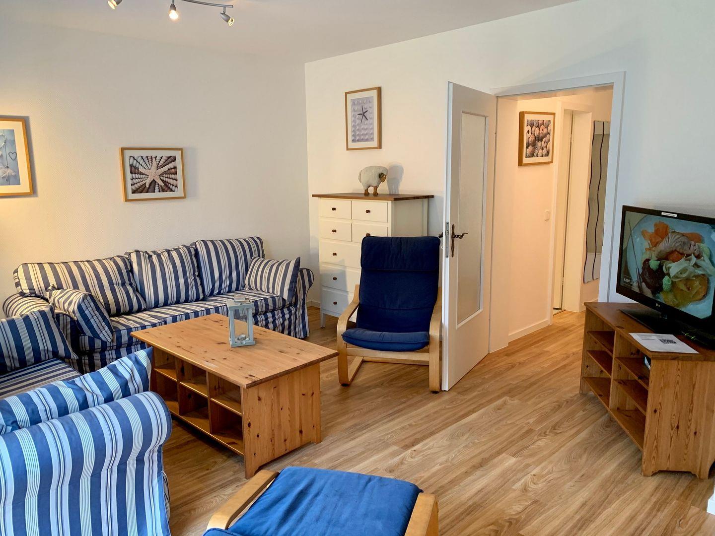 Das große Wohnzimmer des Ferienhauses wirkt hell und einladend, hier gehört eine urgemütliche Sitzgruppe aus zwei gemütlichen Sofas und 2 komfortablen Schwingsesseln zur Ausstattung. Für die multimediale Unterhaltung im maritim eingerichteten Raum sorgen Flachbild-TV und kostenfreies W-LAN, am Esstisch ist Platz für die ganze Familie. Die zum Wohnzimmer hin offene, moderne Küche ist sehr gut ausgestattet. Hier gehören unter anderem Cerankochfeld und Backofen, ein Kühlschrank sowie Mikrowelle, Geschirrspüler und Kaffeemaschine zur Ausstattung. Ein Kühlschrank mit Gefrierfach ist ebenfalls vorhanden. Am Tresen sind zwei separate Sitzplätze vorhanden. Im Obergeschoss des Ferienhauses befinden sich 3 Schlafzimmer. Eines ist ausgestattet mit 160x200cm Doppelbett und einem Kleiderschrank, ein weiteres verfügt über ein 160x200cm Doppelbett sowie ein Einzelbett, einen Flachbild-TV und einen Kleiderschrank. Im dritten Schlafzimmer stehen zwei Einzelbetten sowie ein Kleiderschrank zur Verfügung.