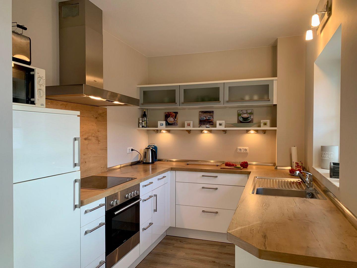Die angrenzende, offene Küche ist hochwertig und vollumfassend eingerichtet. Zur Ausstattung gehören unter anderem ein großes Cerankochfeld mit Backofen sowie ein Kühlschrank mit Gefrierfach. Mikrowelle, Kaffeemaschine, Geschirrspüler und großzügig vorhandenes Geschirr gehören ebenfalls zum Inventar.