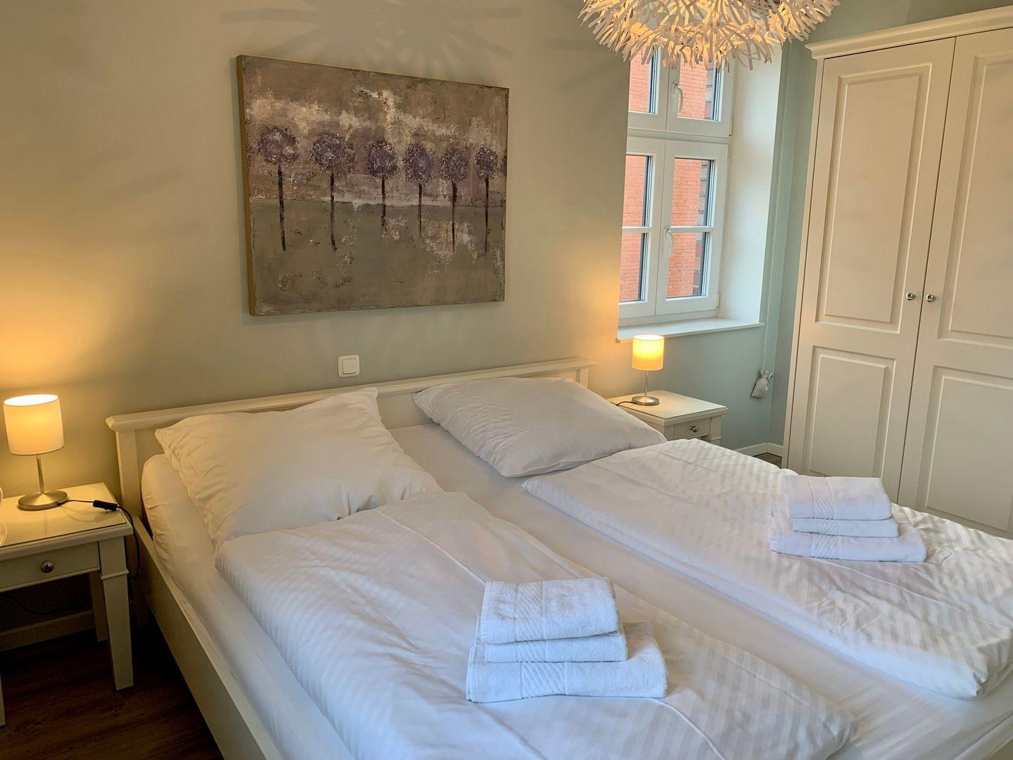 Die Ferienwohnung verfügt über zwei Schlafzimmer, eines ist mit einem 180x200cm Doppelbett und einer hochwertigen neuen Tempur-Matratze sowie einem Fernseher ausgestattet. Ein weiteres Zimmer verfügt über zwei Einzelbetten, die zum Doppelbett kombinierbar sind. Beide Räume lassen sich durch die Rollos sehr gut verdunkeln. Ebenso sind Insektenschutzgitter an den Fenstern vorhanden.
