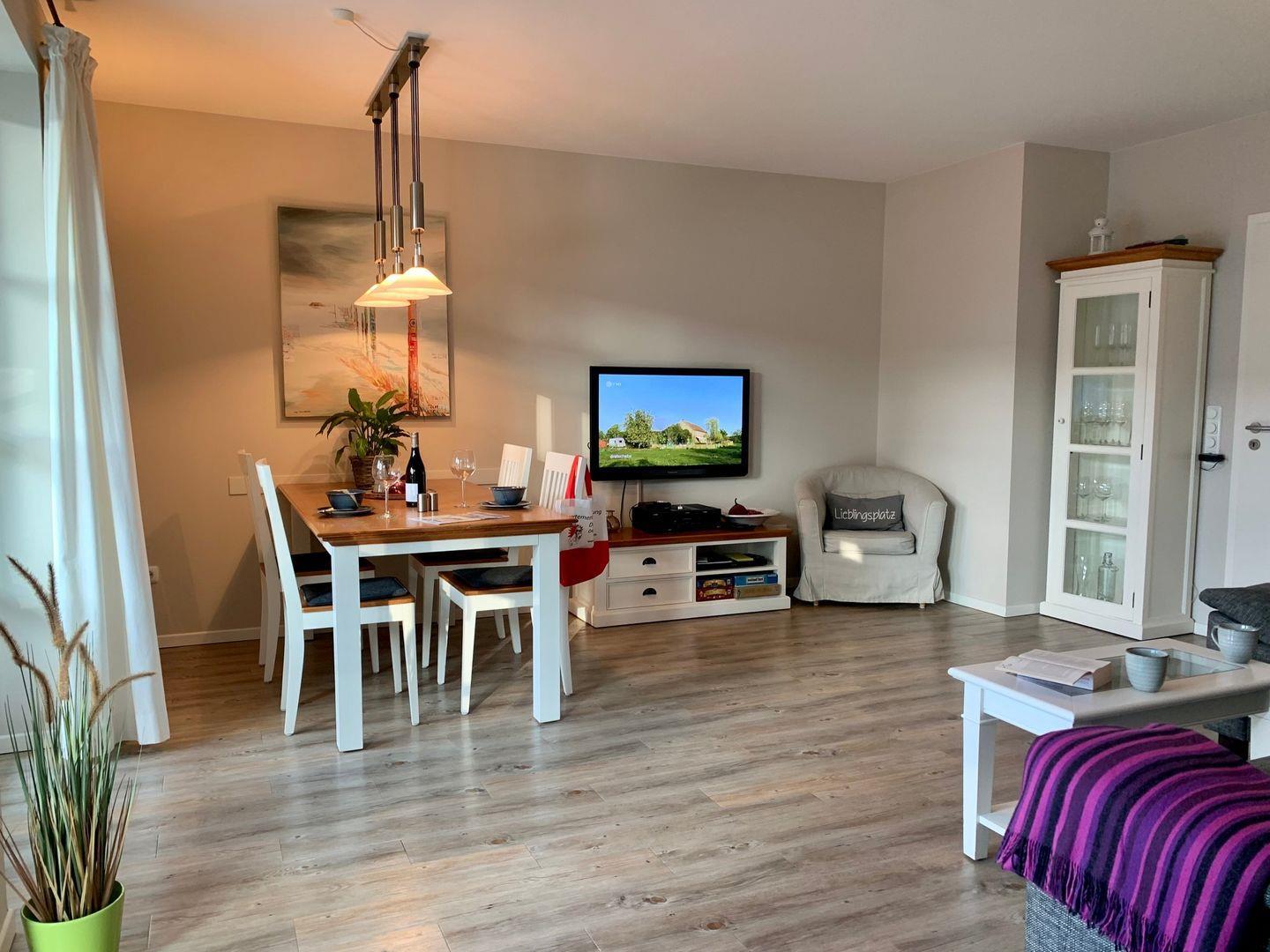Durch die große Fensterfront und die Möblierung mit schönen Bildern von Sankt-Peter Ording wirkt das Wohnzimmer hell und freundlich. Die große Sitzecke, die komfortable Couchgarnitur sowie dimmbare Lampen und Kerzenlicht laden zu gemütlichen Stunden ein. Auf dem angrenzenden Südwest Balkon lassen sich sonnige Nachmittagsstunden genießen. Einige Bücher, Brett- und Kinderspiele sind vorhanden. Für die multimediale Unterhaltung sorgen der Fernseher mit DVD/Blueray-Player, die Musikanlage und das kostenfreie WLAN.