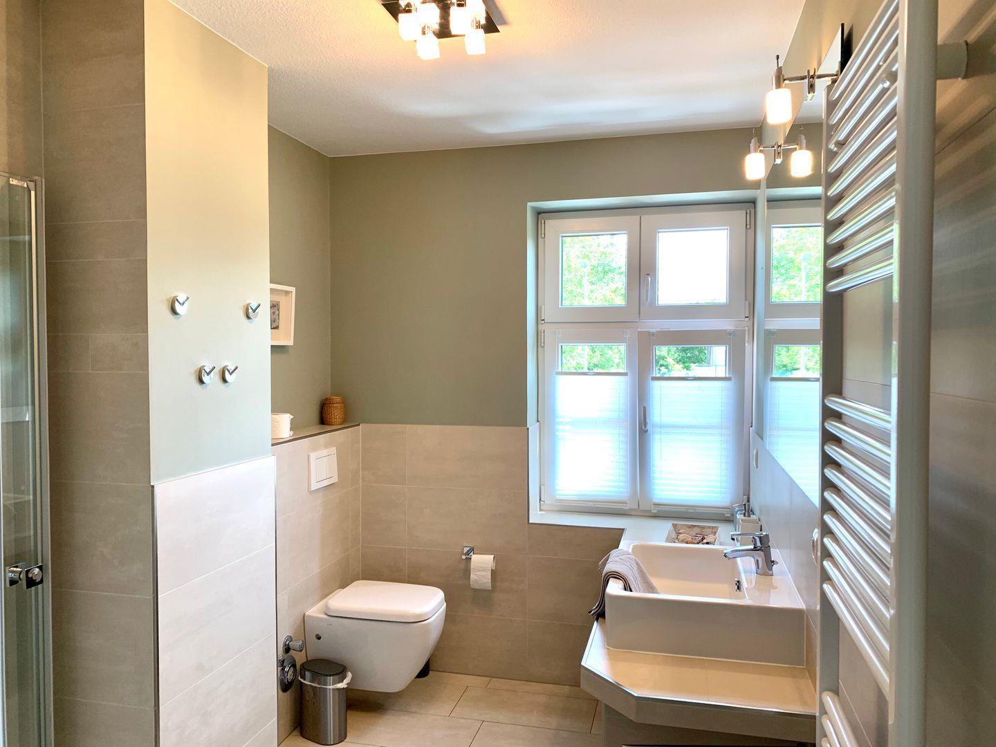 Das großzügige Badezimmer der Ferienwohnung hat eine ebenerdige Regendusche und viele Abstellmöglichkeiten. Ein Fön ist vorhanden. Das Bad verfügt wie Wohnzimmer und Küche über eine angenehme Fußbodenheizung für die kältere Jahreszeit.