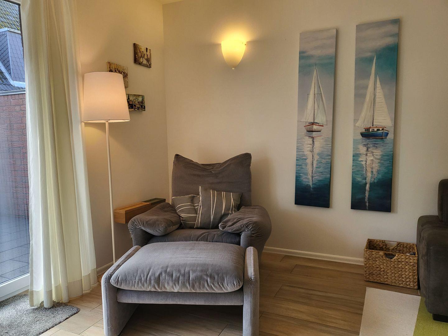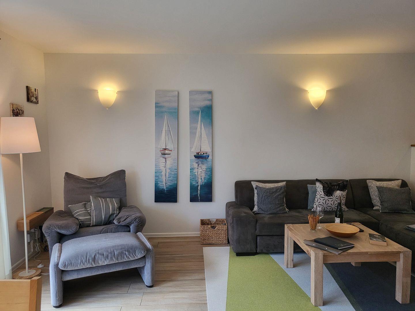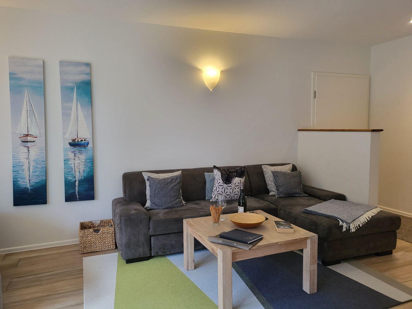 Der gemütliche, wunderbar helle Wohnraum ist maritim eingerichtet.