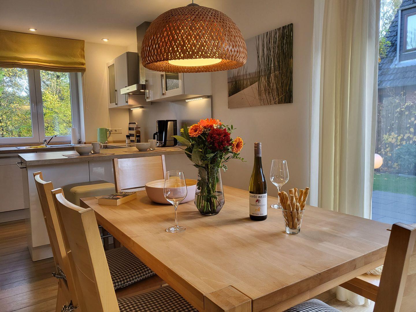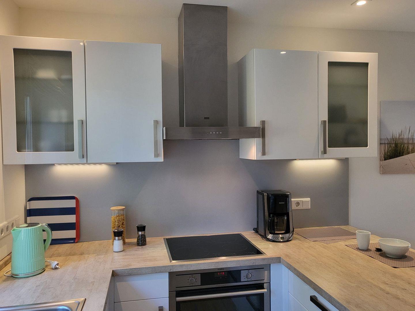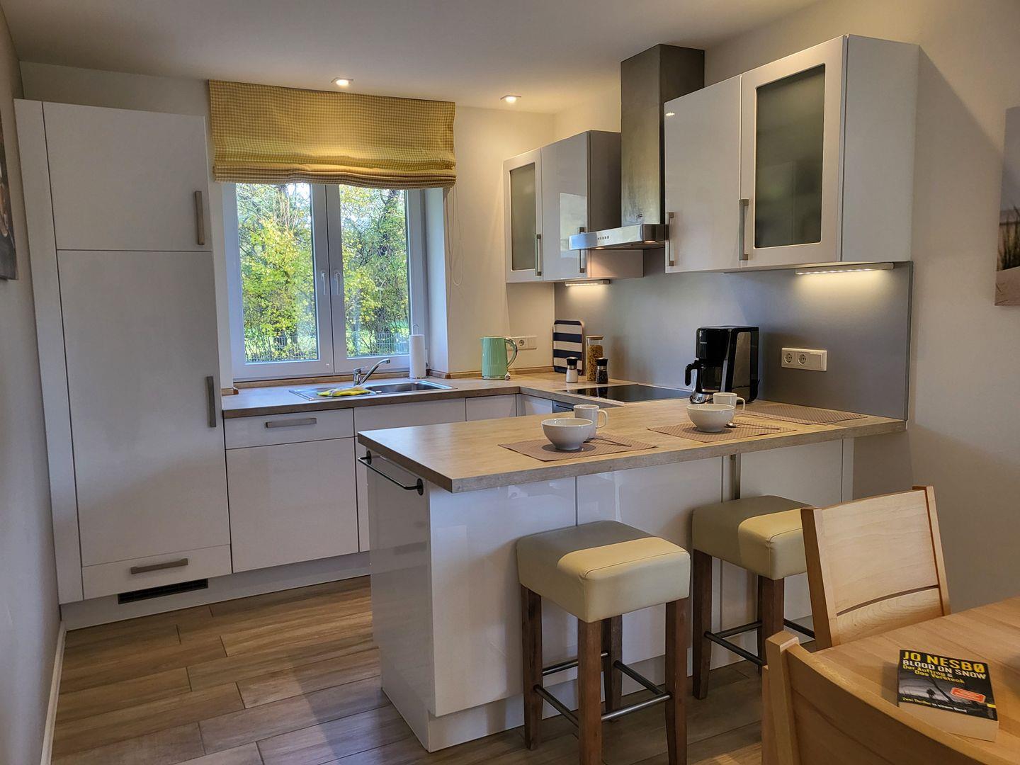Offen zum Wohnraum liegt die sehr gut ausgestattete Küche der Ferienwohnung. Zu ihrer Ausstattung gehören unter anderem ein Induktionskochfeld und Backofen, Kühlschrank mit Gefrierfach sowie Geschirrspüler und Kaffeemaschine. Ein edler Frühstückstresen mit zwei Barhockern unterstreicht das Ambiente.