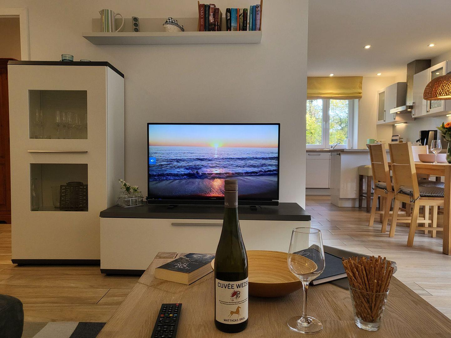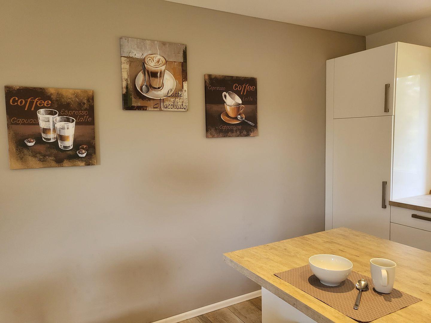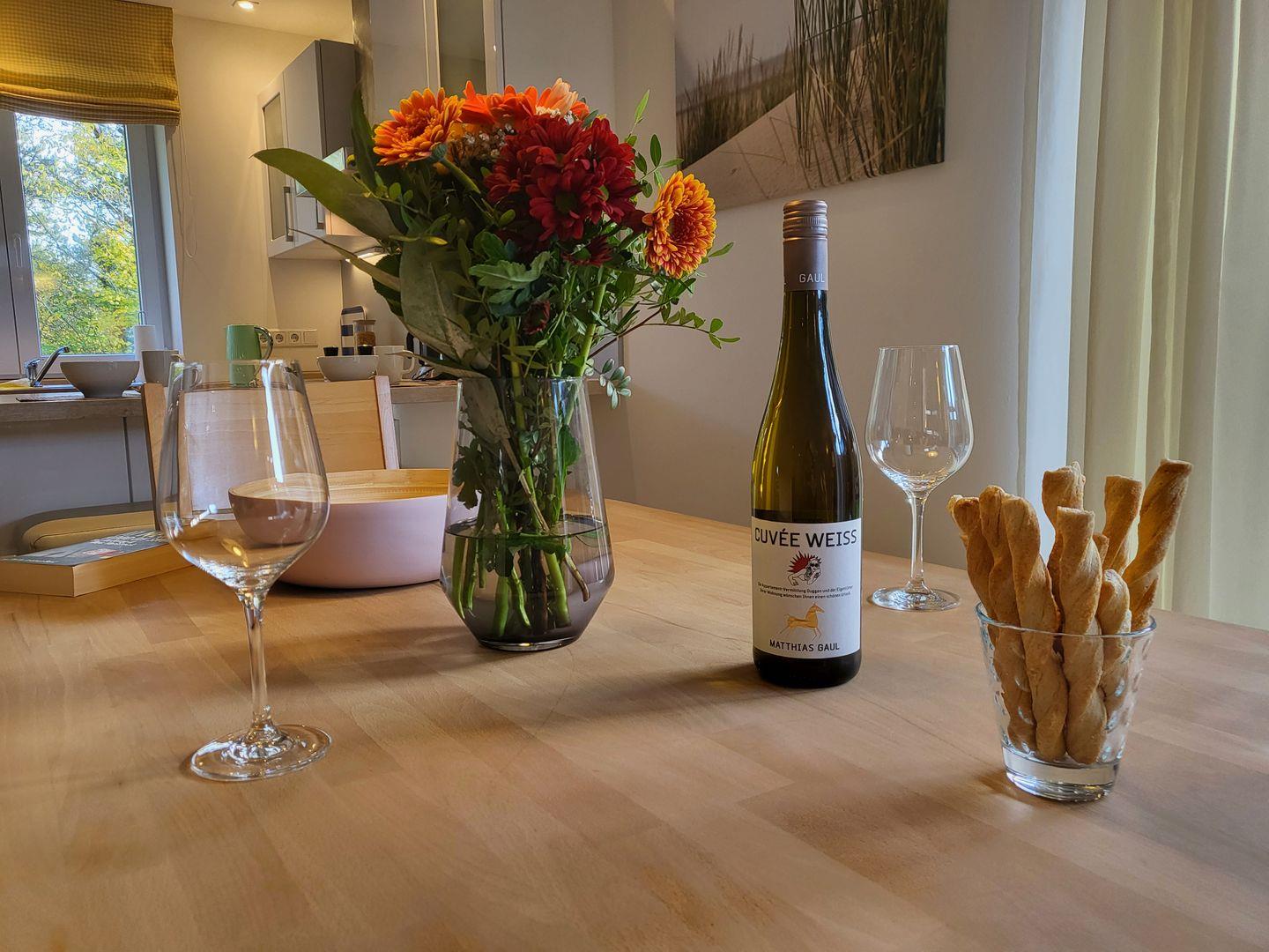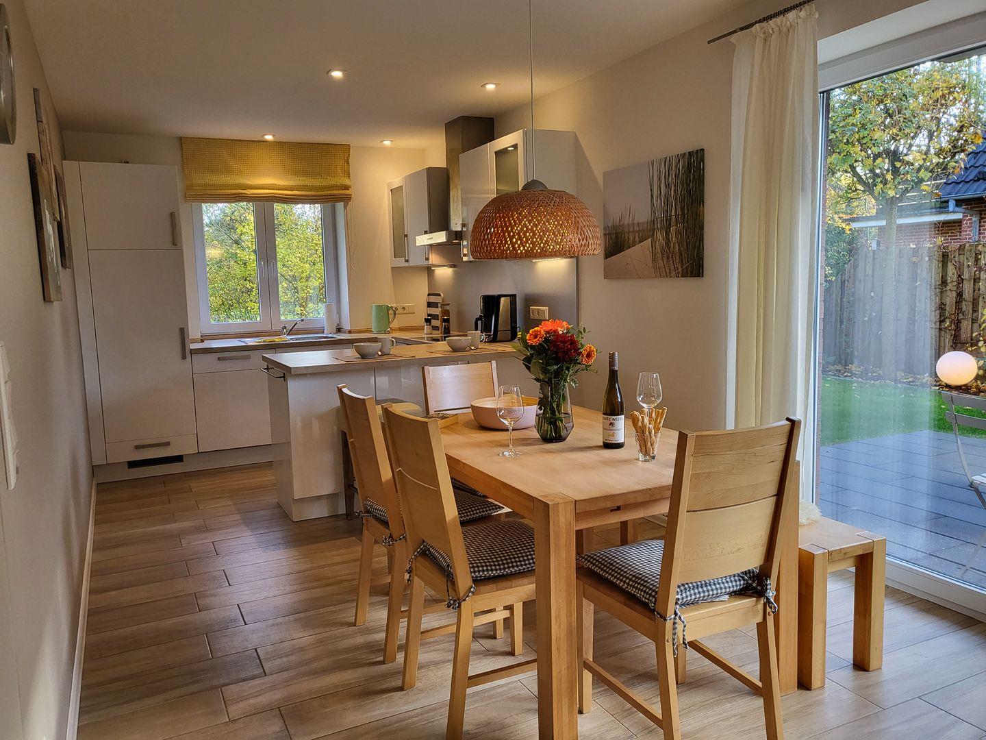 Offen zum Wohnraum liegt die sehr gut ausgestattete Küche der Ferienwohnung. Zu ihrer Ausstattung gehören unter anderem ein Induktionskochfeld und Backofen, Kühlschrank mit Gefrierfach sowie Geschirrspüler und Kaffeemaschine. Ein edler Frühstückstresen mit zwei Barhockern unterstreicht das Ambiente.