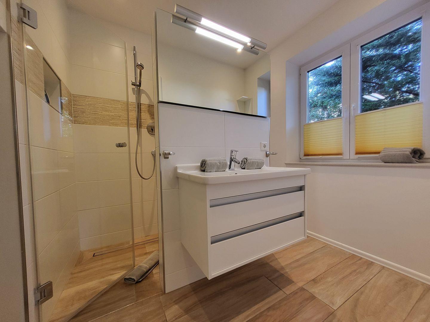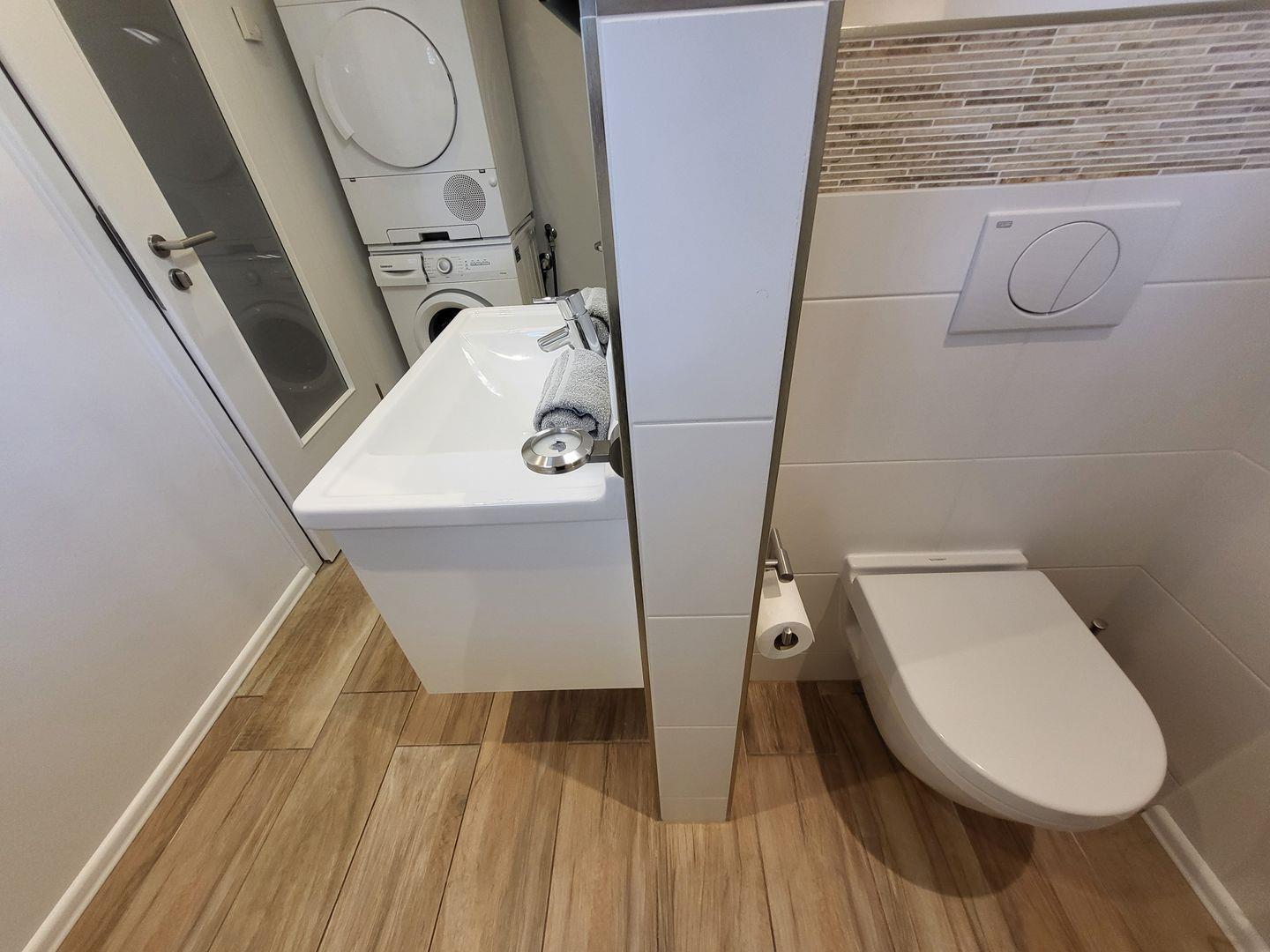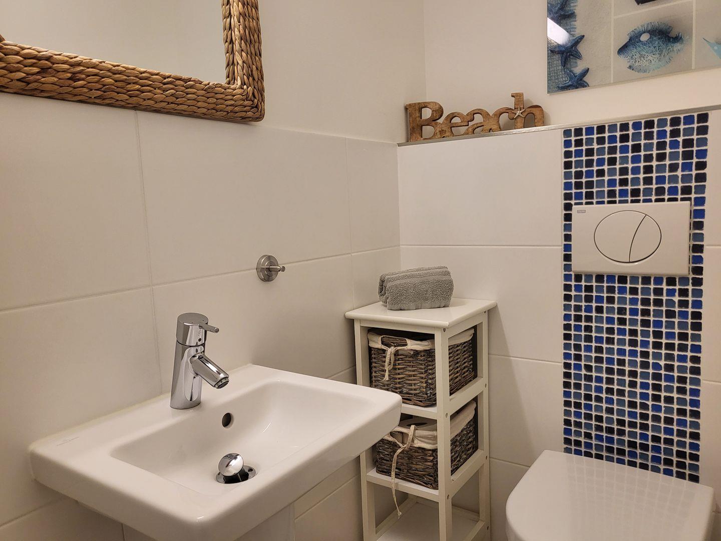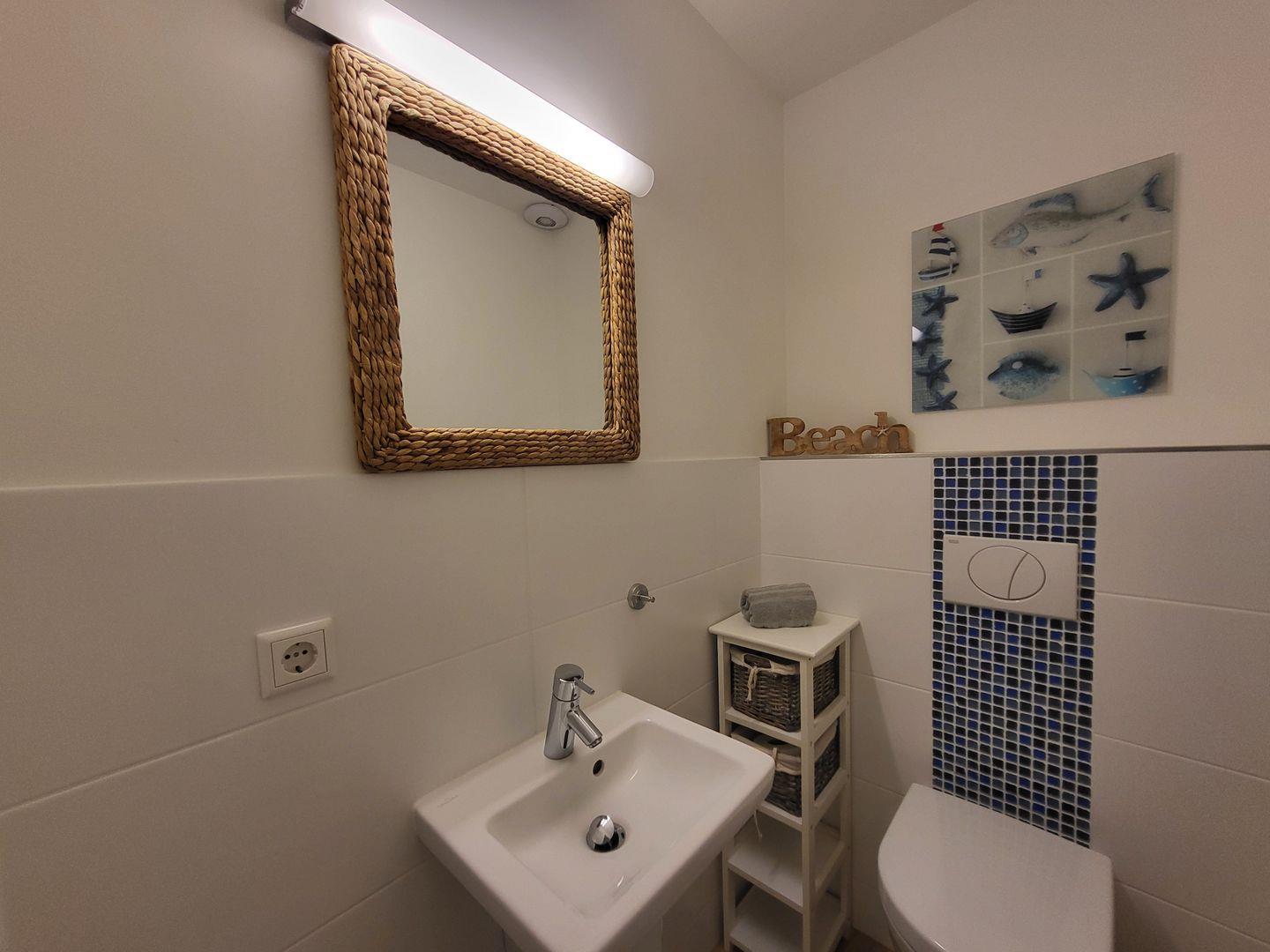 Ein Duschbad mit WC ist vorhanden, die Dusche ist bodengleich angelegt. Weiterhin ist ein separates Gäste-WC vorhanden, Waschmaschine und Trockner stehen zur Verfügung. Die Fenster und Terrassentür der Ferienwohnung sind mit Insektenschutzgittern versehen.