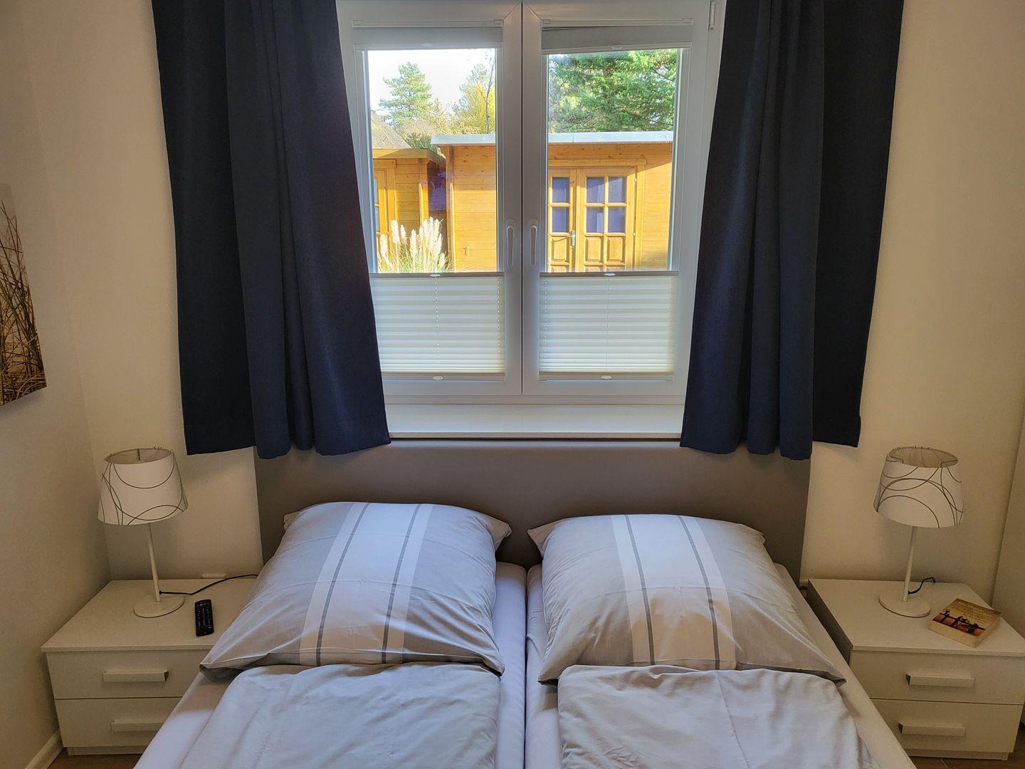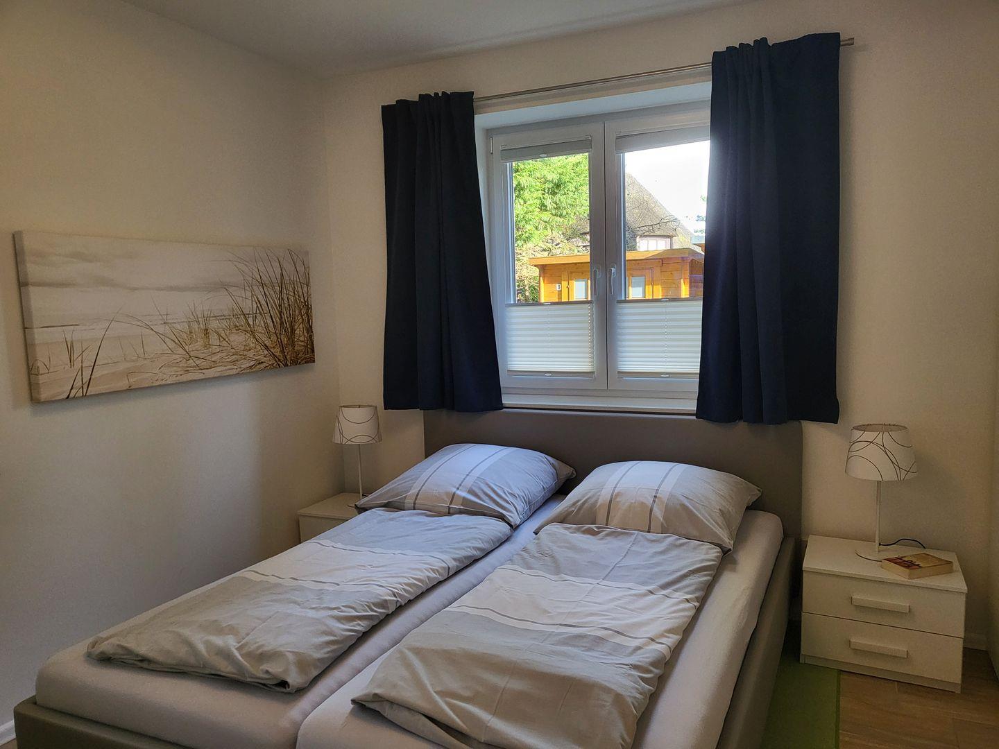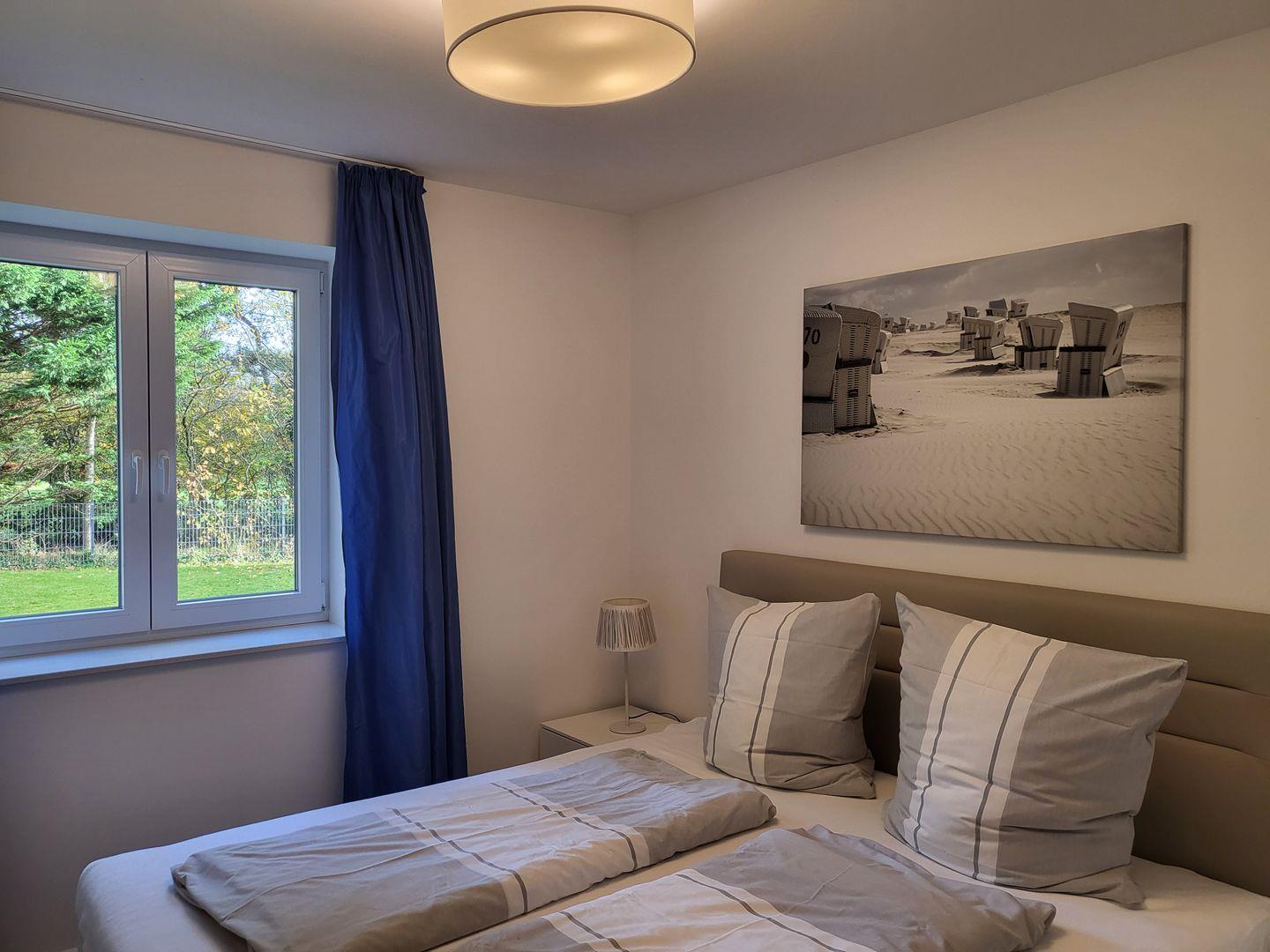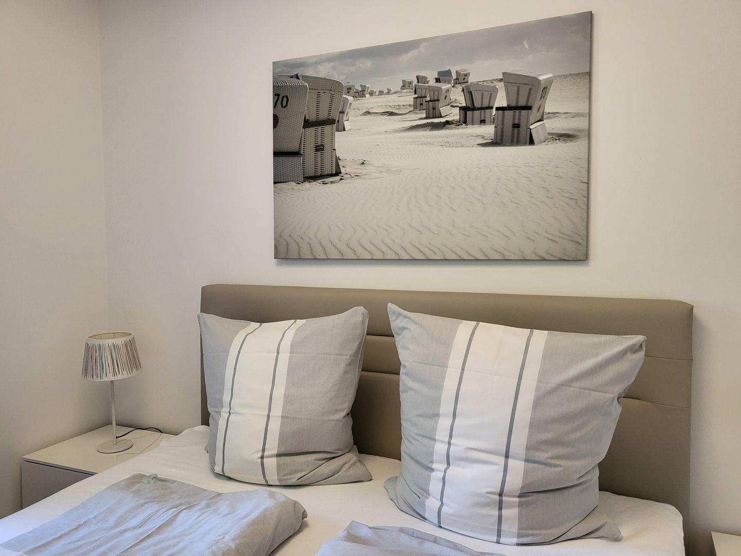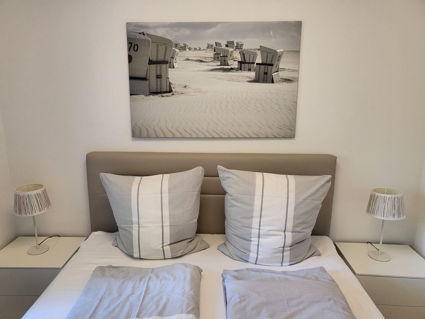 Zur Ferienwohnung gehören zwei helle, einladende Schlafzimmer. Ein Schlafzimmer verfügt über ein 180x200cm Boxspringbett, das andere Schlafzimmer ist mit einem 160x200 Doppelbett und einen eigenen Flachbild-TV ausgestattet.