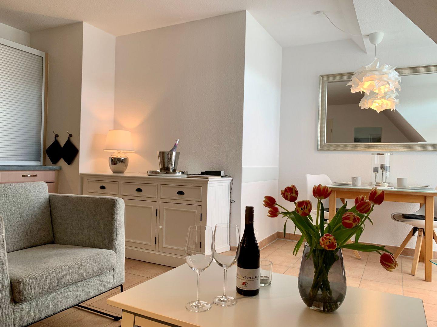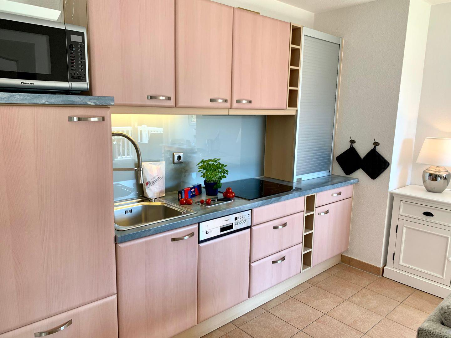 Die in den Raum integrierte moderne Küche ist vollumfassend ausgestattet. Hier gehören unter andere das Cerankochfeld, ein Kühlschrank mit Gefrierfach sowie Geschirrspüler, eine Kaffeemaschine und eine Mikrowelle mit Backfunktion zur Ausstattung. Um gebührend auf den Urlaub anstoßen zu können, steht ein edler Champagnerkühler zur Verfügung.