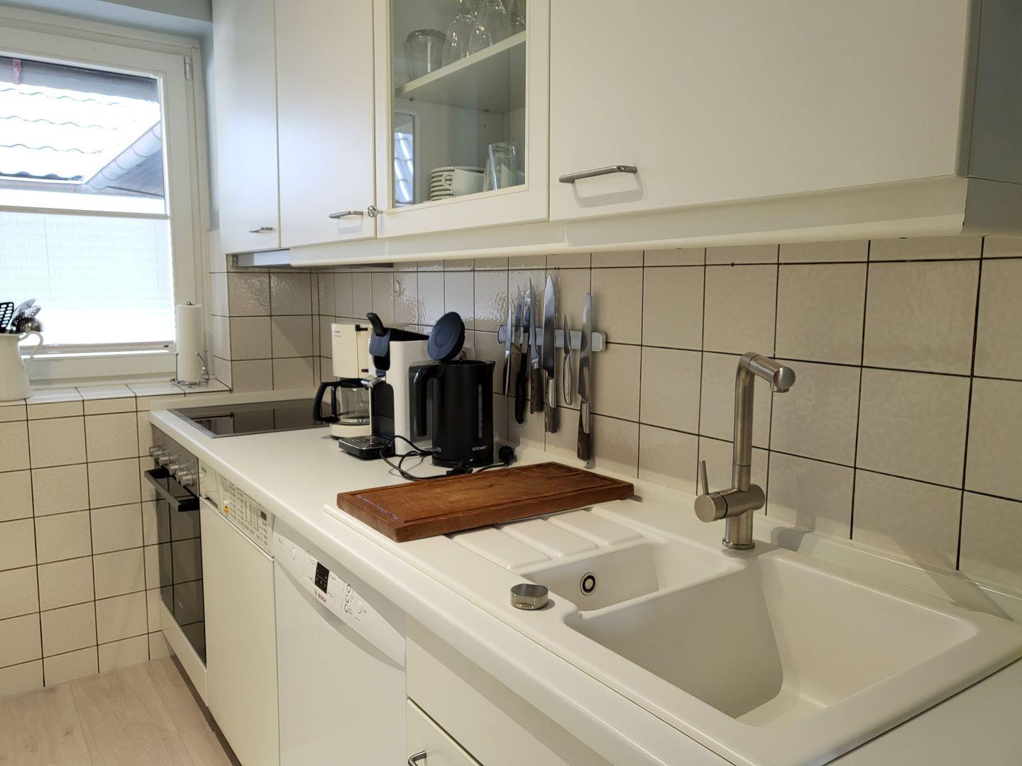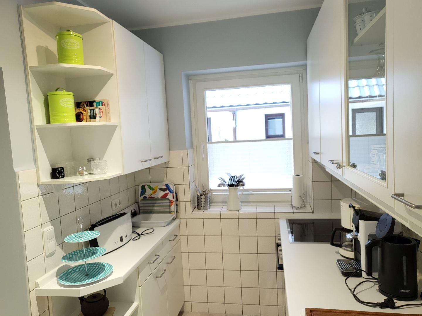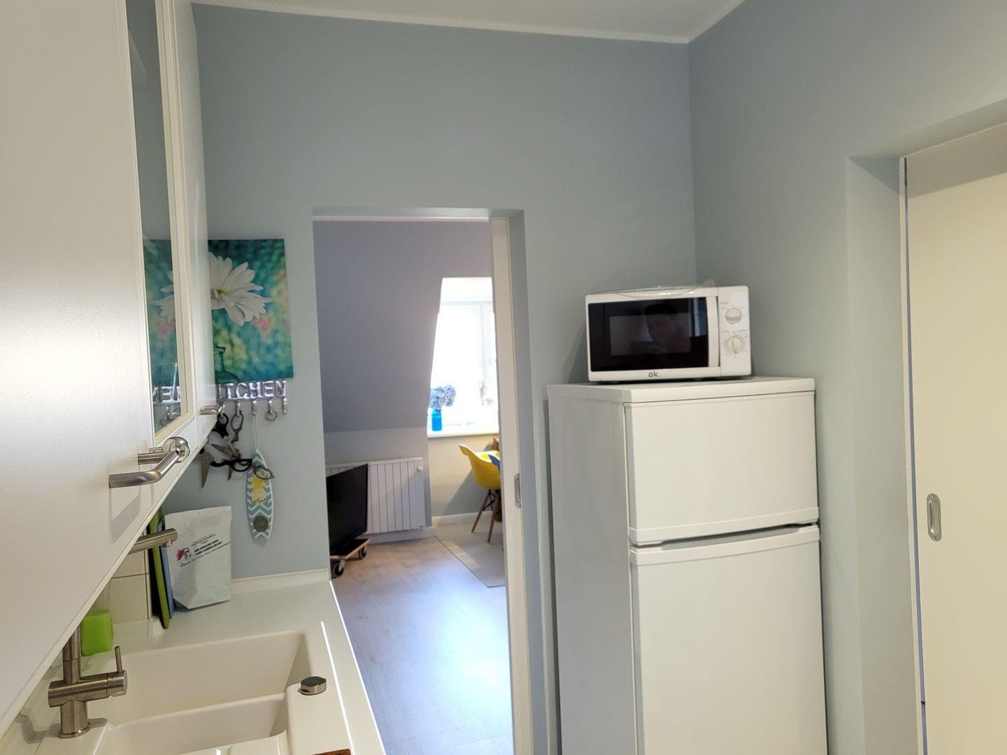 Die separate Küche ist gut ausgestattet und verfügt über Cerankochfeld, Kühlschrank mit Gefrierfach, Mikrowelle sowie Waschmaschine.