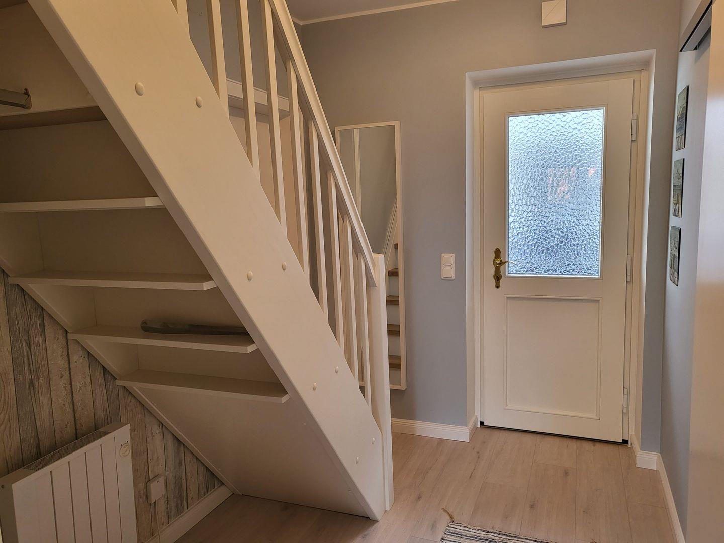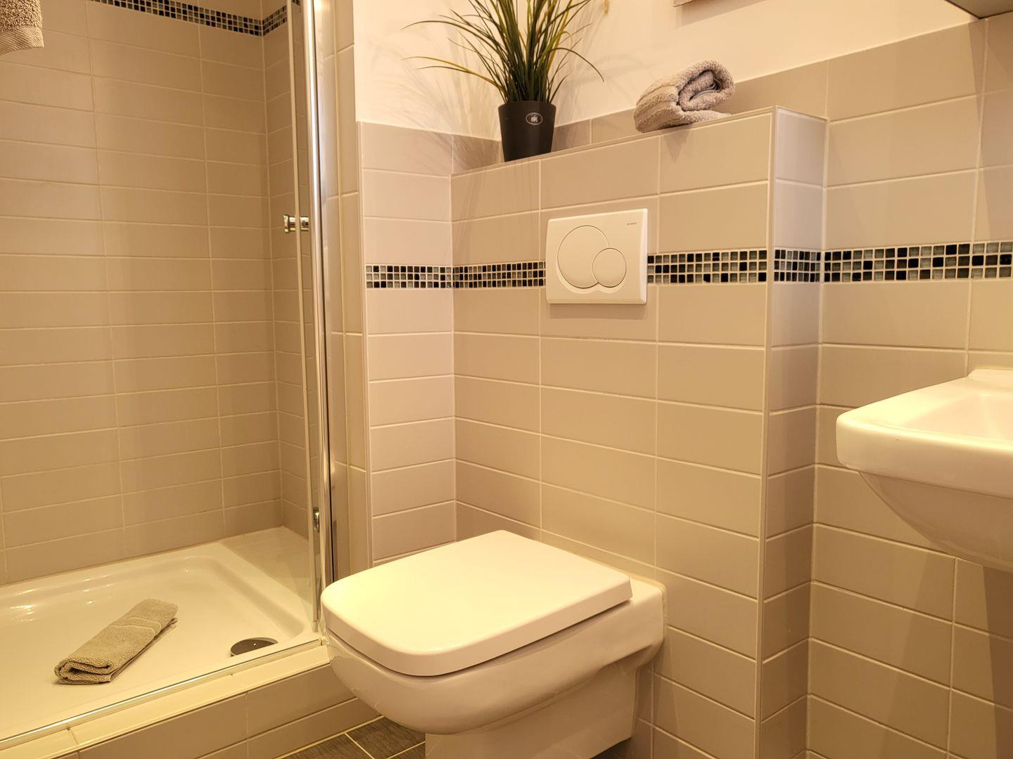Ein Geschirrspüler gehört ebenfalls zur Ausstattung. Zur Ferienwohnung gehört ein Duschbad mit WC und Fußbodenheizung.