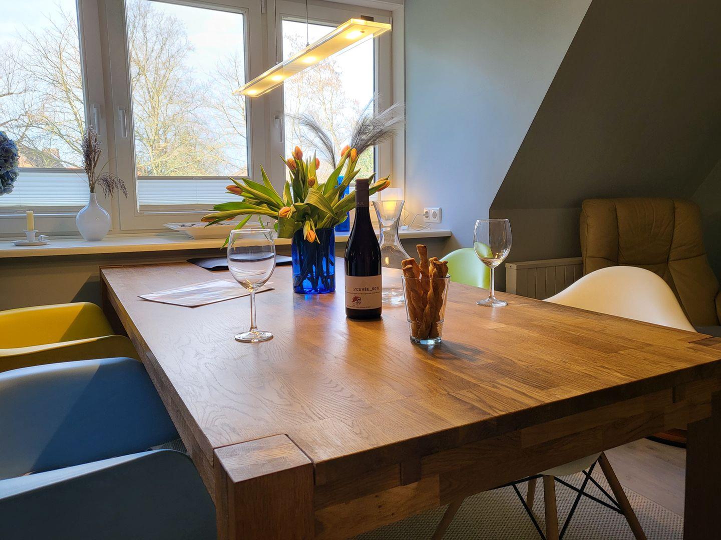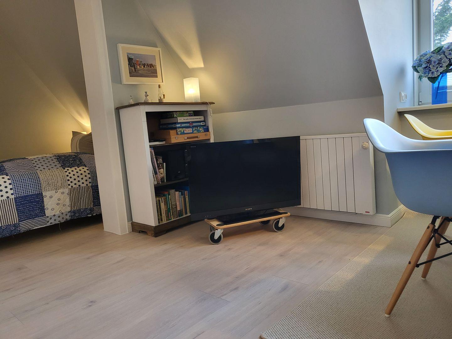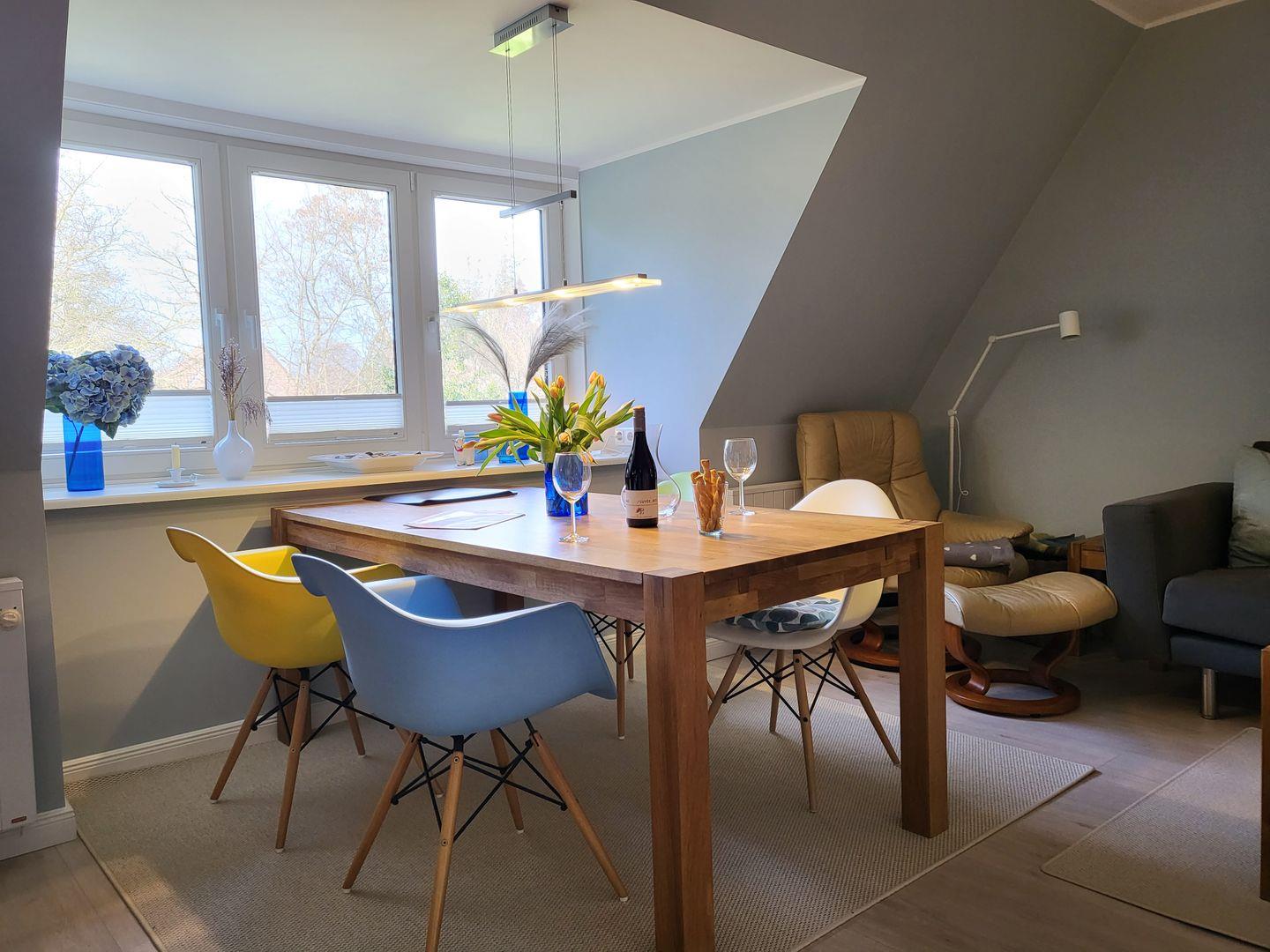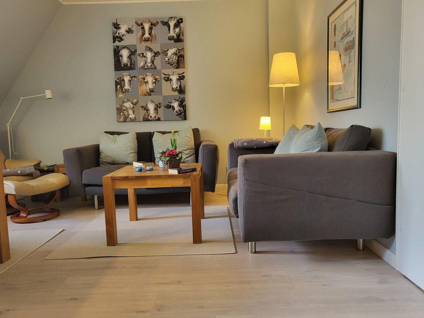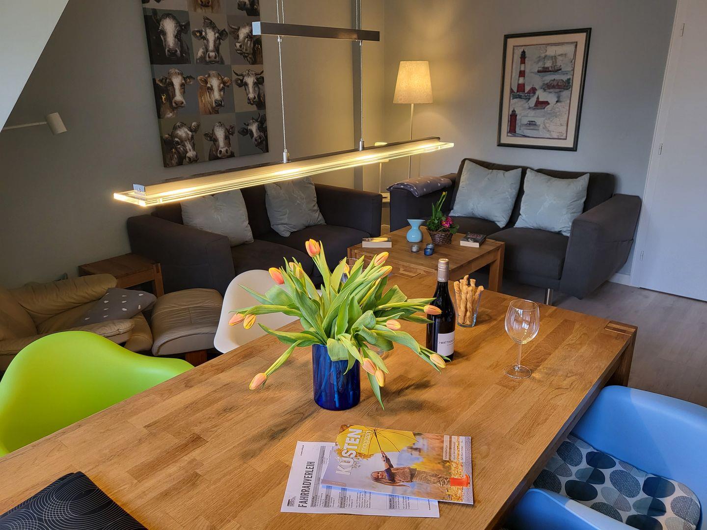 Der Wohnraum ist eingerichtet mit einer gemütlichen Sitzecke, Esstisch für 4 Personen sowie Flachbild-TV und Musikanlage. Kostenfreies W-LAN ist vorhanden.