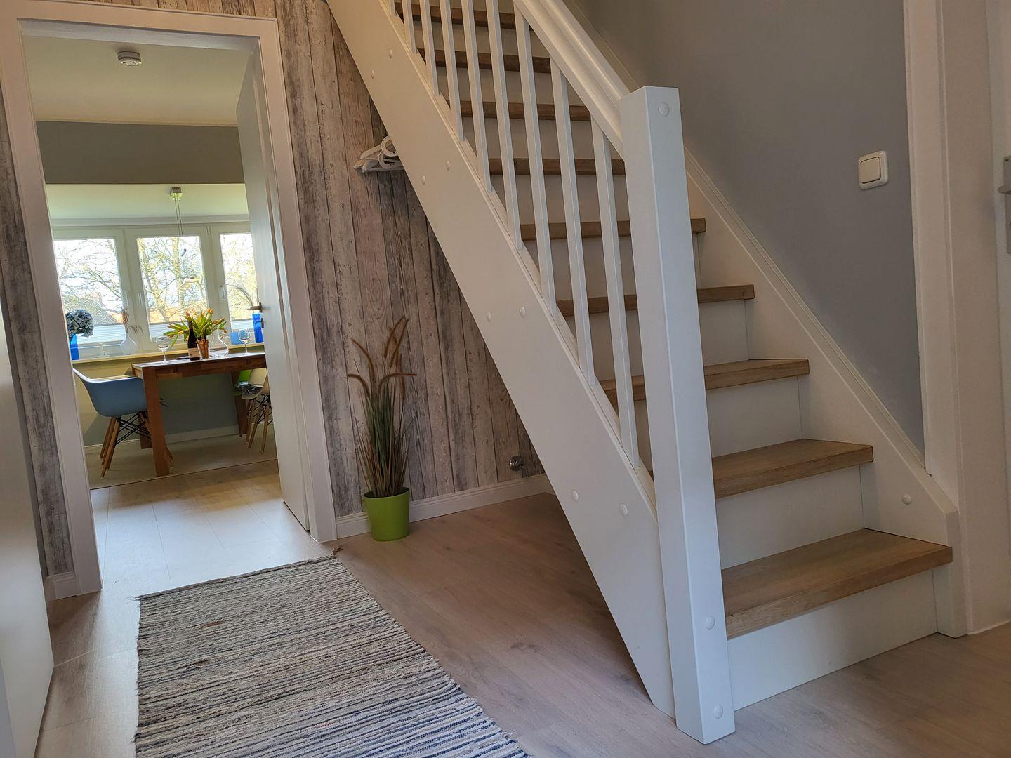 Die 63m² große Ferienwohnung für bis zu 4 Personen liegt im Obergeschoss und erstreckt sich über zwei Ebenen.