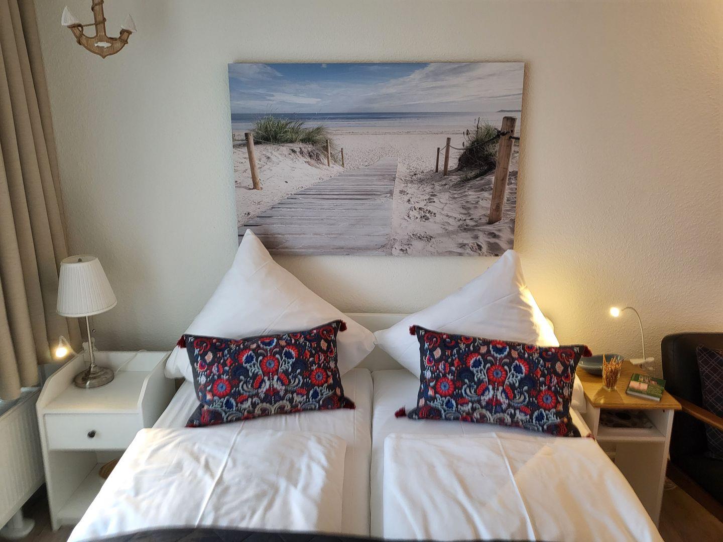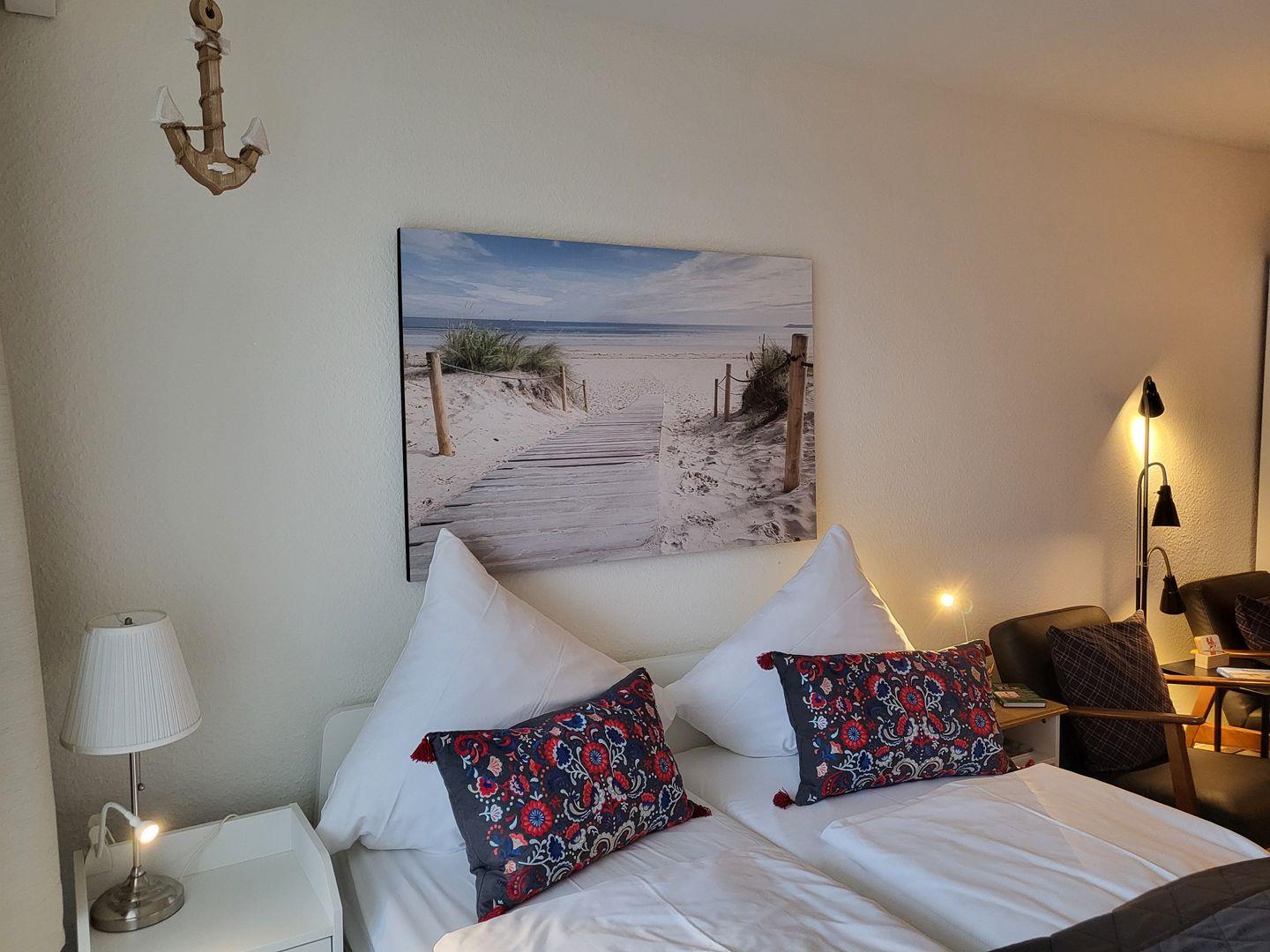 Zentral gelegene 1-Zimmer Ferienwohnung im 2. OG mit Balkon zur Landseite für 2 Personen. Ausgestattet mit Doppelbett, Kochnische, Flachbild-TV und Duschbad mit WC.