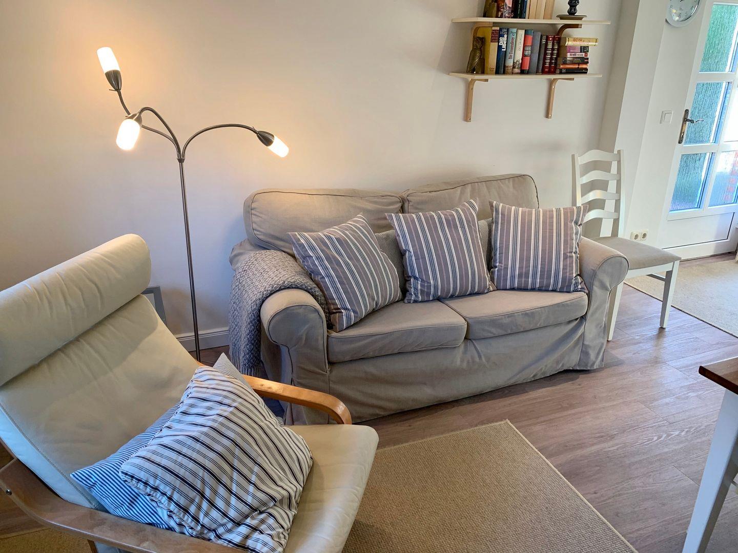Moderne 3-Zimmer Ferienwohnung mit Terrasse und Garten. Ausgestattet mit hellem Wohnraum, separatemSchlafzimmer mit Doppelbett,