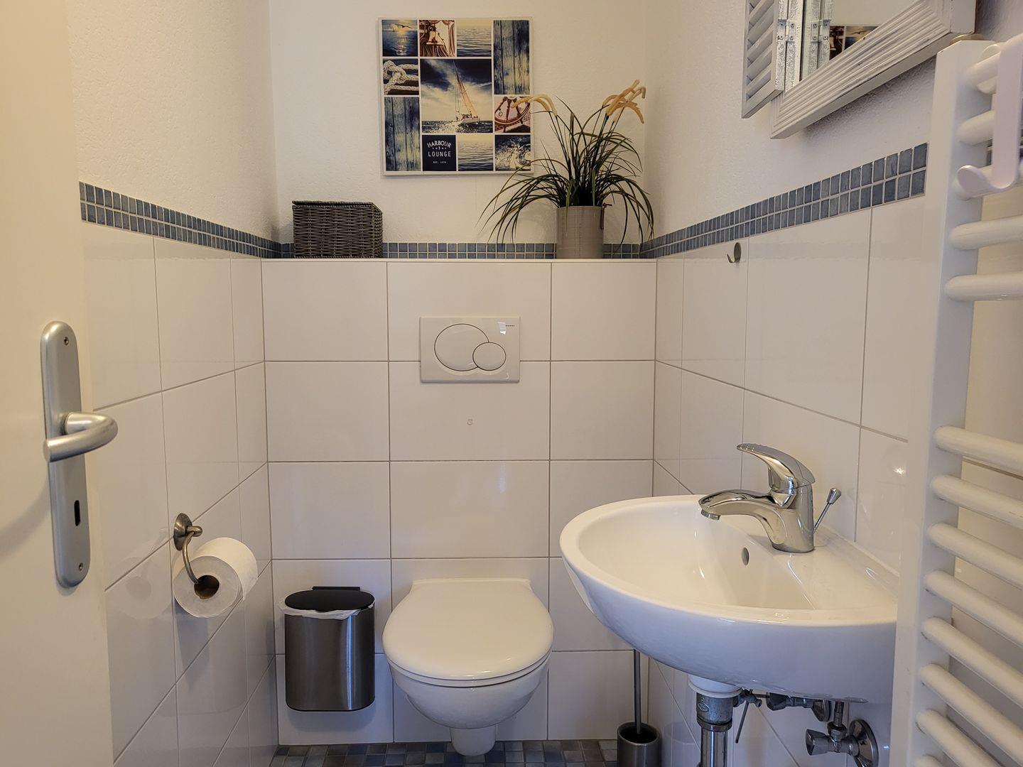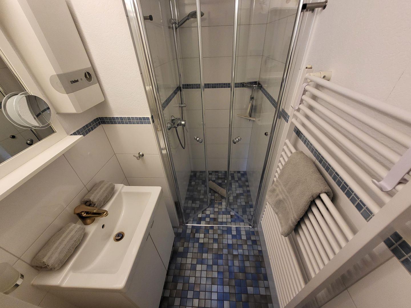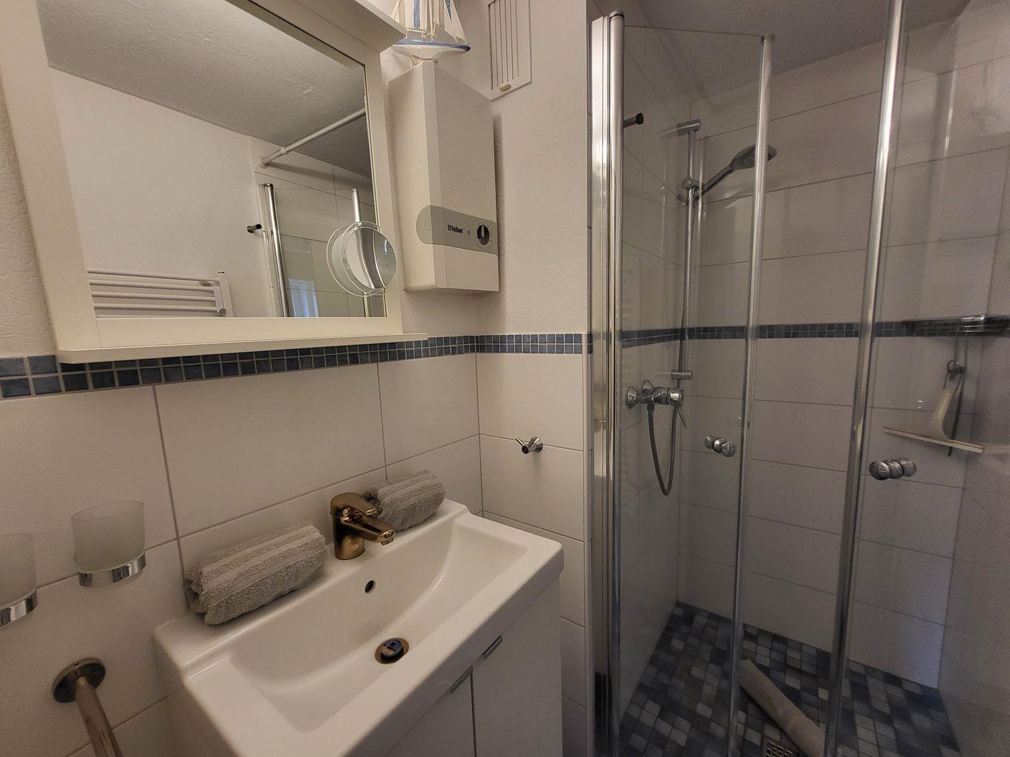 Weiterhin gehört ein modernes Badezimmer mit bodengleicher Dusche sowie ein separates WC zur Ausstattung. In dem Appartement gibt es einen Abstellraum, in dem Kinderreisebett und Kinderhochstuhl, sowie Staubsauger, Putzutensilien, Wäscheständer und Bügeleisen deponiert sind.