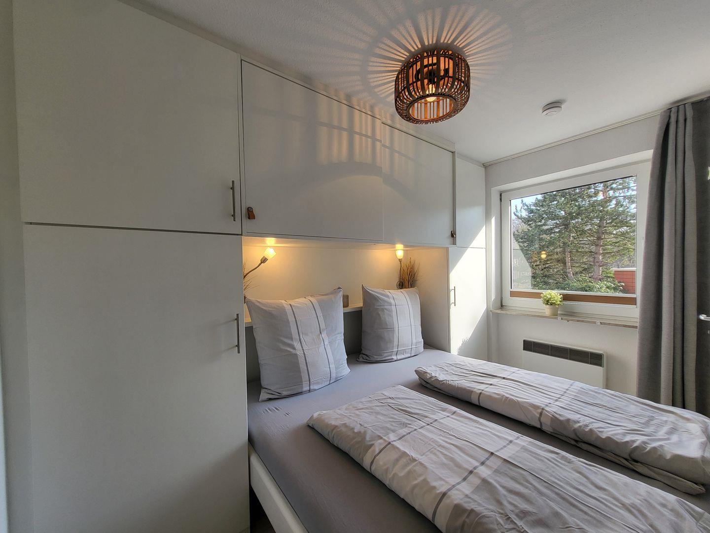 Zur Ferienwohnung gehören 2 Schlafzimmer. Eines ist eingerichtet mit einem Einzelbett, dass via Bettschublade auf 160cm Liegefläche erweitert werden kann. Im zweiten Schlafzimmer steht ein 180x200cm Doppelbett zur Verfügung.