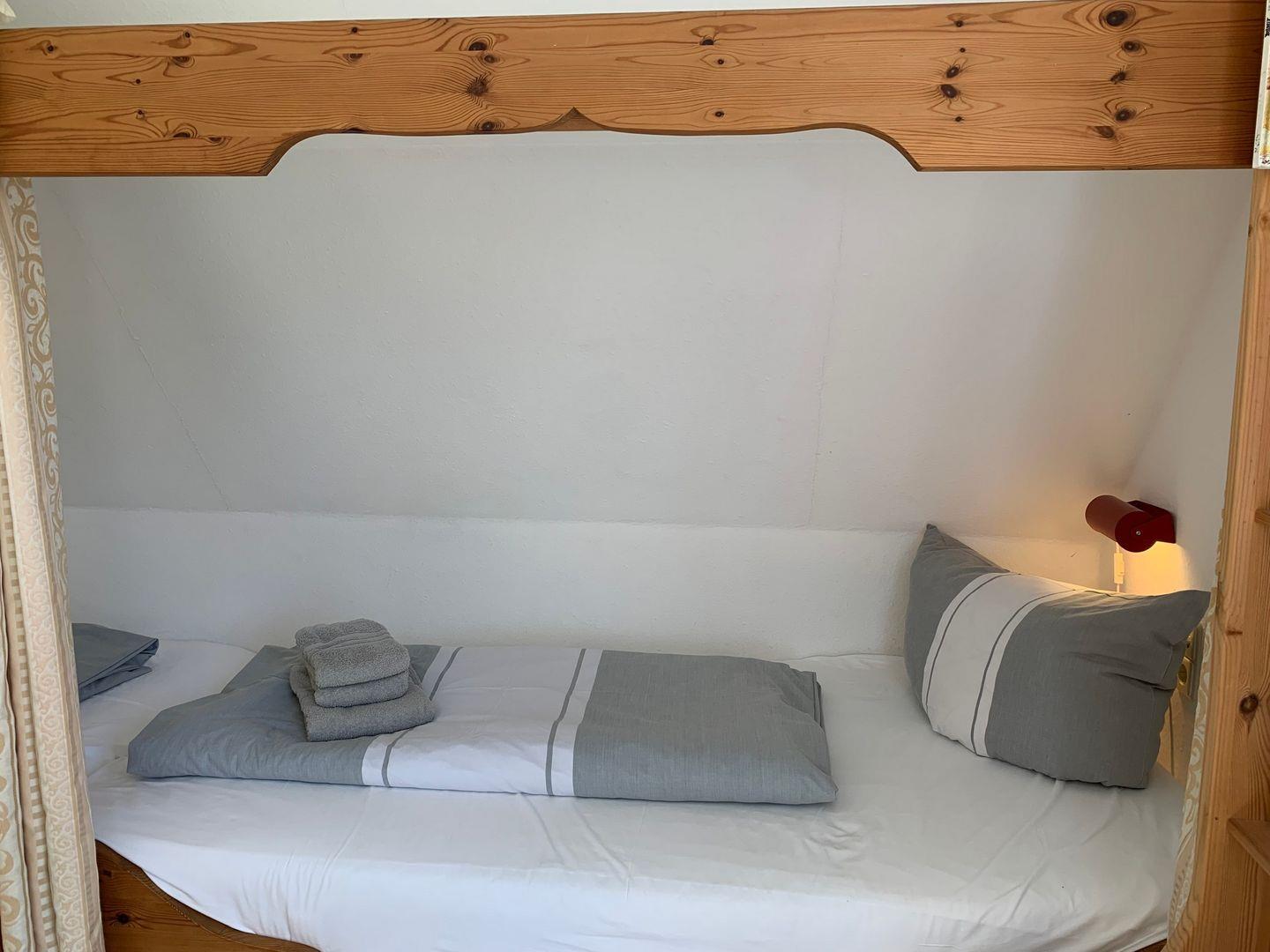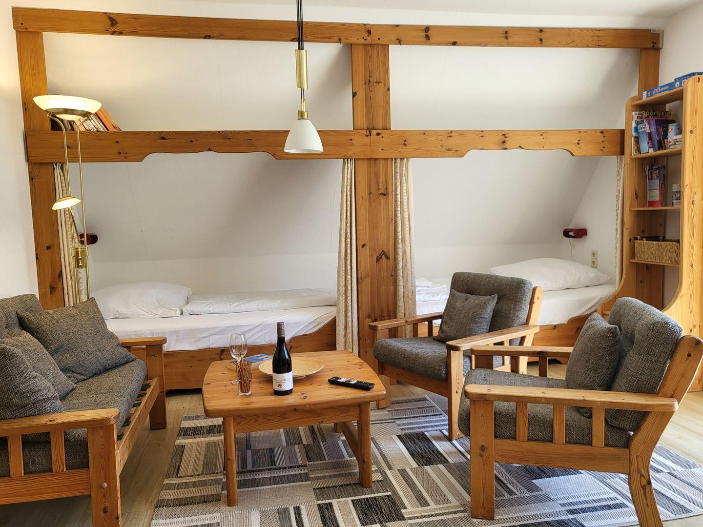 Der kombinierte Wohn-Schlafraum ist ausgestattet mit einer gemütlichen Sitzecke, dem Esstisch der Ferienwohnung und zwei Kojenbetten.