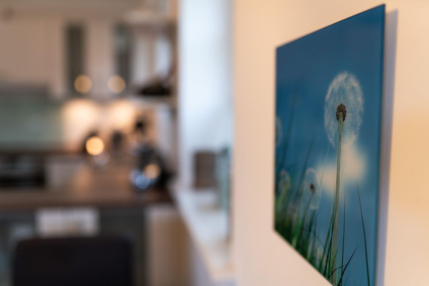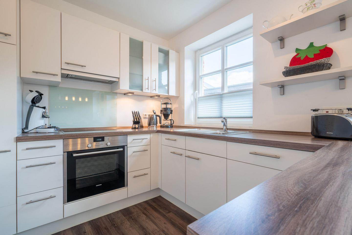 Perfekt in den Raum integriert liegt die vollumfassend ausgestattete Küche, zu deren Ausstattung unter anderem Induktionskochfeld und Backofen, ein Kühlschrank mit Gefrierfach sowie Geschirrspüler und Kaffeemaschine gehören.