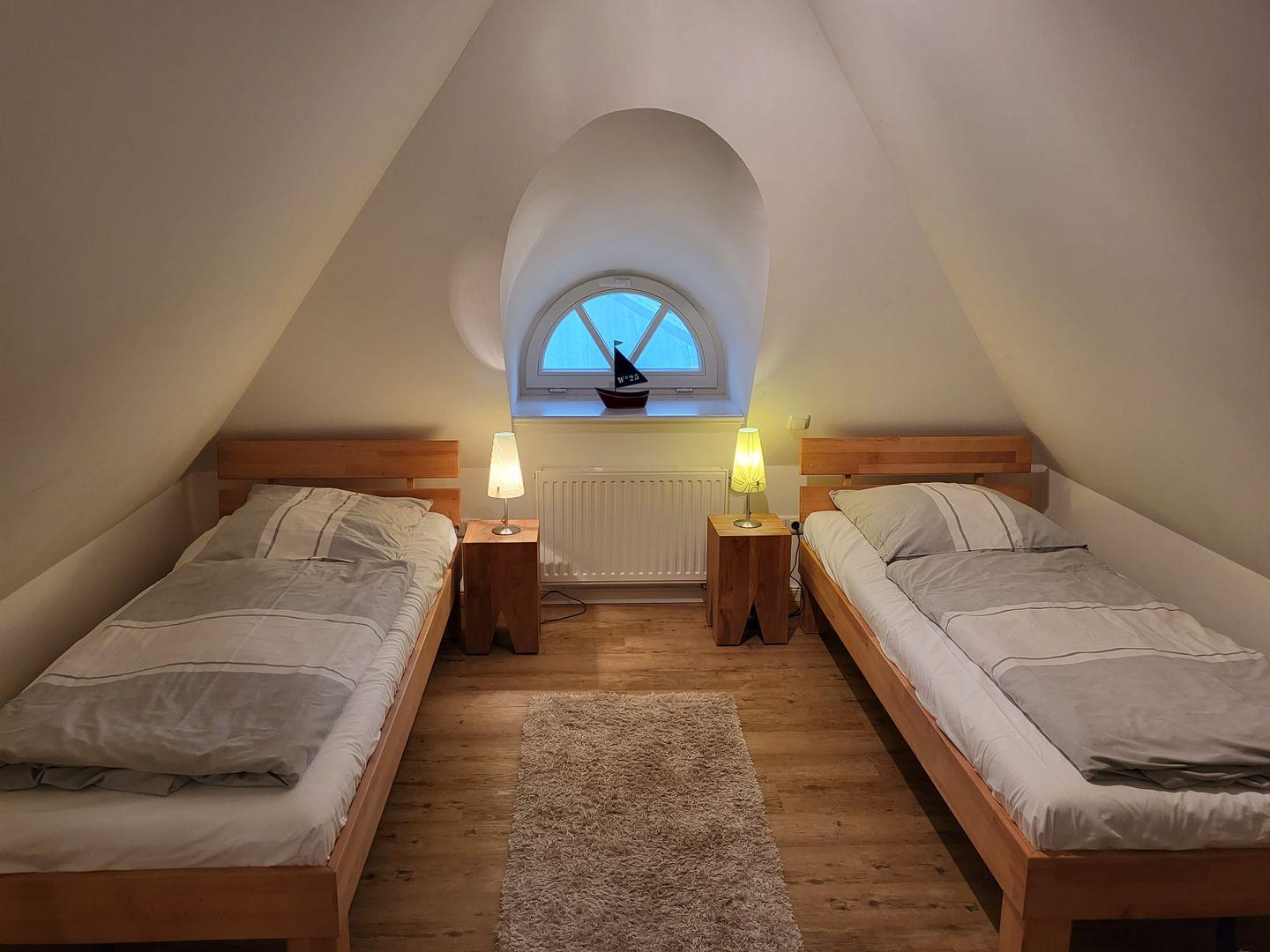 Im Dachgeschoss 2 Einzelbetten sowie Badezimmer mit Dusche, WC und Badewanne.