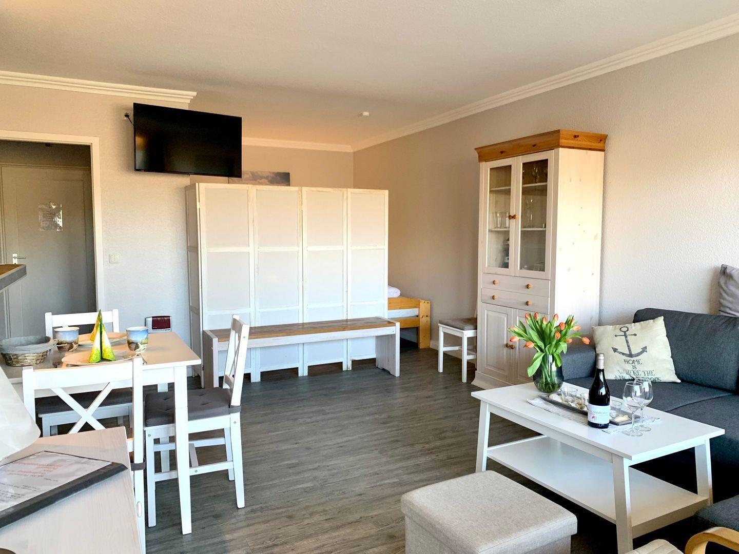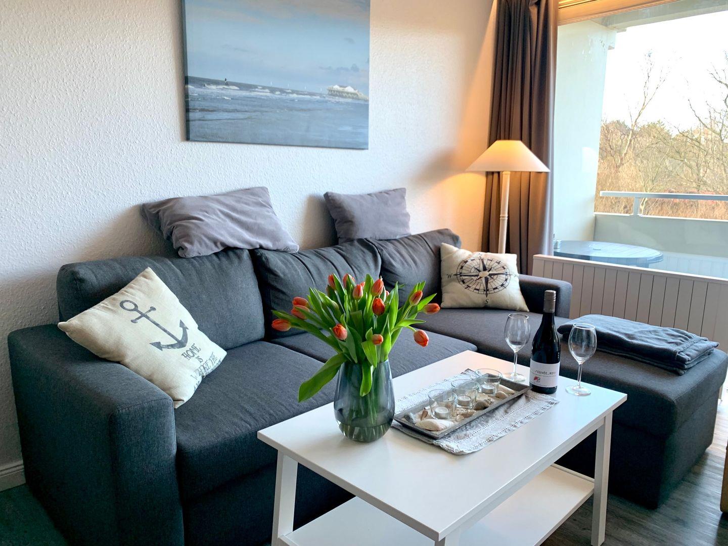Charmante 2-Zimmer-Ferienwohnung mit Balkon in St. Peter-Ording, ideal für einen erholsamen Urlaub zu dritt.