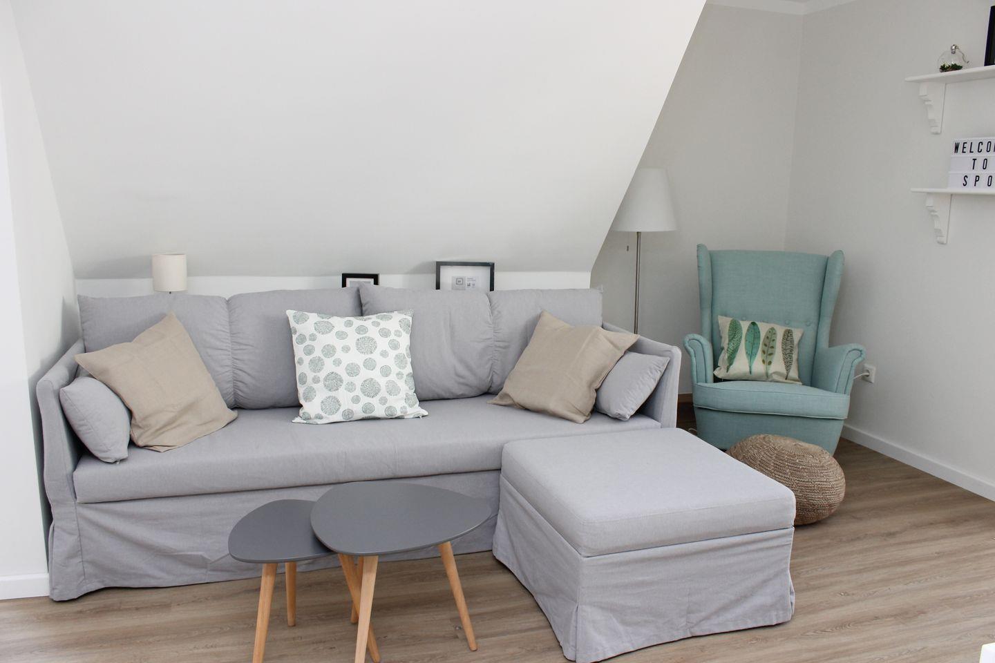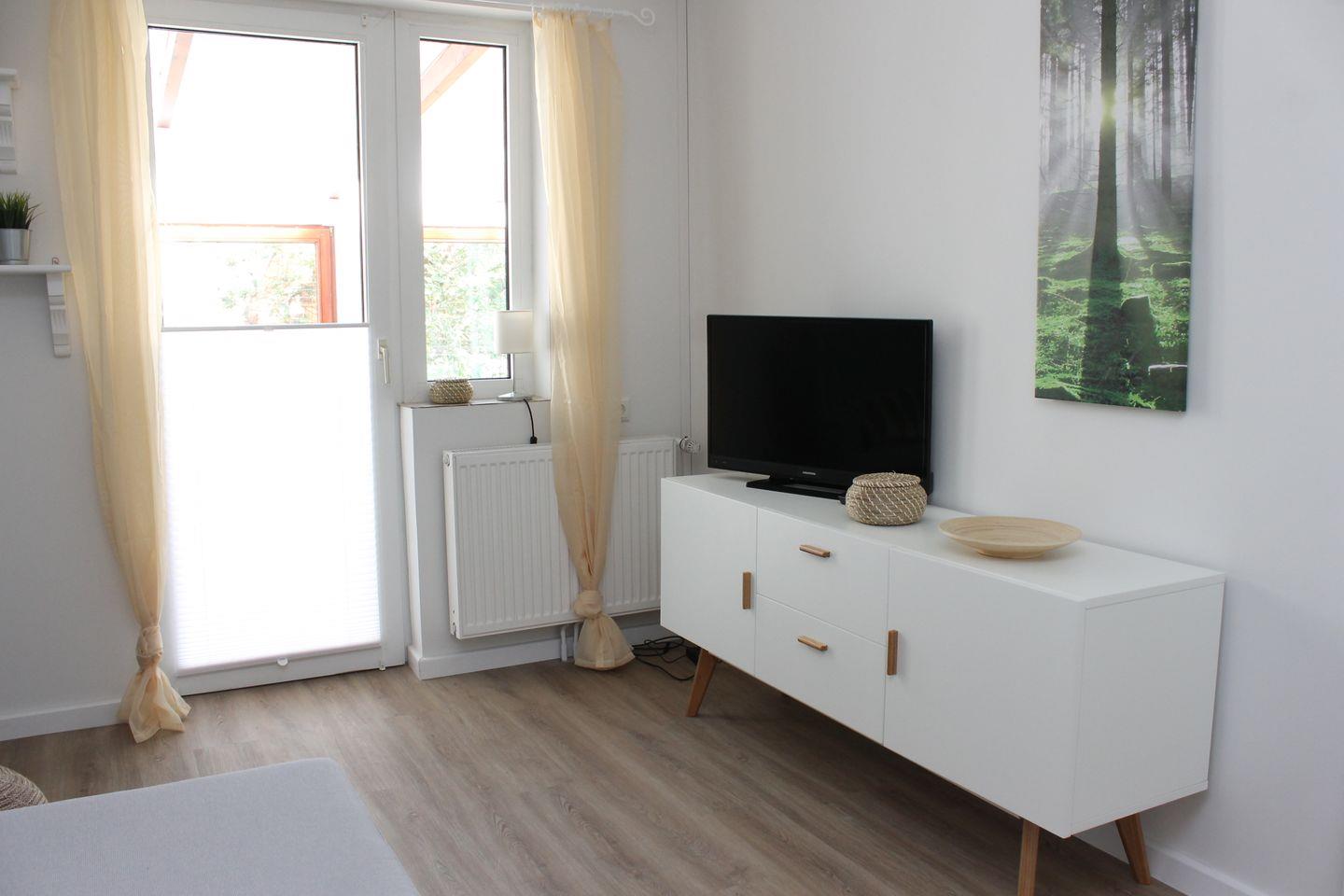 Der Wohnraum ist modern und hell gestaltet, er ist ausgestattet mit gemütlicher 120x200cm Schlafcouch, einer kleinen Essecke sowie einem Flachbild-TV.