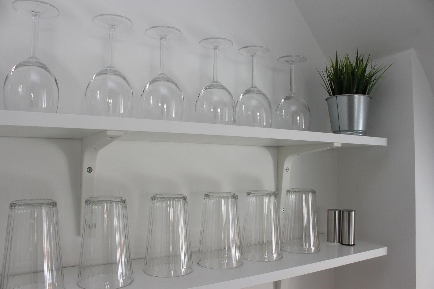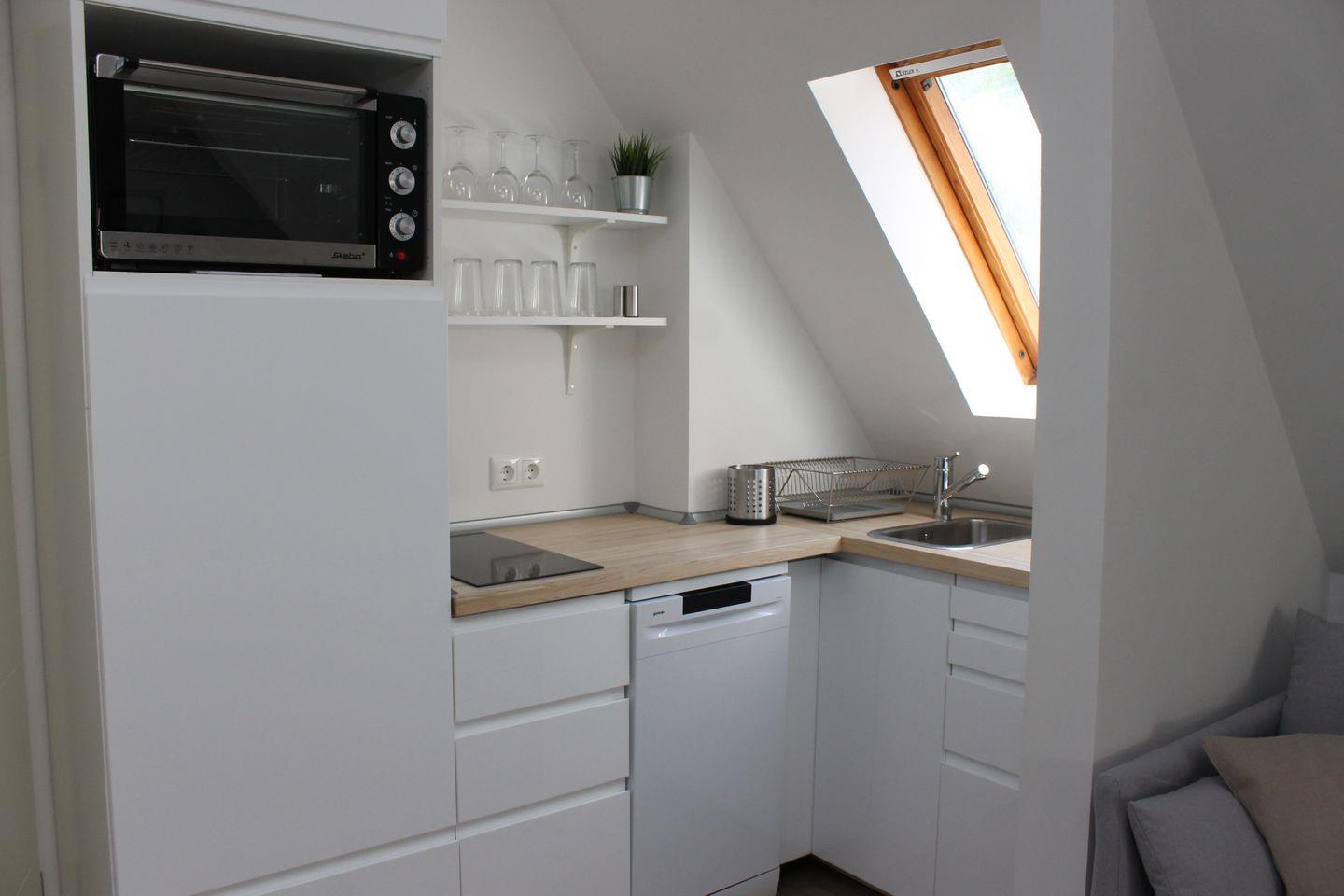 Kostenfreies W-LAN ist vorhanden. Die anliegende Küchenzeile ist gut ausgestattet und verfügt über ein kompaktes Cerankochfeld, Kühlschrank, Geschirrspüler und Kaffeemaschine.