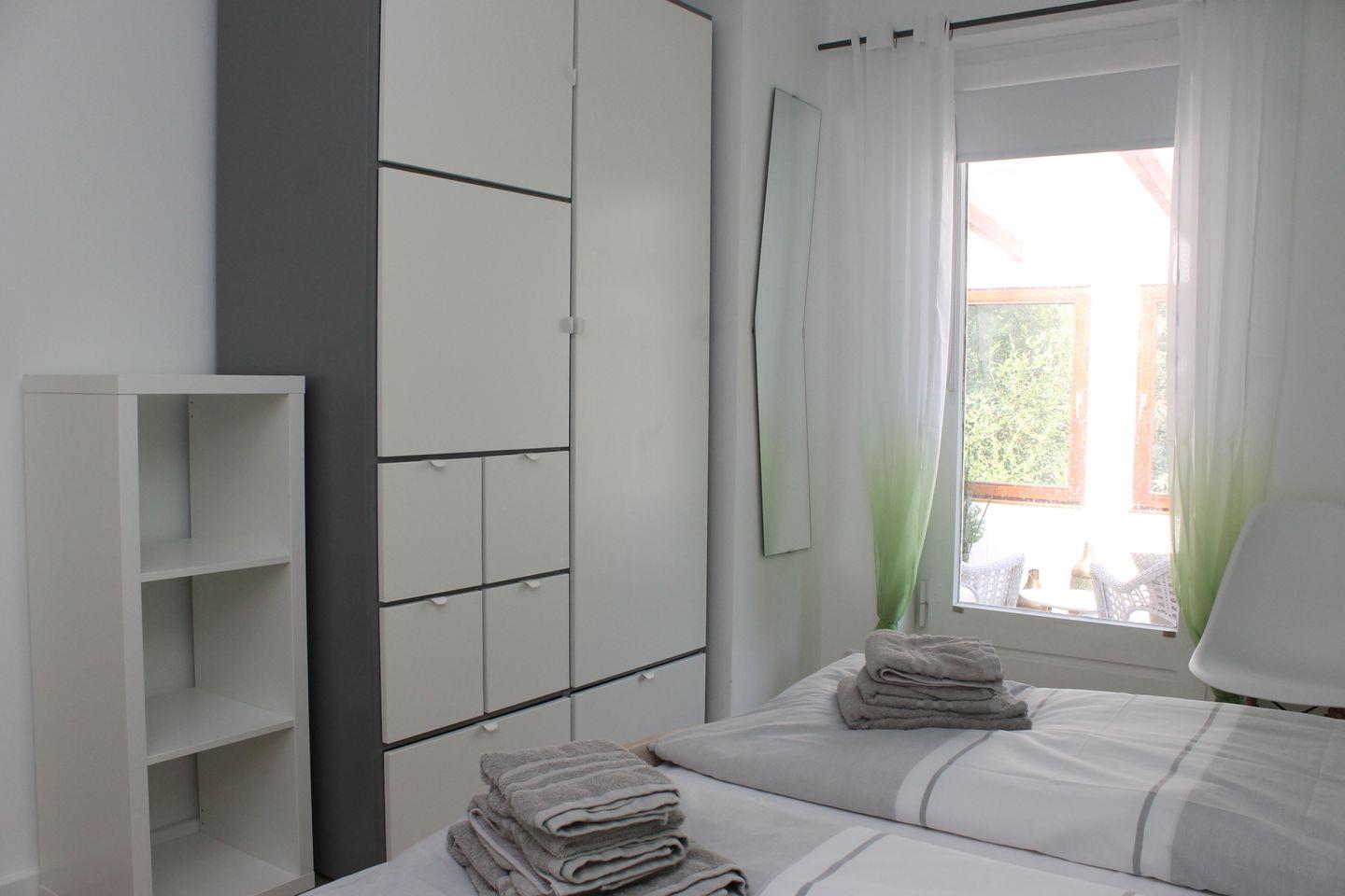 Das separate Schlafzimmer verfügt über ein großzügiges 180x200cm Doppelbett. Die Ferienwohnung ist ausgestattet mit Duschbad und WC.