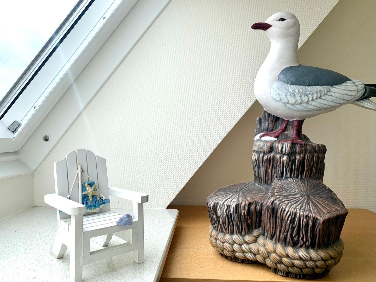 Das Dachgeschoss bietet vom dritten Schlafzimmer, ausgestattet mit Doppelbett auf offener Galerie, eine Dachloggia mit traumhaftem Blick auf den Ordinger Strand.