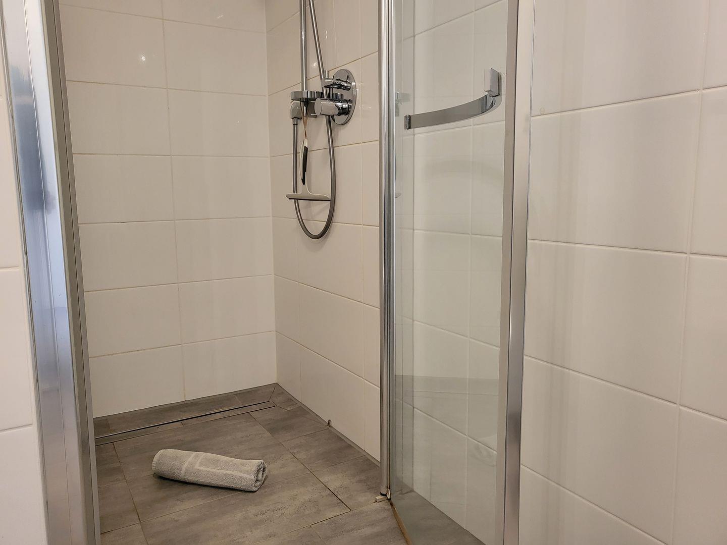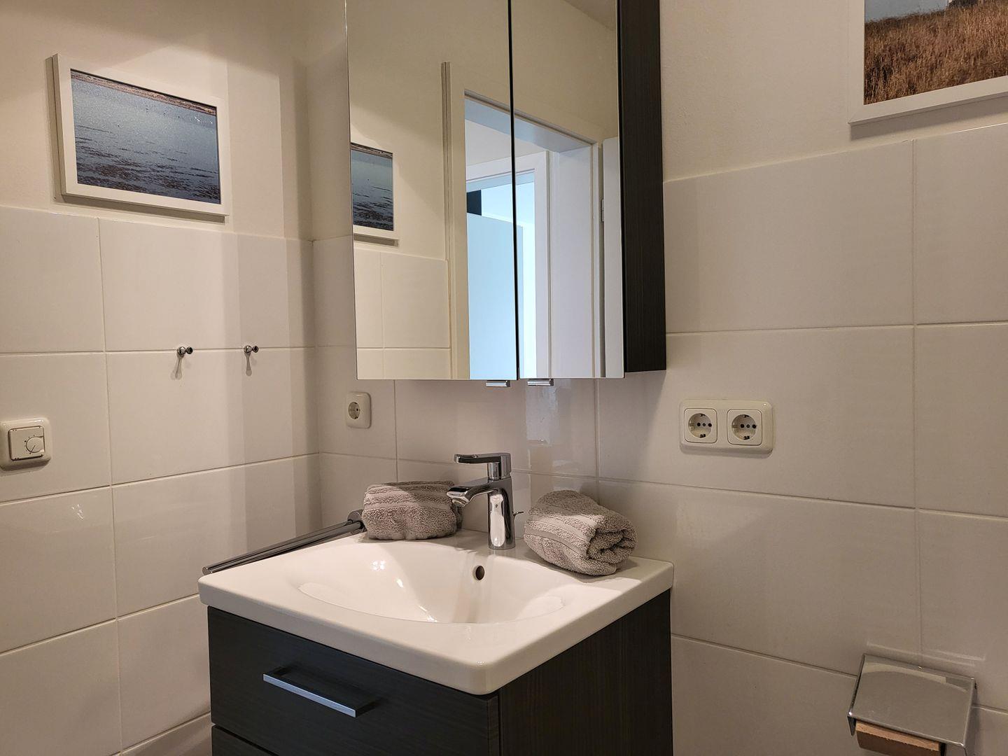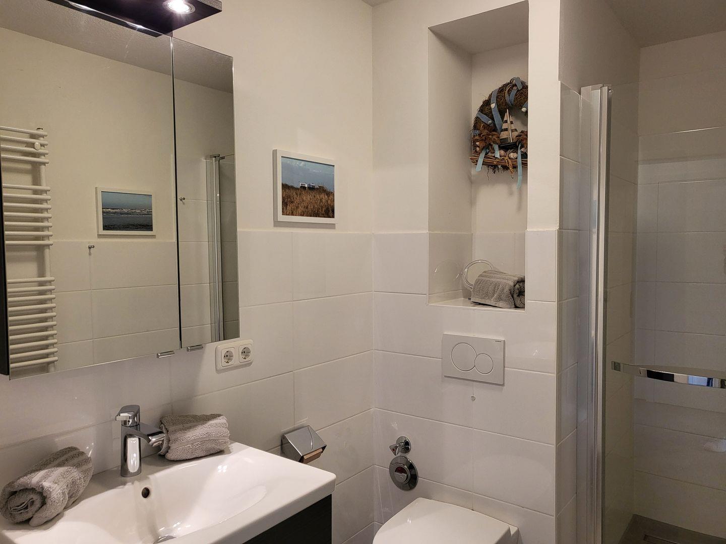 Zur Ferienwohnung gehört ein Badezimmer mit bodengleicher Dusche und WC.