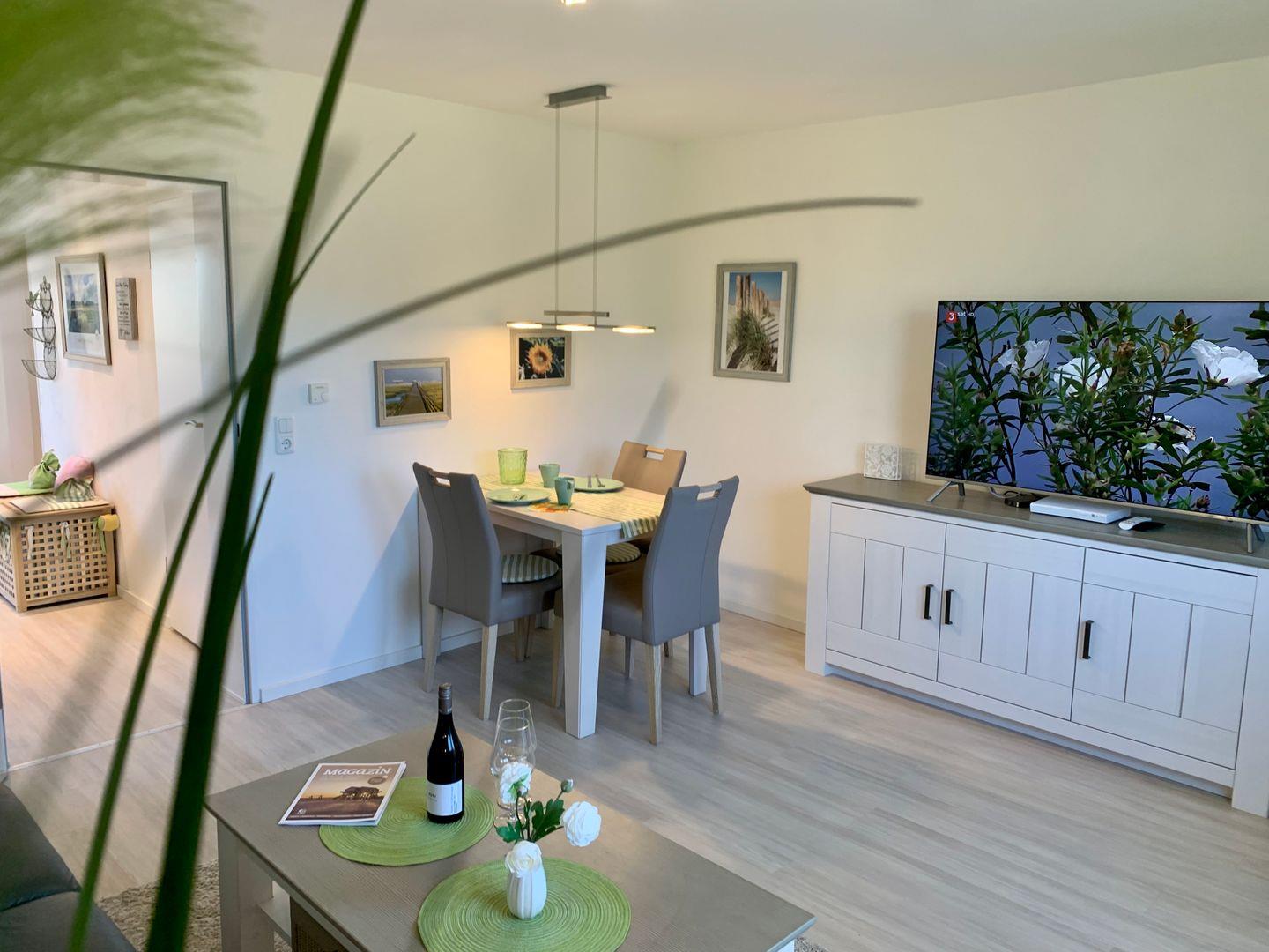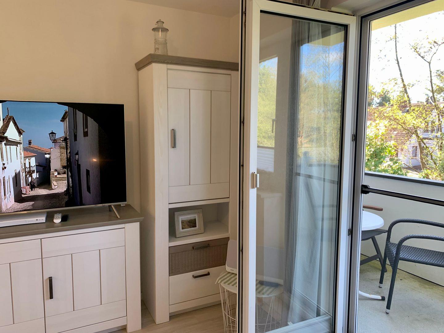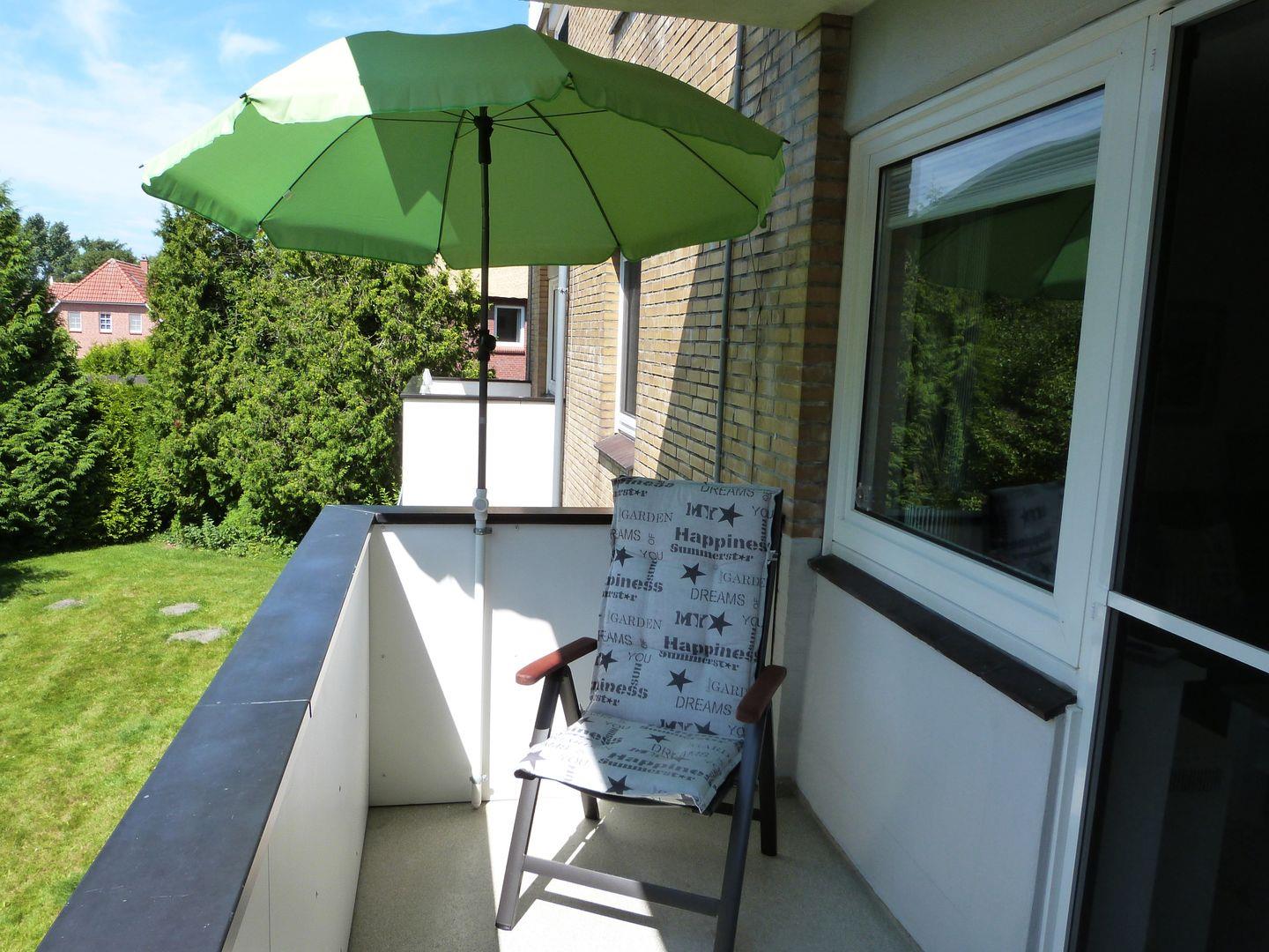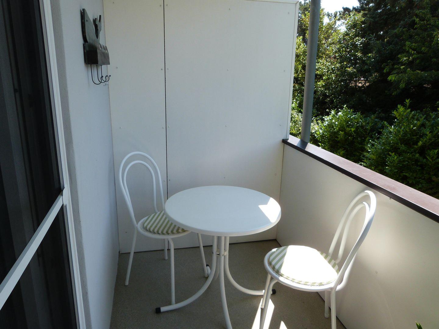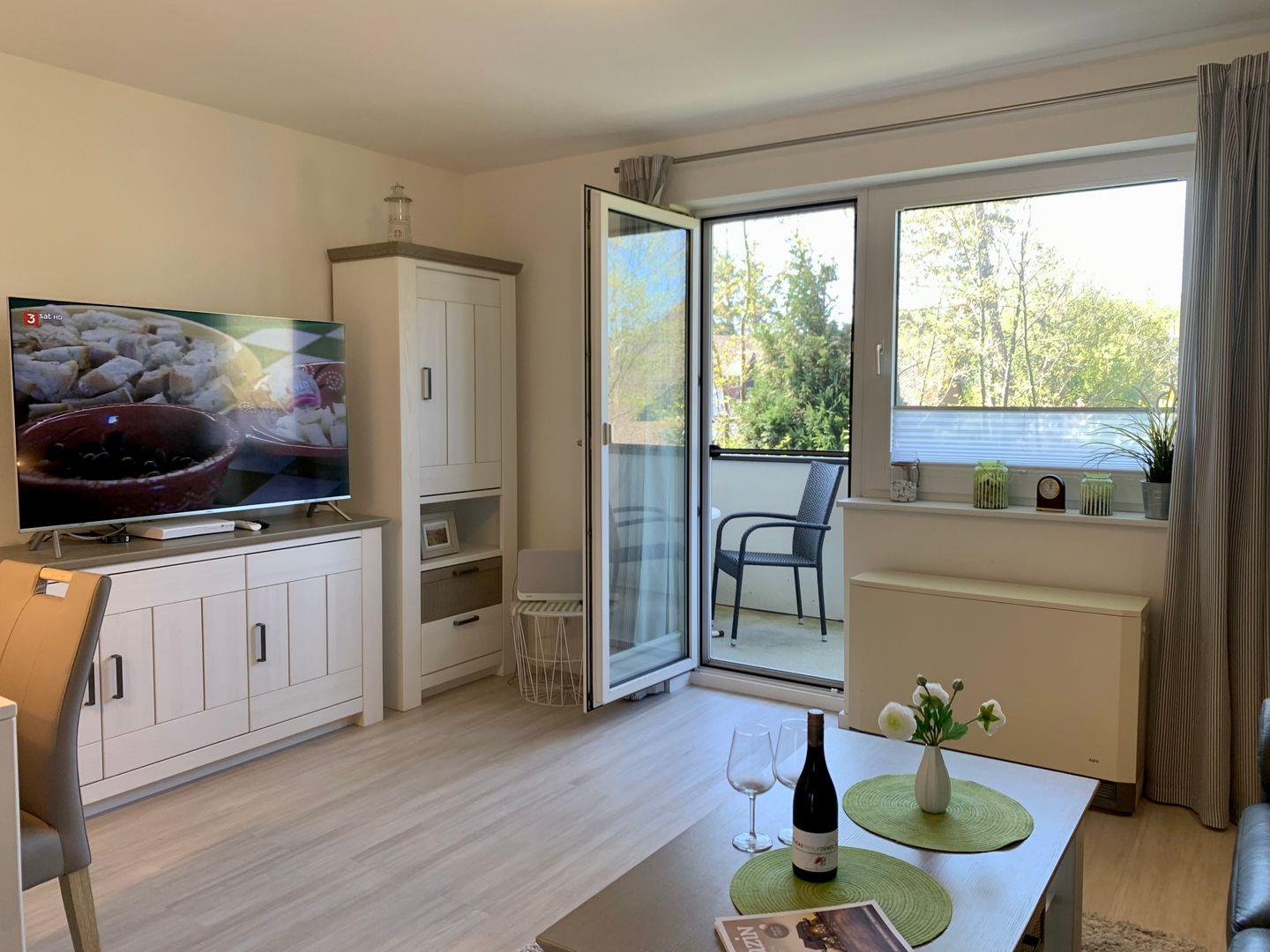 Zur Ferienwohnung gehört ein möblierter Balkon. Das modern und liebevoll eingerichtete Wohnzimmer ist ausgestattet mit einer edlen Ledercouch, der gemütlicher Esstischgarnitur sowie einem Flachbild-TV.