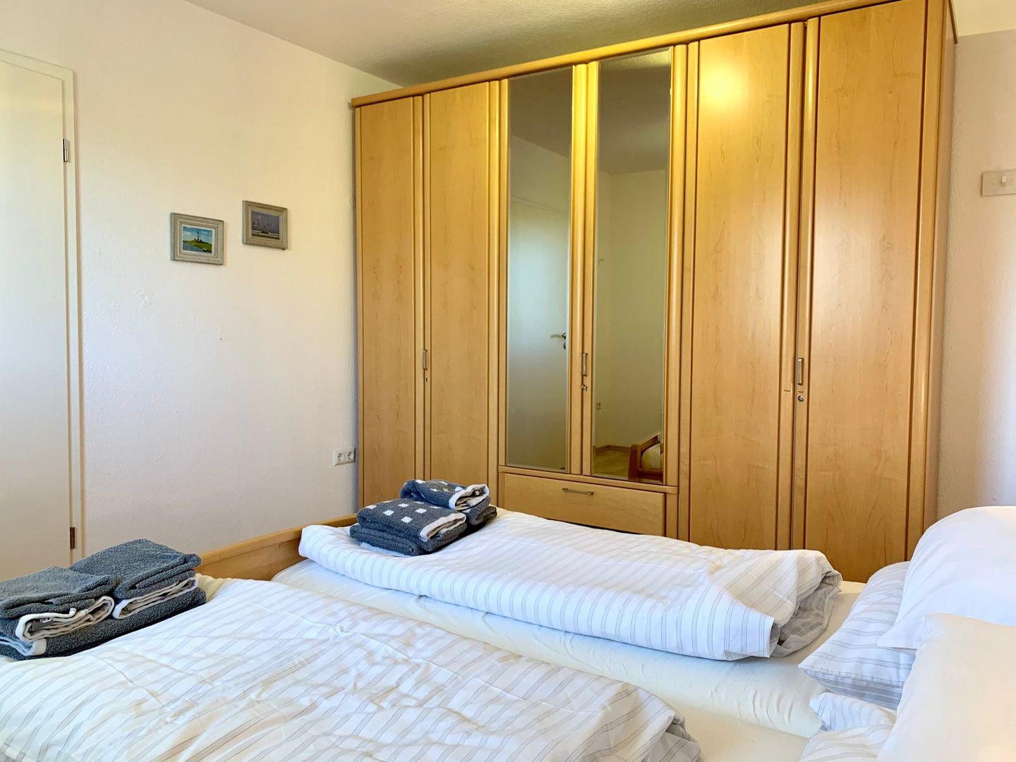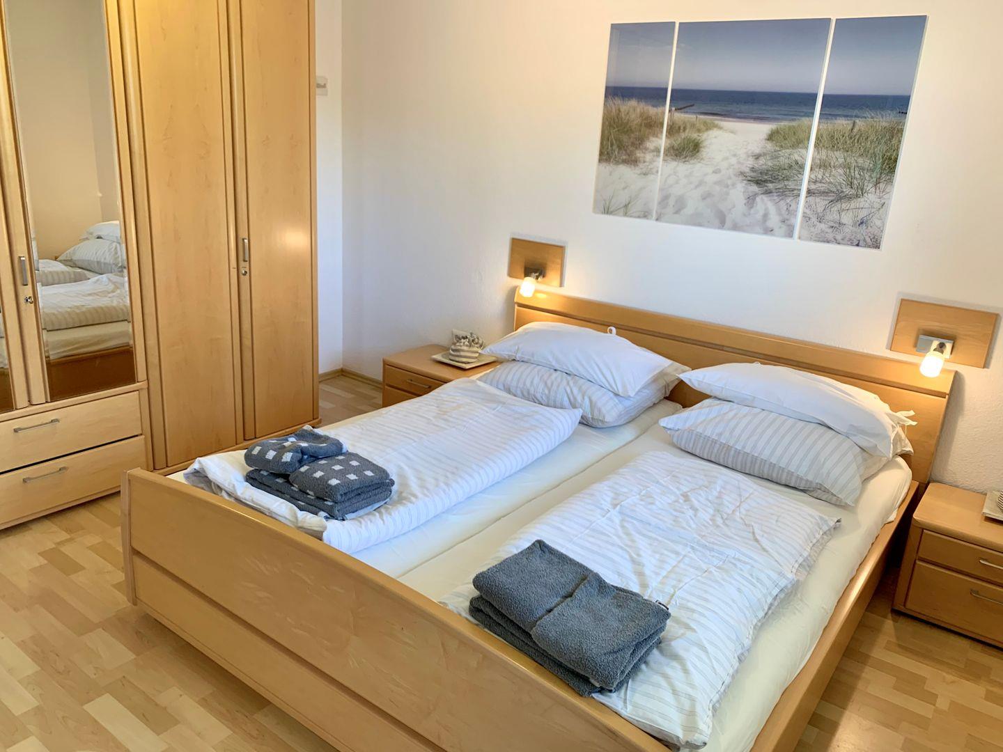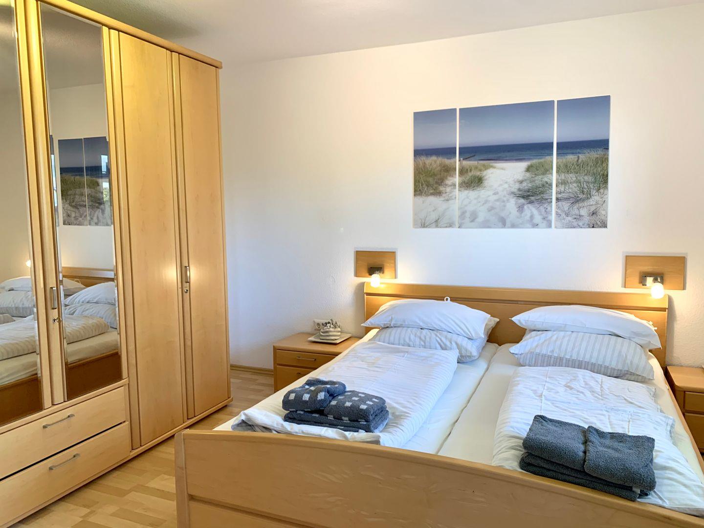 Das moderne Schlafzimmer ist mit großem 180x200cm Doppelbett und geräumigem Kleiderschrank ausgestattet. Zur Ferienwohnung gehört ein Duschbad mit WC.