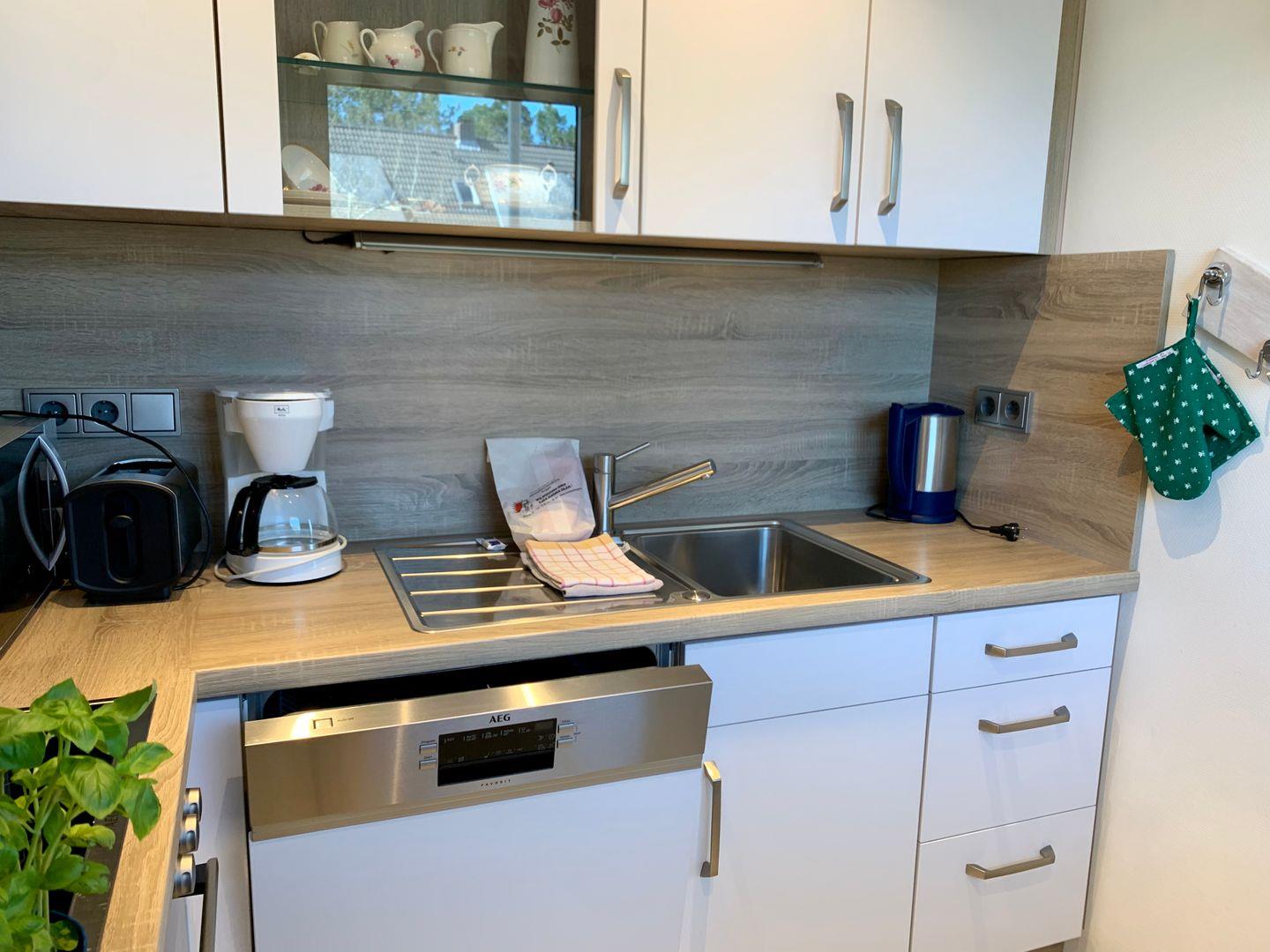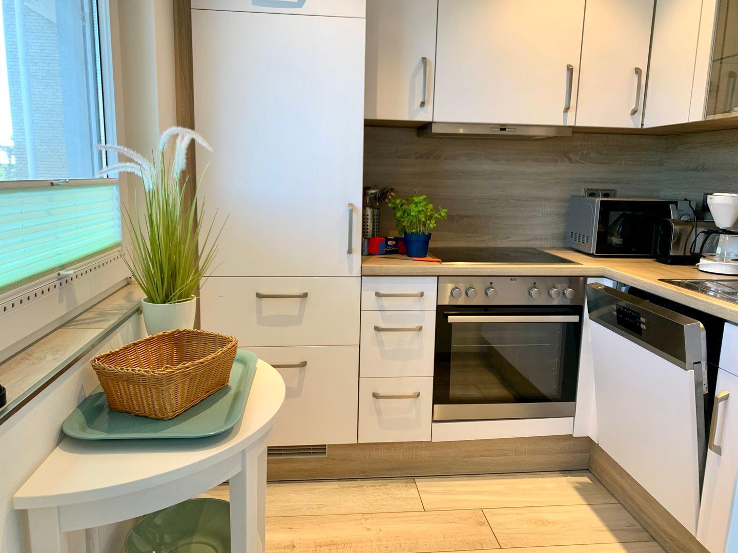 Die separate Küche ist sehr gut ausgestattet und verfügt unter anderem über Cerankochfeld und Backofen, Kühlschrank mit Gefrierfach sowie Geschirrspüler und Kaffeemaschine.